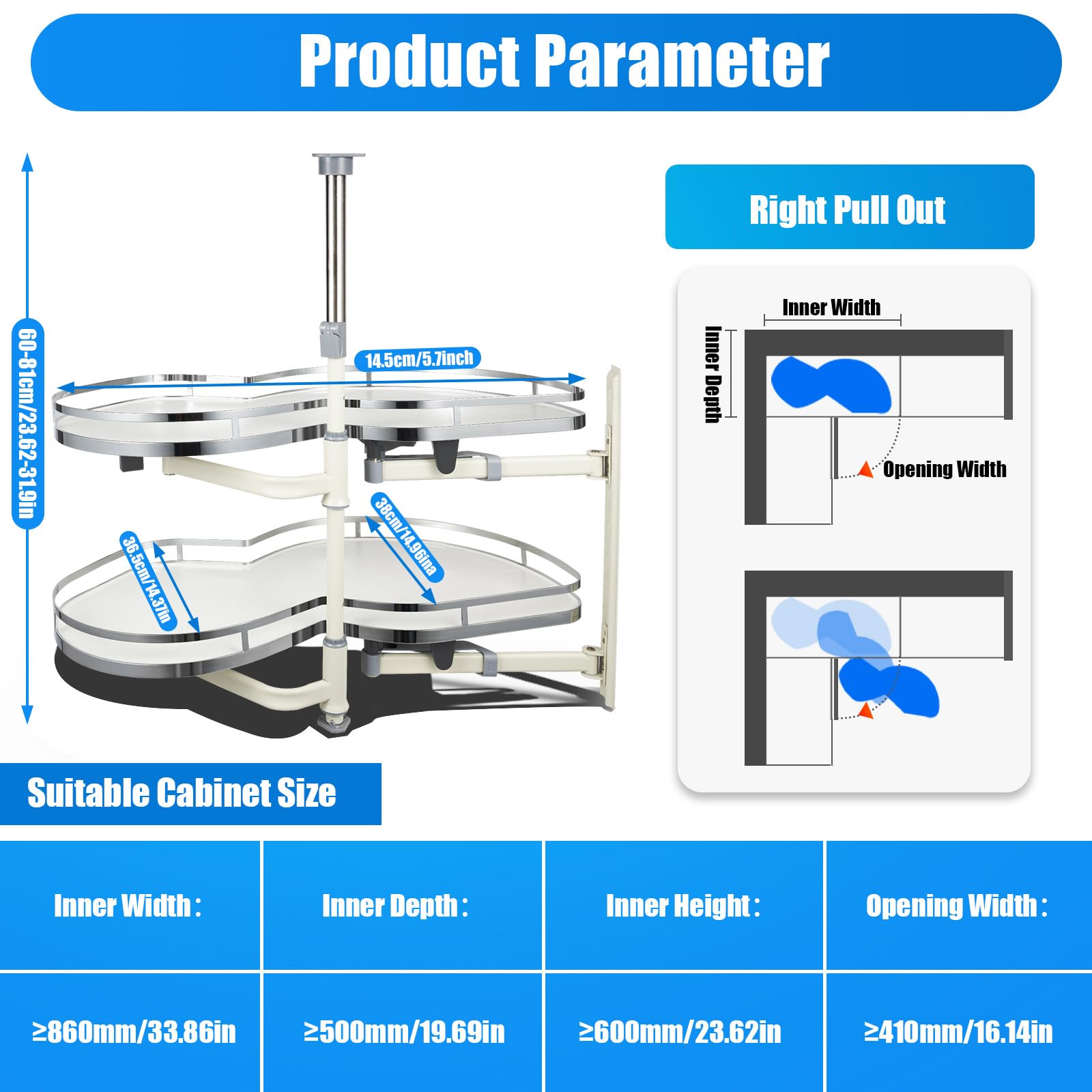 Le garde-rail de 1,77 pouces peut efficacement empêcher les objets de tomber. Plateau Tournant Meuble d'angle Cuisine | Bricozor Description Êtes-vous toujours inquiet de gaspiller de l'espace de cuisine et d'avoir trop de mal à obtenir votre ustensile de cuisine? Cet organisateur de coin tirable peut bien résoudre votre problème. En outre, vous pouvez ajuster la hauteur de chaque plateau en fonction des ustensiles de cuisine, répondant à votre besoin de stockage efficace et organisé. La organiseur d'angle coulissant conception tirable est plus pratique pour les personnes âgées, les enfants, les femmes enceintes et les personnes obèses qui ont de la difficulté à se plier. 【Conception conviviale】: Un dispositif d'amortissement pneumatique peut rendre le plateau plus lisse et silencieux. Le grand espace double couche vous permet de stocker plus d'articles et d'utiliser efficacement l'espace de l'armoire. VEVOR Plateau Tournant à Gauche pour Meuble d’Angle Tourniquet 2 Deux grands plateaux qui balancent indépendamment vous fournissent une double couche d'espace de stockage, suffisant pour contenir divers ustensiles de cuisine et rendre votre cuisine plus propre et plus propre. Meuble d'angle est fait de matériaux de haute qualité et de l'artisanat fin, avec une bonne capacité à supporter la charge et à résister à la rouille, ce qui assure une utilisation à long terme. 【Construire pour durer】: Tourniquet cuisine est principalement en fer et sa surface est traitée par galvanoplating et procédé de chromage, qui a de bonnes propriétés étanches à l'eau, à l'huile, à la rouille et à la corrosion, de sorte qu'il peut être utilisé pendant longtemps. Plateau Tournant Epices, Plateau Pivotant Pour Rangement Cuisine, Lazy... Meuble D'angle Plateau Tournant Pour Meuble D'Angle-VEVOR-Étagère Pivotante 91,4 Cm De étagère Tournante Pour Placard Spécifications Couleur: Blanc Style: Moderne, Simplicité Type: Droite ouverte Matériel: Fer Procédé: galvanoplating, chromé Capacité maximale (chaque plateau): 15kg/33lbs Plage réglable en hauteur: 60-81cm / 23., 62-31., 9inch Taille du cabinet appropriée: ≥860mm/33., 86inch (largeur intérieure), ≥500mm/19., 69inch (profondeur intérieure), ≥600mm/23., 62inch (hauteur intérieure), ≥410mm/16., 14inch (largeur d'ouverture) Hauteur de garde-rail: 4., 5cm / 1., 77inch Chaque longueur de plateau: 80cm / 31., 5inch Chaque largeur du plateau: 38cm / 14., 96inch, 36., 5cm / 14., 37inch Taille de l'emballage: 84 * 44 * 22,5 cm / 33,07 * 17,32 * 8,86 pouces Poids net: 10., 4kg / 22., 93lbs Poids brut: 11., 6kg / 25., 57lbs Paquet inclus 1 x Organisateur de coin tirable 1 x Instructions d'installation en anglais Autres accessoires pour l'installation
