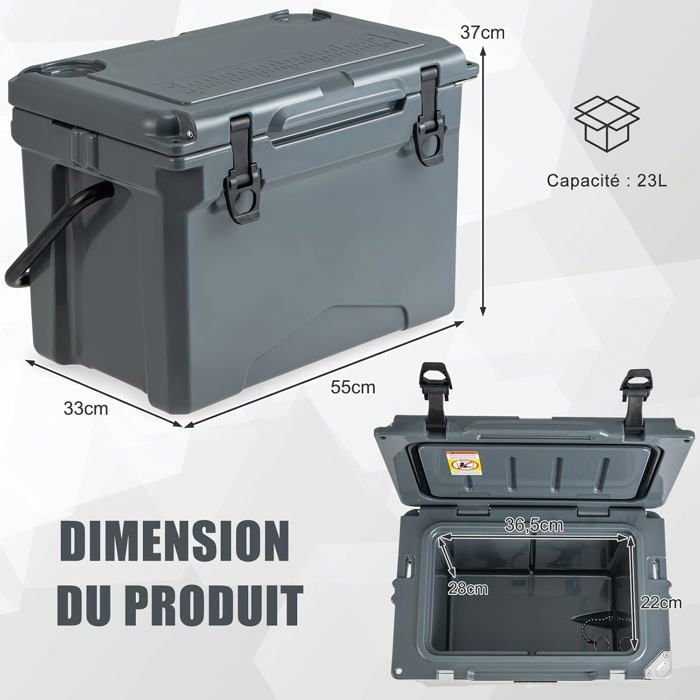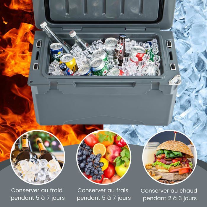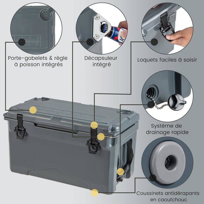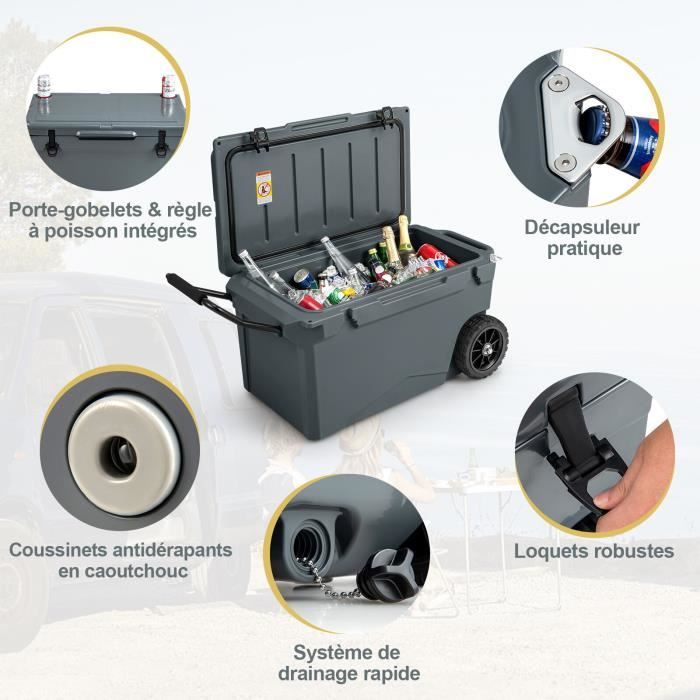 De plus, elle comprend un ouvre-bouteille intégré, des porte-gobelets et une règle à poisson pour plus de commodité. CAO Glacière rigide passive à roulette pour camping Les poignées en nylon robustes facilitent le transport et vous pouvez même l'utiliser comme siège lorsque vous avez besoin d'une pause. # Matériau Durable et Cadre Stable # Fabriqué à partir de LLDPE et de polyuréthane robustes, ce refroidisseur d'extérieur est durable pour résister facilement à toutes les conditions météorologiques, tandis que les patins en caoutchouc antidérapants améliorent la stabilité pour une utilisation sans souci. Et les loquets faciles à saisir et le joint de style congélateur assurent une étanchéité sécurisée. Glacière Avec Décapsuleur GYMAX Glacière Rigide Portable à Roulettes 71 L, Glacière Isolée Avec Patins Antidérapants, 2 Poignées, Porte-Gobelet, Règle à Poisson, Trou De Vidange, Pour Randonné, Camping, Voyages, Pêche (Gris Glacière Avec Porte-gobelets Décapsuleur Avec sa capacité spacieuse, cette glacière rigide à roulettes est parfaite pour une variété d'activités de plein air, telles que le camping, les pique-niques et la pêche. # Large Application # Au-delà du camping, cette glacière isolée polyvalente est parfaite pour la pêche, les pique-niques, les journées à la plage, et plus encore. # Détails Plus Réfléchis # Cette glacière rotomoulée est conçue avec un ouvre-bouteille intégré, des porte-gobelets et une règle à poisson intégrée, ce qui offre une grande commodité pour votre expérience en plein air. Caractéristiques : Isolation exceptionnelle garde les boissons froides pendant 5 à 7 jours Transportez-le facilement grâce à des poignées pratiques pour la portabilité Construction durable en LLDPE et polyuréthane pour la longévité Patins en caoutchouc antidérapants améliorent la stabilité pendant l'utilisation Glacière polyvalente adaptée au camping, aux pique-niques et aux sorties à la plage Ouvre-bouteille et porte-gobelets intégrés pour plus de commodité Règle à poisson intégrée pour les amateurs de pêche en plein air Loquets faciles à saisir et le joint de style congélateur assurent une étanchéité sécurisée Conçu pour un nettoyage facile avec un système de drainage rapide Spécification : Couleur : Gris/Kaki Matériau : LLDPE, Polyuréthane, Nylon, Caoutchouc Dimension du produit : 69 x 37 x 42 cm (L x l x H) Dimensions intérieures : 56 x 28 x 33 (L x P x H) Temps de stockage complet de la glace : 5 à 7 jours Capacité : 47 L Capacité de poids : 100 kg Poids net : 10 kg Livraison : 1 x Glacière 1 x Mode d'emploi Glacière Isotherme Portable 47 L avec Bouchon de Vidange et Porte-gobelets(Brun Clair) - Gamm vert # Glacière Rotomoulée Haute Performance # Cette glacière rigide rotomoulée présente une isolation exceptionnelle, vous permettant de déguster des boissons glacées. COSTWAY Glacière Isotherme Portable avec Bouchon de Vidange et Porte...