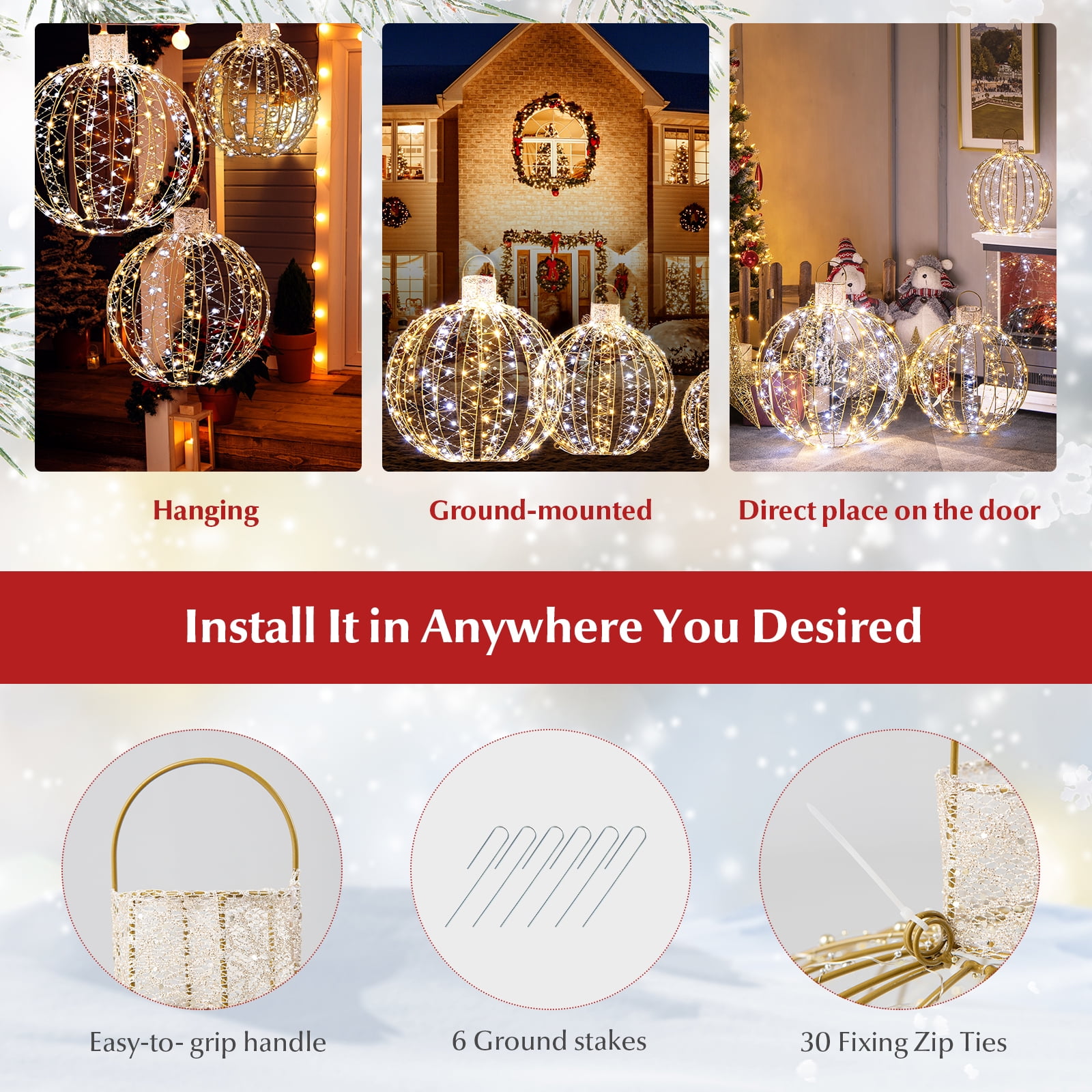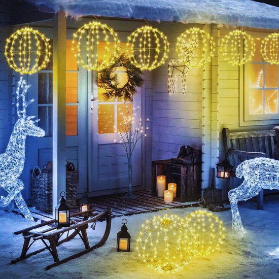 Lot de 3 boules lumineuses (LED) à planter - ECLOZ - Gamm vert Grâce au bouton sur le compartiment à piles ou à la télécommande, vous pouvez facilement créer l'atmosphère parfaite pour toutes les occasions, par exemple, vous pouvez décorer des arbres, des vérandas, des jardins, des terrasses, des cafés ou n'importe quelle zone de votre maison. Boules LED 31 Cm 8 Modes Éclairage De Noël D'extérieur Avec Minuterie - 120 Ampoules LED - 8 Modes - Étanches Etoile Lumineuse Noel Exterieur Boule lumineuse de Noël : les ensembles de lumières de boules de Noël à piles contiennent 2 ensembles de boules lumineuses d'un diamètre de 31 cm, alimentées par 3 piles AA (piles non incluses) et disposent de 120 LED blanc chaud, l'effet de lumière est lumineux. Elles peuvent résister à la pluie, à la neige, au gel ou à la grêle. Portable et pliable : les lumières extérieures de Noël sont livrées pré-assemblées pour l'extérieur, il suffit de les tirer doucement pour révéler une belle forme de boule, concevoir votre maison ou votre scène de fête à volonté. Ciel de lit blanc avec étoiles luineuses pour chabre de fille, 8... Lot de 3 boules lumineuses solaires jardin LED décoration de jardin C'est un éclairage de Noël idéal. Durable et étanche : ces boules lumineuses décoratives de Noël sont fabriquées à partir d'un cadre en métal robuste de haute qualité et sont étanches selon la norme IP44, le compartiment à piles est bien scellé. Les boules lumineuses de Noël extérieures assurent une beauté naturelle pendant la journée et créent une atmosphère romantique et rêveuse la nuit.