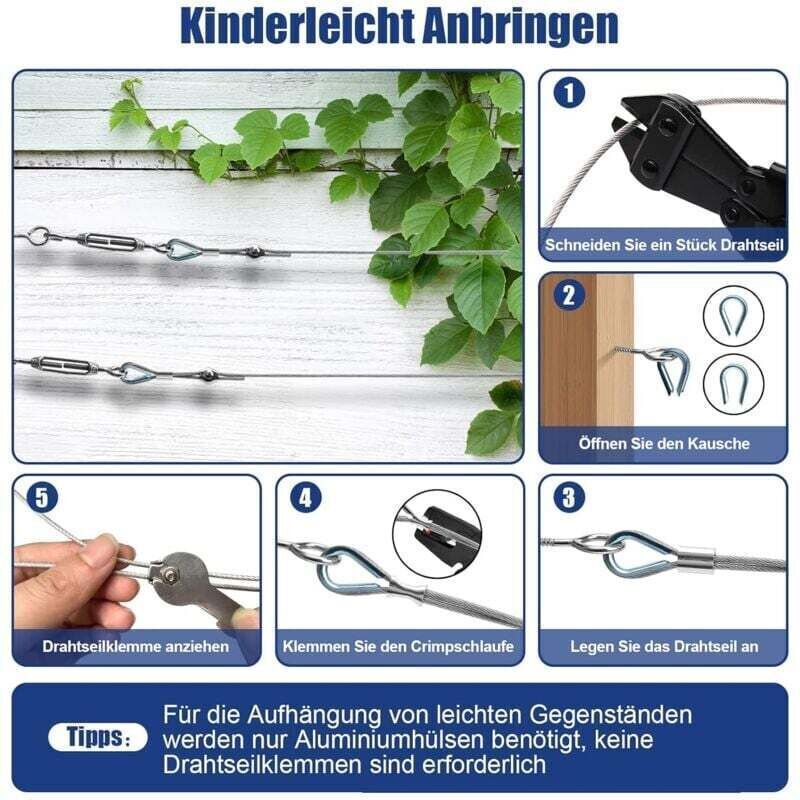Kit De Câble Métallique En Acier Inoxydable De 50 M/2 Mm Avec Tendeur De Fil Robuste M5 Kit De Rouleau De Fil De Cloture Kit De Garde Corps De Cable Tendeurs De Fil De Jardin Pour Plantes Grimpante 81169425 6 ancrages en plastique, 1 clé à molette. Kit de Câbles en Fil D'Acier, Câble Métallique en Acier Inoxydable 6 boucles de sertissage en aluminium., 6 œillets à visser. Les enfants ne doivent pas les utiliser sans surveillance. Si vous avez des questions, n'hésitez pas à nous contacter. Résistant à la rouille et durable : fabriqué en acier inoxydable 304 - imperméable, antirouille, résistant à la corrosion, aux intempéries et avec une capacité de charge élevée, ce qui le rend adapté à une utilisation à long terme en extérieur Ajustement flexible : la longueur du câble en fil d'acier peut être coupée librement selon vos propres besoins. 4 mousquetons (2 versions différentes). Matériau : acier inoxydable 304, résistant à la rouille et durable Attention : Les petits accessoires sont inclus dans la livraison. 4 serre-câbles métalliques.