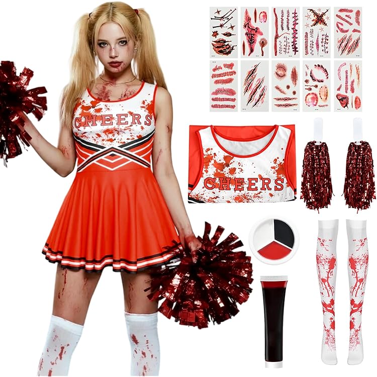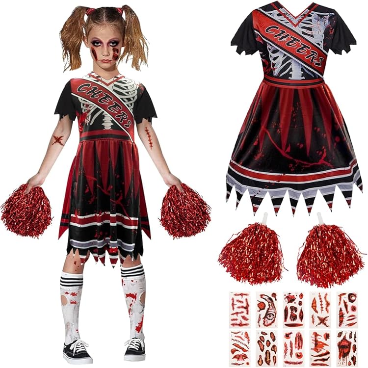 Achat Déguisement de Pom-Pom Girl Zombie Brains pour fille | Costumalia by Monsieur Deguisement Cette deguisement zombie enfant combine des uniformes de pom-pom girl traditionnels avec des motifs de zombies effrayants et fait de vous le centre d'attention en tant que leader de l'équipage effrayant Deguisement Enfant Halloween Kavoc Lot De 5 Costumes De Pom-pom Girl Zombie Comprenant Robe, Collants, Autocollants, Faux Sang En Gel Pour Filles, Déguisement D'Halloween (10 à 12 Ans, Rouge Deguisement Pom Pom Matériau de haute qualité : le Deguisement Zombie Fille est fabriqué en polyester de haute qualité, confortable à porter et le tissu doux est plus doux pour la peau, a une fermeture éclair cachée à l'arrière, facile à mettre et à enlever. Découvrez l'esprit effrayant et captivant d'une pom-pom girl zombie avec notre tenue de Deguisement Halloween Fille Zombie. Il est temps d'apporter de la peur et de l'enthousiasme dans le jeu Jowowha Costue de po-po girl pour filles, unifore de po-po girl, robe de danse avec... Spooktacular Creations Costume de pom-pom girl zombie pour Deguisement Pompom Girl : ce deguisement pompom girl effrayant a une impression unique et des détails effrayants, avec un design squelette sur la poitrine et un motif d'éclaboussures de sang qui contribue à l'atmosphère effrayante. Deguisement Halloween Zombie : ce Deguisement Halloween Pompom Girl est parfait pour les costumes d'Halloween, le cosplay, les fêtes à thème d'horreur, les bals masqués d'Halloween, les fêtes de jeu de rôle, les spectacles sur scène et les fêtes d'Halloween. Laissez votre enfant montrer son esprit d'équipe zombie en encourageant dans l'un de ces costumes de pom-pom girl pour femme