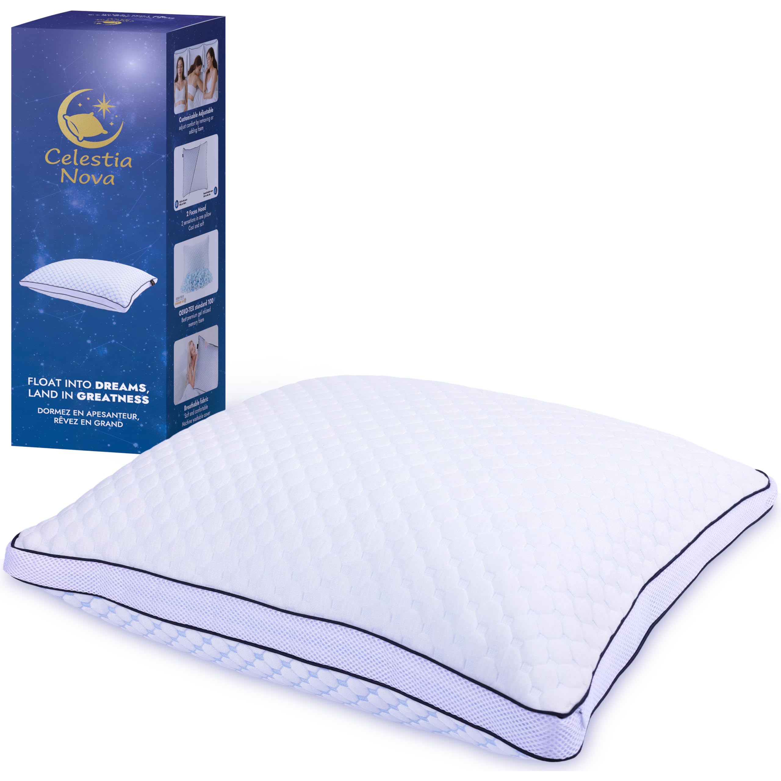 Notre dernière technologie de mousse ventilée et infusée de gel rafraichissant a été conçue pour une circulation d’air optimale, évitant l’accumulation de chaleur pendant la nuit. Pour un sommeil à plat ventre il sera conseillé de retirer un tiers de la mousse pour avoir l’oreiller le plus soft possible, pour un sommeil en position latérale, un cinquième de la mousse pourra être retirée. L’autre, interne que vous pouvez aussi laver à la main ou en machine à 30°, en prenant garde de retirer la mousse en gel, qui elle peut être aérée mais jamais mouillée ou humide. Nous voulions ainsi transformer chaque nuit en un voyage serein vers une revitalisation profonde et faire du sommeil un levier de vitalité et d’inspiration pour des millions de rêveurs à travers le monde. 2 housses amovibles, l’une externe que vous pouvez laver soit à la main, soit en machine à 30°. 🌱Durable🌱 Fabriqué selon les normes européennes les plus strictes - Certification OEKO-TEX Standard 100 qui est un label et système de certification mondial qui garantit que les produits textiles et les accessoires ne contiennent pas de substances chimiques nocives pour la santé. Cette mousse à la densité exacte pour un soutien et un maintien extrêmement agréable ce qui soulagera vos tensions musculaires. Grâce au gel de dernière génération, vous aurez une sensation agréablement rafraichissante pour votre confort nocturne. Grace à l’inner side vous pouvez adapter votre confort de sommeil en enlevant ou additionnant notre mousse de dernière technologie. Spécifications Dimensions : 60x50x15cm adaptable à la plupart des taies d’oreiller. Matelas à ressorts ensachés - mémoire de forme - à 9 zones avec... Préserver notre planète en adoptant des procédés responsables, de la mousse CertiPUR aux housses recyclées Doux pour la peau la fibre de bambou est naturellement durable et hypoallergénique et donc idéale pour les peaux sensibles. ✅Qualité premium✅ La mousse à mémoire de forme infusée de gel rafraîchissant, à la fois douce et d'un grand soutien, épouse les contours de votre tête et de votre cou. Mousse à mémoire de forme haute densité pour un soutien ferme et durable. Notre oreiller est certifié OEKO-TEX Standard 100, c’est-à-dire qu’il a les normes européennes les plus rigoureuses ! Oreiller ergonomique 55x40 cm PILO Visco-végétal à mémoire de forme 🧘🏼Bénéfice Pour La Santé🧘🏼 Oreiller ergonomique à fermeté ajustable - La mousse à mémoire de forme peut être extraite ou insérée dans la housse intérieure pour un confort optimal. Grâce à cela vous bénéficierez d’une hygiène parfaite. Oreiller ferme ergonomique à mémoire de forme, BULTEX Un entretien simple et efficace ! Celestia Nova aide chacun à se réveiller renouvelé, prêt à conquérir son propre ciel. Commandez dès maintenant et plongez dans un sommeil céleste avec l’oreiller à mémoire de forme Celestia Nova. Fibre de Bambou naturel de qualité. Matériaux : Poids : 1,2kg pour une sensation de robustesse sans être encombrant. Apaiser l’esprit via une thermorégulation inspirée du cycle naturel jour-nuit. Pourquoi choisir notre oreiller : Chez Celestia Nova, nous croyons que chaque nuit devrait être un voyage parmi les étoiles. Oreiller 60x50 Cm Double Face Oreiller Ergonomique Ou à Mémoire De Forme: Lequel Choisir Oreiller Mémoire De Forme Elle se compose de 2 faces différentes, l'une en tissus de fibre de Bambou avec système de thermorégulation naturelle et l'autre, qui grâce au tissu de soie rafraîchissant, vous donne une sensation de fraîcheur toute la nuit. Avantages Soulager le corps en l’affranchissant de la gravité grâce à un soutien morphologique précis.
