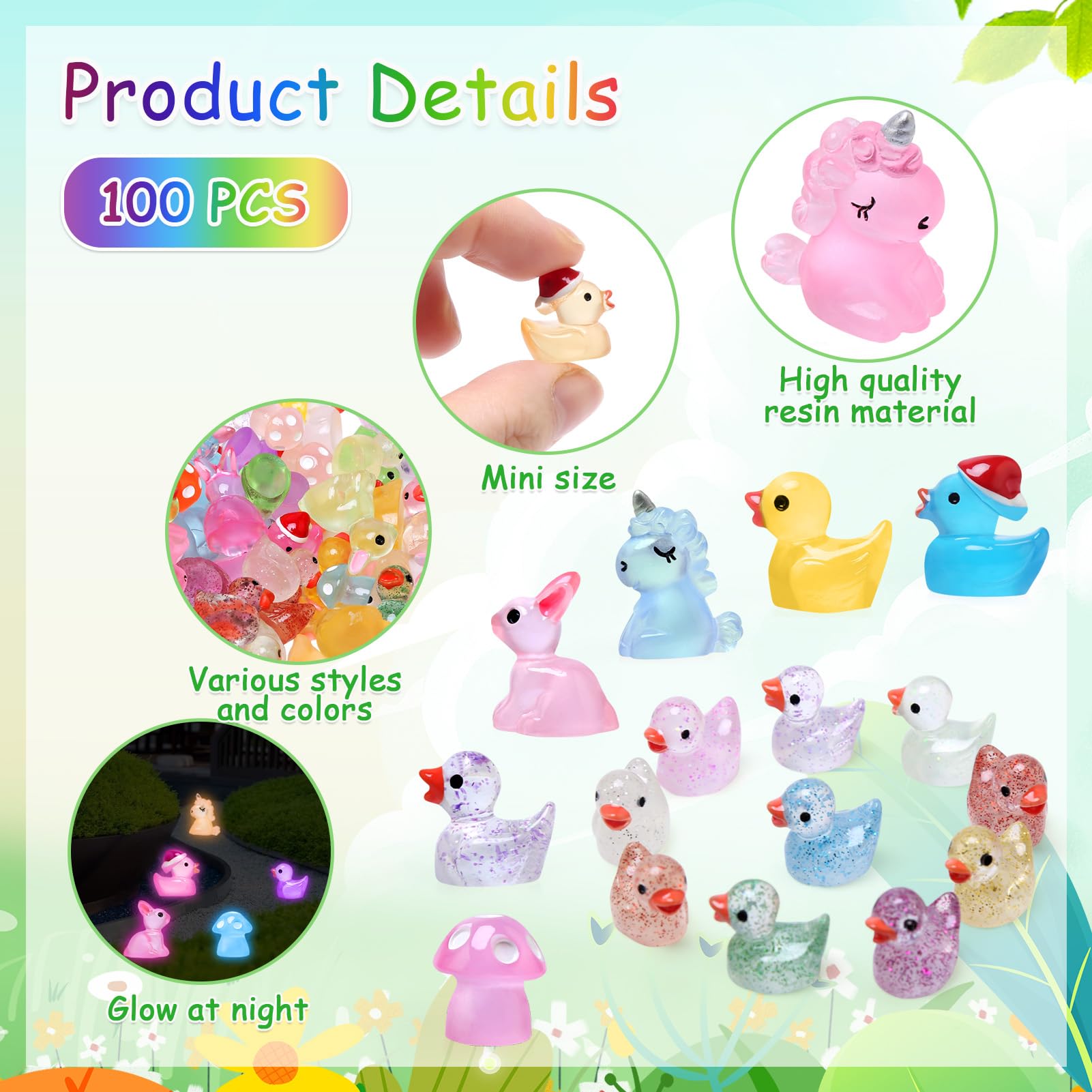 Leur grande quantité et leurs couleurs riches répondront à tous vos besoins créatifs et décoratifs. Contenu : 24 mini-canards en résine (8 couleurs) 24 mini-canards à pois en résine (12 couleurs) Avertissement De Sûreté ces mini-canards sont de petite taille. 【Cadeaux idéaux pour enfants et adultes】Ces mini-figurines d'animaux en résine au design mignon et vivant conviennent aux bricoleurs, aux amoureux des animaux, aux jardiniers et à tous ceux qui aiment les mini-animaux. Spécifications : Matériau : Résine., Quantité : 100 pièces., Dimensions : 1,5 x 1,7 cm., Couleur : Multicolore À tenir hors de portée des enfants de moins de 6 ans pour éviter tout risque d'ingestion. Caractéristiques du produit : Matériaux de haute qualité : Fabriqués en résine de haute qualité, le canard, le champignon, le lapin et la licorne sont imperméables, durables et ne se décolorent pas facilement. Les animaux en résine brillent de jour comme de nuit, vous offrant une expérience unique et une touche de fantaisie. Attention : ces mini-canards sont de petite taille. Mini Lapin Luter Lot De 100 Mini Canards En Résine Pour Travaux Manuels, 6 Couleurs, Figurines Miniatures Pour Aquarium, Jardin, Paysage, Maison De Poupée, Décorations En Pot Figurines Résine Lumineuses 6 mini-canards avec chapeau en résine (6 couleurs) Vous pourrez ainsi vous amuser à les cacher et à les chercher en famille ou entre amis. LEADSTAR Lot de oules à gâteau anti-adhésifs - oule à ressort étanche Créativité : Parfaits pour les enfants, ces animaux décoratifs en résine stimulent la créativité et l'imagination. 12 mini-licornes en résine (6 couleurs) 14 mini-lapins en résine (7 couleurs) Plus les rayons UV sont intenses, plus ils brillent dans le noir. Fanshiontide ini Canards Luineux en Résine 100 Pièces Canards... Polyvalence : Idéal pour décorer des paysages de contes de fées, des plantes en pot, des fêtes d'anniversaire, des mariages et plus encore. Ils peuvent être utilisés comme décorations DIY pour maisons de poupées, décorations miniatures de jardins de contes de fées, décorations pour aquariums et aquariums. Description du produit Illuminez votre jardin miniature avec nos adorables mini-animaux et embellissez-le avec de la couleur ! Vous pouvez également les placer n'importe où sur vos plantes, jardins, chambres, sacs à dos, réfrigérateurs, placards ou tables pour créer facilement des paysages miniatures mignons et vivants, pour une vie amusante et sans fin.