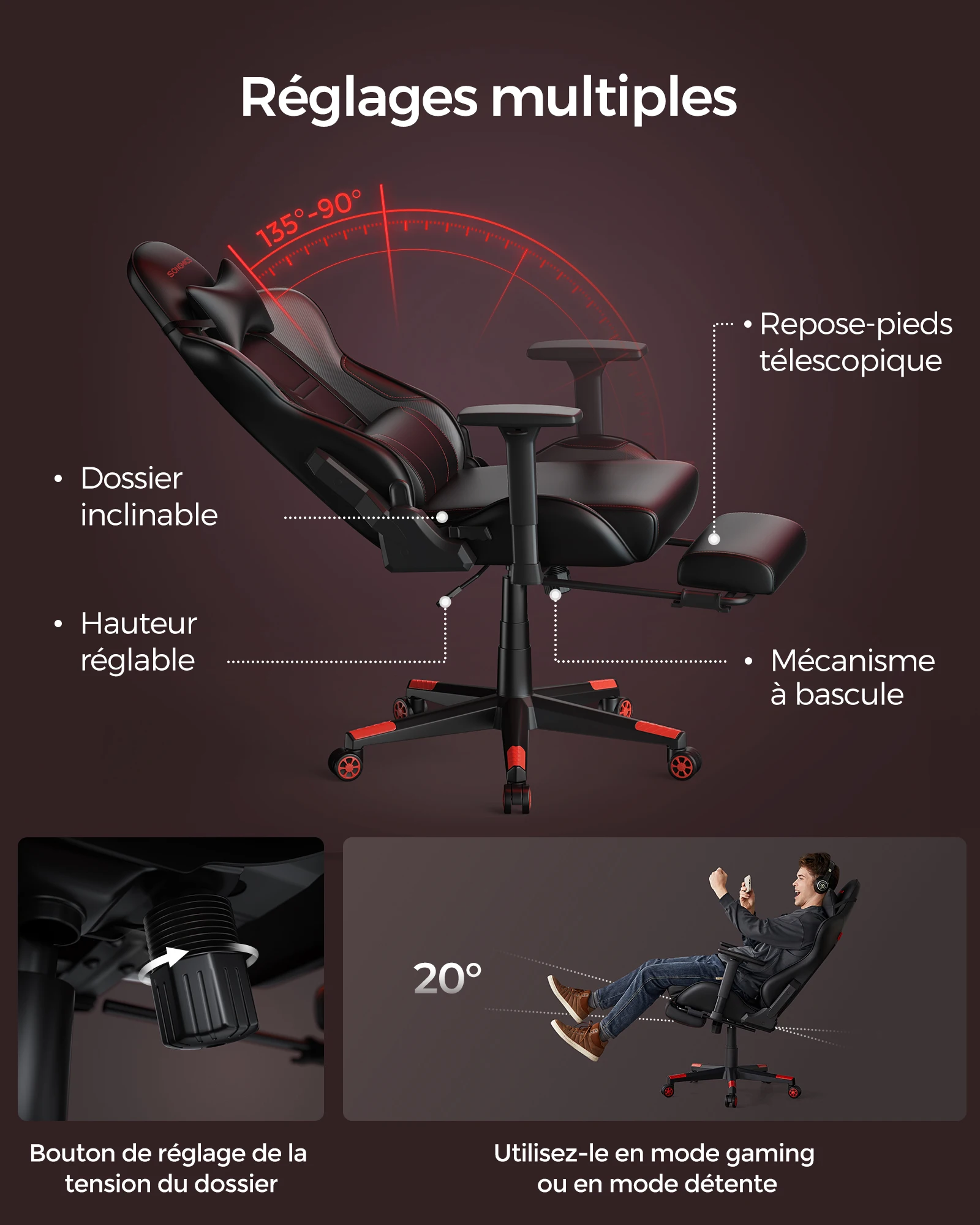 EN STOCK : Fauteuil de bureau, chaise gaming, réglable, repose-pieds télescopique, mécanisme à bascule, appui-tête, support lombaire, charge 150 kg, bleu lac et blanc crème pas cher - Retrait & Livraison - Paiement 4X disponible. Bureau à prix discount L'assise large et unique sans ailettes de notre siège d'ordinateur ergonomique est conçue pour un mouvement illimité et s'adapte à toutes les formes et tailles de corps. Chaise gaming, fauteuil de bureau ergonomique avec repose-pieds télescopique, chaise bureau avec appui-tête et soutien lombaire, fauteuil gaming ergonomique rembourré 150 kg, réglable en hauteur, noir et gris SURGRANDE TÊTE ET OREILLON LUMBAL: L'appuie-tête et le coussin lombaire surdimensionnés de conception exclusive offrent à l'utilisateur une plus grande zone de soutien et un meilleur effet de soutien, ce qui réduit la fatigue et améliore l'expérience de jeu. DESIGN ERGONOMIQUE POUR DE LONGS JEUX : Avec le dossier réglable de 90 à 135 degrés et le repose-pieds escamotable, vous pouvez personnaliser votre expérience d'assise. Le matériau respirant et agréable pour la peau permet de rester assis confortablement pendant longtemps sans se sentir en sueur ou humide. Chaise Gaming Ergonomique Rose et Blanche – Confort et Style au Rendez-VousTransformez vos sessions de jeu ou de travail avec cette chaise gaming ergonomique au design saisissant en rose et blanc. Pensée pour ceux qui passent des heures devant un écran, elle associe style sportif et confort absolu. Que vous soyez gamer passionné, télétravailleur ou étudiant, cette chaise sera votre... HLFURNIEU Chaise Gaing Ergonoie, Fauteuil Gaer avec Hauteur Réglable, Siege Gaing Repose CONFORT INCOMPARABLE : plongez dans le confort de notre chaise de jeu équipée d'un coussin à ressorts hautement élastique. DESIGN D'ARMOIRE UNIQUE : Ce design d'accoudoir original que nous avons conçu facilite l'inclinaison du dossier. L'appui-tête peut être réglé vers le haut et vers le bas pour s'adapter aux personnes de différentes tailles.