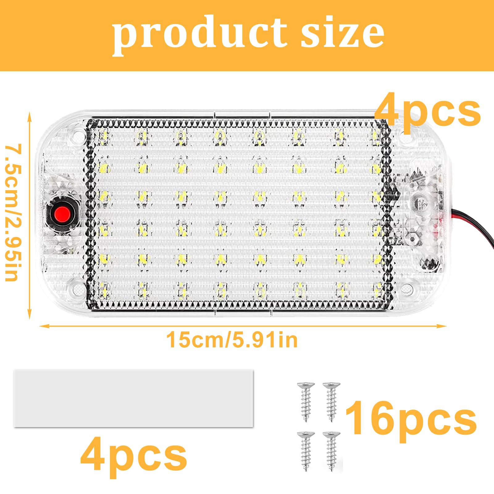 Éclairage intérieur de voiture - La construction résistante garantit une longue durée de vie et une fiabilité, même dans des conditions difficiles. Lot de 4 éclairages LED d'intérieur de voiture : Nizirioo 48 LED pour voiture, camping-car, lampe de lecture LED 12-85 V avec interrupteur on/off, lampe blanche pour voiture, camping-car, bus, caravane Características Nizirioo 48 LED Éclairage intérieur de voiture : 4 pièces 12 V – 85 V Éclairage intérieur de voiture avec interrupteur, lumière blanche 10 000 K, éclairage intérieur LED pour camping-car, camion, camionnette, caravane Particularités : 1., À l'extrémité de l'éclairage intérieur de la voiture se trouve un interrupteur qui peut être facilement contrôlé., 2., L'éclairage intérieur de la voiture dispose de deux méthodes d'installation : vis ou ruban adhésif double face, qui peuvent être installés selon vos préférences personnelles., 3., Le design ultra fin de l'éclairage intérieur de la voiture ne prend pas beaucoup de place et est beau et pratique. Éclairage intérieur de voiture - Les possibilités d'installation polyvalentes permettent un ajustement personnalisé et garantissent que l'éclairage s'adapte parfaitement à votre véhicule. Il peut être utilisé dans différents types de véhicules et domaines d'application pour égayer votre intérieur et créer un environnement confortable. Large application : l'éclairage intérieur de voiture est extrêmement polyvalent et est idéal pour les camping-cars, camions, camionnettes, caravanes et plus encore. Haute luminosité : l'éclairage intérieur de la voiture se distingue par sa luminosité remarquable, qui plonge l'intérieur de votre véhicule dans une lumière blanche éclatante semblable à la lumière du jour de 10 000 K. Éclairage intérieur 12 V 238 mm x 20,6 mm, 18,48 Avec sa faible hauteur, il s'intègre parfaitement à l'intérieur de votre véhicule sans prendre de place précieuse. Source de lumière : LED Connexion : 2 fils, rouge (+), noir (-). Ultra fin et robuste : l'éclairage intérieur de la voiture se caractérise par son design ultra fin et pourtant robuste. Lot de 2 éclairages d'intérieur LED 12 V - 85 V - 48 LED - Éclairage... Installation Vis Ou Adhésif Nizirioo Éclairage Intérieur De Voiture 48 LED : 4 Pièces 12 Bande LED Intérieur Voiture Commande facile de l'interrupteur : l'éclairage intérieur de la voiture pour le plafond de la voiture se trouve des interrupteurs.