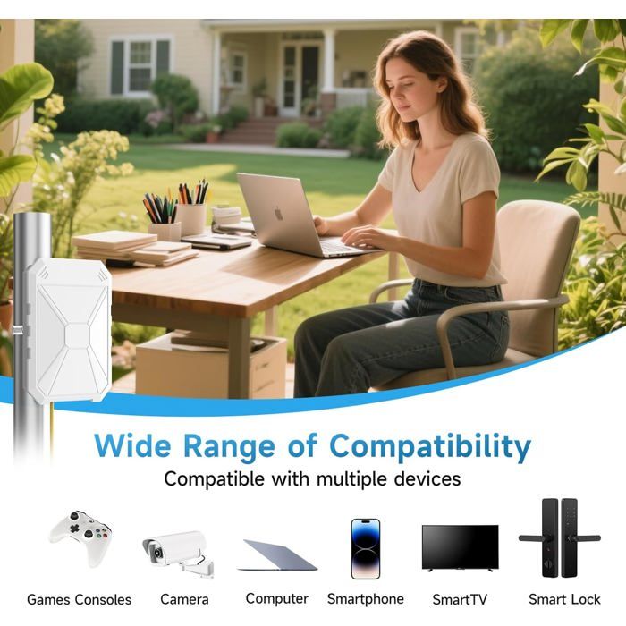 N300 Repeteur WiFi Puissant Exterieur, Amplificateur WiFi Exterieur avec 4 Antennes Intégrées, IP67 RéSistant Aux IntempéRies, WPA/WPA3, with PoE, Port Ethernet, Convient pour Le Jardin, La Cour Un seul câble est nécessaire pour l'alimentation et la transmission des données. Amplificateur WiFi étanche IP67 4 Antennes N300 Repeteur Wifi Puissant Exterieur,Amplificateur Wifi Exterieur Avec 4 Antennes Intégrées,Ip67 Résistant Aux Intempéries,Wpa - Informatique Amplificateur Wifi Extérieur Puissant N300 Repeteur wifi Puissant Exterieur, Amplificateur WiFi avec 4 Antennes Intégrées, IP67 RéSistant Aux IntempéRies, Sécurité WPA/WPA3, Passif PoE, Port Ethernet, Convient Pour Le Jardin, La Cour Il prend en charge les protocoles de sécurité tels que WEP, WPA-PSK et WPA2-PSK pour sécuriser votre réseau sans fil et empêcher tout accès non autorisé 【Installation Facile】Le processus d'installation intuitif et les instructions claires de ce repeteur wifi puissant garantissent que votre amplificateur wifi exterieur sera opérationnel en quelques minutes, et non en heures, avec une couverture Wi-Fi rapide 2025 Répéteur WiFi Extérieur Puissant, Extenseur WiFi 300bps 2.4GHz... Répéteur WiFi 6 Extérieur/Aplificateur Puissant Longue Portée AX3000 【Installation PoE Passive Flexible】Cet amplificateur wifi exterieur adopte la technologie PoE passive innovante, ce qui élimine le besoin d'un adaptateur d'alimentation supplémentaire. Remarque : le convertisseur PoE n'est pas étanche 【All-Weather Suitability】This amplificateur wifi exterieur has IP67 weatherproof function, which is made of waterproof, heat-resistant and cold resistant materials, which ensures normal operation in extreme cold, high temperature, thunderstorms, or constant humidity, and guarantees that the device will continue to operate stably in all weather conditions
