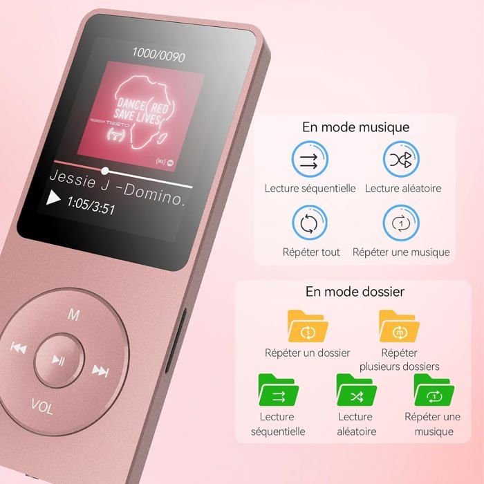 Grâce à la fonction de reconnexion automatique, votre lecteur MP3 se connecte instantanément aux appareils déjà jumelés, simplifiant son utilisation au quotidien. Vous profitez d’un son fluide, sans coupure, et d’une liberté de mouvement totale. Son écran de 1,8 pouces facilite la navigation entre vos musiques, et ses boutons de volume latéraux assurent un contrôle pratique même pendant vos entraînements. (Non compatible avec iTunes ou certains livres audio). Ce lecteur musical dispose de 32Go de mémoire interne permettant de stocker facilement des milliers de chansons. 70H d’autonomie et design portable : Charge rapide en 2,5h pour jusqu’à 70h d’écoute avec écouteurs filaires. Vous n’avez plus besoin de répéter la configuration à chaque utilisation, ce qui rend l’expérience plus agréable. Parfait pour écouter librement vos musiques La qualité sonore est au rendez-vous grâce à une puce de réduction de bruit numérique avancée et à un haut-parleur interne intégré. Profitez d’un son HiFi clair et puissant. Classique 8Go Lecteur MP3 Bluetooth 5.3 32Go Avec Haut-Parleur Intégré Lecteur Mp4 Baladeur MP3 avec haut-parleur intégré et Bluetooth. - Test et Avis Non compatible avec smartphone ou tablette. Husic P68 Lecteur P3 HiFi avec Clip, Lecteur de usique Hi-Res sans... Avec seulement 30g, il est ultra-léger et facilement transportable dans une poche, un sac ou un brassard. Grande capacité de stockage 32Go extensible : Ce lecteur MP3 Bluetooth dispose de 32Go intégrés pour stocker des milliers de chansons sans carte externe. Le lecteur MP3 offre une autonomie exceptionnelle de 70 heures après seulement 2,5h de charge, garantissant une écoute prolongée sans souci de recharge fréquente. AGPTEK 32Go Haut-Parleur MP3 Bluetooth 5.3 avec Boutons Tactiles, 2.4 Pouces Grand Écran, Carte Vous profitez d’un son HiFi clair, puissant et authentique. Veuillez noter que le lecteur n’est pas compatible avec les smartphones et tablettes. Compatible avec port AUX pour voiture. Vous pouvez également étendre la capacité jusqu’à 128Go via une carte TF (non incluse), pour emporter toute votre bibliothèque musicale avec vous, que ce soit pour le voyage, le sport ou la détente.