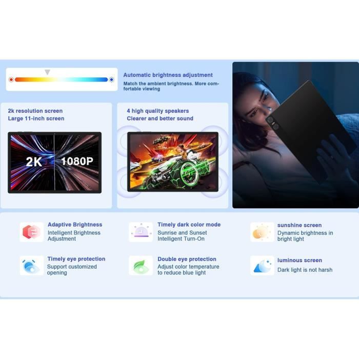 Remarque : une connexion WiFi est nécessaire pour l'utilisation du GPS. [Processeur Octa-Core Puissant] La tablette Android SVITOO est équipée d'un processeur Octa-Core T606 (2,0 GHz), de 16 Go de RAM (4+12 Go) et de 128 Go de stockage interne, extensible jusqu'à 1 To. Le tableau tactile Maxlegen 11 pouces WiFi est livré avec un clavier Bluetooth, une housse de protection, des écouteurs, un stylet, une souris, vous évitant ainsi les achats additionnels T20 Tablette Avec Stylet 10,4 Pouces 2K Hd, 15 Go 256 Go (Tf 1 To... [Batterie de 8000 mAh avec protection thermique NTC] La tablette SVITOO 11 pouces est équipée d'une batterie de 8000 mAh avec protection NTC, offrant jusqu'à 14 heures de lecture vidéo, 10 heures de jeu ou 15 heures de navigation Internet. T20 Tablette Avec Stylet 10,4 Pouces 2K Hd, 15 Go + 256 Go (Tf 1 To Grâce à Android 15 et au processeur économe en énergie T606, l'autonomie reste prolongée même en déplacement. Emballée soigneusement dans une boîte premium avec une garantie d'un an et un service client disponible 24h/24 et 7j/7., Convient pour les anniversaires, les fêtes ou comme mise à niveau technologique. Tablet Android Android Tablet Tablet 10 Inch Android 15 With 24GB RAM + 128GB ROM (1TB Expand), T615 Octa-Core, 1280x800 IPS HD Touchscreen, 5MP+8MP Dual Camera, 6000mAh, Tablet With Keyboard, Mouse, Widevine [Écran IPS HD de 11 Pouces] La tablette Android 15 est dotée d'un écran IPS de 11 pouces (1280 x 800) avec certification Widevine L1, permettant la lecture de contenus HD sur Netflix et Prime Video. Tablette Android 15 SVITOO 11 Pouces : Puissante, Polyvalente et Adaptée pour Offrir Caractéristiques principales : ✅ Performances techniques : Android 15 avec processeur Octa-Core T606., ✅ Autonomie longue durée : batterie de 8000 mAh avec protection NTC. La fonction de blocage des publicités élimine les annonces indésirables, tandis que le boîtier en métal de qualité allie design moderne et durabilité.