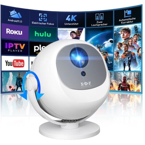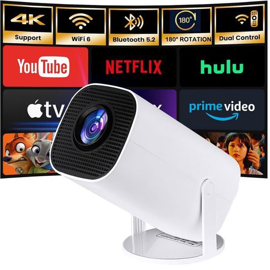【Wifi 6 et Bluetooth Bidirectionnel 5., 4】Liberté sans fil et adieu aux câbles HDMI démodés. Mini Projecteur 4k Mini Vidéoprojecteur 1080P Avec WiFi 6 BT 5.4, Portable Projecteur, Projecteur Video Supporté Pour Correction Trapézoïdale Automatique, 270° Rotation, Avec HDMI Et Souris, Blan Mini Projecteur Portable Ce mini-projecteur est équipé des technologies Bluetooth 5., 4 et WiFi 6 et fonctionne sur les bandes 2,4 GHz et 5 GHz. Le système d'exploitation Android TV préinstallé permet d'accéder directement à une multitude de vidéos, y compris les contenus Netflix et YouTube, sans avoir besoin d'une barre de télévision séparée. 【Son Surround Riche et Système De Refroidissement Avancé】L'appareil est doté d'un système de son surround 360° intégré qui délivre un son clair et complet pour une expérience immersive. App intégrée] 2024 Upgraded Vidéoprojecteur 1920 * 1080P FHD 4K ini... La fonction audio bidirectionnelle Bluetooth 5., 4 permet d'associer un casque ou des haut-parleurs bluetooth et d'améliorer l'expérience audio cinématographique grâce au son surround 360° intégré. Créez facilement une salle de cinéma privée. Comme il peut faire pivoter l'image de 270°, il peut être projeté presque partout, que ce soit dans votre salon, dans votre chambre, dans un espace de réunion ou à l'extérieur. Le divertissement en toute simplicité. Un moteur optique scellé associé à un système de refroidissement à double ventilateur réduit considérablement les températures de fonctionnement, garantissant des performances durables et fiables, même après une utilisation prolongée. 【Projecteur Intelligent Avec APP Intégrée】Doté d'un système d'exploitation android, ce projecteur 4k dispose d'une mémoire vive de 1 go et d'une capacité de stockage de 8 Go pour une utilisation fluide et intuitive. AVIS : Le ini Projecteur coolid 1080P avec WiFi 6 BT 5.4 et Android TV