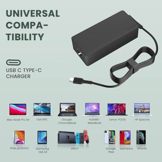 [SMMKOXOI Modèle Compatible avec Dell]: Compatible avec Dell Chromebook 3100 Chargeur Ordinateur Portable Compatible avec Dell USB C pour Modèles 3400 5190 7200 7370/ XPS 12 13 9250 9350 9360 9370 / Latitude 5320 5400 5500 7400 3500 Compatible avec Dell Laptop Charger: Compatible avec Dell Chromebook 3300 3380 3400 3500 5190 5300 5400 7200 7300; Latitude 5420 5520 7410 7310 2-in-1 P28T P29T P30T P86F; XPS 13 9300 9310 9350 9360 9370 9380 XPS 15 9550;3310 2-in-1 3390 2-in-1 5175 2-in-1 7200 2-in-1 7210 2-in-1 Chromebook Notebook Charger. Chargeur Ordinateur Portable Lenovo 20V 4.5A 90W ADLX90NCC3A ADLX90NDC3A ADLX90NLC3A Thinkpad X1... [SMMKOXOI Compatible avec Lenovo USB C Chargeur]: Chargeur 65W Ordinateur Portable USB-C Compatible avec Lenovo ThinkPad T480 T480s T490 T490s T495s T580 T580s T590 T495S L380 L390 L480 L490 E14 E15 E480 E485 E490 USB C Laptop Chargeur Compatible avec Lenovo Yoga 7i 9i 14 15 2 in 1 Laptop, Compatible avec Lenovo Yoga S730 C930 C940 C740 730 730S 910 920 Yoga 730 730s s730 720-13 730-13 730s-13 s730-13 720-13IKB 730-13IKB 730S-13IWL 730S-13IML S730-13IWL S730-13IML, Compatible avec Lenovo Laptop Chargeur. Description du produit Chargeur universel pour ordinateur portable USB C 65 W Chargeur USB-C 65 W pour ordinateur portable compatible avec Lenovo. Chargeur USB-C 65 W pour ordinateur portable Dell Compatible avec les modèles 2-en-1 Dell Chromebook 3100, 3500, 3400, 3300, 3380, 5190, 7486, 5300, 5400, 5500, P28T, P29T, P110G, P111G, P86F, P99G, P100G, 3380, 5190, 7486 Compatible avec les modèles Dell Latitude 12, 13 et 14 : 5285, 5289, 5290, 7212, 7202, 7275, 7285, 7290, 3380, 3390, 3379, 7350, 7368, 7370, 7389, 7390, Latitude 5420 5520 5320 7420 7410 7320 5289 5290 5320 5410 5310 5510 e5420 7275 7320 7370 7520 5190 3390 7310 7285 7520 7389 7390 9410 9510 5175 7275 7212 3120 7210 5400 5500 3500 3400 3100 3300 5300 7200 7300 7400 2-en-1 Compatible avec les Ultrabooks DELL XPS 12 et 13 : L221x, 9Q23, 9Q33, 321X 322X L321X L322X 3943 9333 9343 9370 9360 9350 9365 9380 Chargeur Asus Ordinateur Portable 65W 45W USB C Chargeur Pour Lenovo ThinkPad Yoga HP Ordinateur Portable Chroebook Pour Dell Chargeur Lenovo HP Dell Compatible Compatible avec HP : Chromebook 11, 11A G1, G6 EE, 14 G5, 13 G1 (14-db0070nr, 12-f014dx), Spectre X2 (12-a008nr, 12-a001dx, 12-a009nr, 12-ab010nr, 13-v111dx, 12-a0xx, 13-v001dx, 13-v010ca, 13-v011dx, 13-v018ca, 13-v021nr, 13-ac023dx, 13-v024tu, 13t-v000), Spectre x360 (13-w063nr, 13-ac076nr, 13-ac075nr), Elite x2 1012 Tablette G1 ; x2 10-p012nr 10-p010nr 10-p018wm 10-p020nr 10-p000 14-ca061dx 14-ca020nr 14-ca060nr 14-ca043cl 14-ca051wm 14-ca052wm Compatible avec HP : Chromebook 11 G8 EE / 11A G8 EE /11 G7 EE / 11 G6 EE / 11A G6 EE / 13 G1 / 14 G1 14 G5 / 14A G5 / 14 G6 / X360 11 G1 EE / x360 11 G2 EE 14-CA 14C-CA 14A-NA 14B-CA 11-AE 11A-NB 14-DA 15-DB 14-ca0061dx 14-ca060nr 14-ca020nr 14-ca052wm 14-ca051wm 14-ca043cl 14a-na0010nr 14a-na0020nr 14a-na0022od 14b-ca0010nr 14b-ca0013dx 14b-ca0015cl 14b-ca0023dx 14b-ca0025cl 14b-ca0036nr 14c-ca0000 14-ca0053dx 14-ca0065nr 15-de0000 15-de0523dx 14-ca061dx 11-ae051wm 11-ae001tu 11-ae027nr Compatible avec HP : LA45NM150, AA45NM150, HDCY5, 0HDCY5, DA30NM150, 8XTW5, 08XTW5, ADP-30CD BA, 24YNH, 492-BBSP, 5FX88, 470-ABSF, D0KFY, 332-1827, 3RG0T, 03RG0T, PA-1450-66D1, JT9DM, DA45NM131, ACBEL AA45NM131, 450-18066, 450-1846, JHJX0, 0JHJX0, 312-1307 LA45NM121, FA45NE1-00, 0X9RG3, X9RG3 ANTWELON 65W 45W USB C Chargeur Ordinateur Portable Type C pour Lenovo [SMMKOXOI Chargeur USB C 65 W] : Entrée : 100-240 V~1,5 A, 50-60 Hz, USB Type-C : 65 W/45 W, sortie : 5 V-3 A, 9 V-3 A, 15 V-3 A ou 20 V-3,25 A, Chargeur USB C Rapide de Ordinateur Portable Compatible avec Lenovo HP Dell Samsung, Asus Acer Google et Autres Ordinateurs Équipés d'un Port USB C. Compatible avec Lenovo ThinkPad X270 X280 X380 X390 X390 X395 YT480 T480S T580 T580S 480 E485 E580 E585 Compatible avec Lenovo Yoga C930-13, Yoga S730-13, Yoga 920-13, Yoga 730-13, IdeaPad 730s-13 GX20P92530, ThinkPad X1 Carbon 5e, 6e et 7e génération, X1 Yoga 2e, 3e et 4e génération, X1 Tablet 2e et 3e génération 910, 910-13, 910-13IKB 13,9 pouces 720m Compatible avec Lenovo IdeaPad Yoga 720, 730, 730s, S730, 720-13, 730s-13 s 720-13IKB 730-131KB 730-13IKB 730S-13IWL 730S-13IML S730-13IWL S730-13IML Compatible avec les références : GX20U90488 4X20E75131 4X20M26252 4X20M26268 4GX20N20876 4X20E75132 4X20E75135 4X20V07881 4X20E75137 SA10M13947 00HM664 01FR025 01FR031 01FR024 01FR027 5A10K34723 AD045G4 5A10K34713 SA10M13945 00HM633 00HM642 00HM651