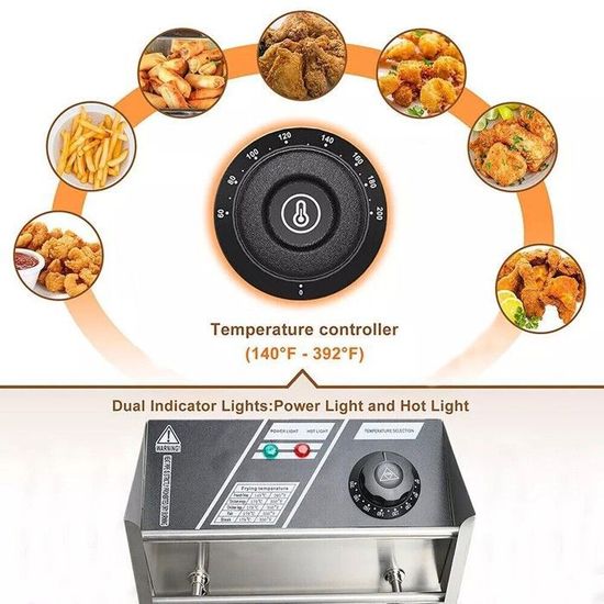 🍑Performances de chauffage exceptionnelles : Ce produit est doté de deux réservoirs de 6,34 litres, chacun d'une puissance de 2,5 kW pour un chauffage rapide. À ce moment-là, le voyant vert s'allume et le voyant rouge s'éteint, ce qui indique que le tube chauffant électrique fonctionne et que l'huile dans la poêle commence à se réchauffer. Friteuse électrique cuve amovible 4 litres Panier à Frites Panier à Frire en Acier Inoxydable avec Manche Multi... Le tube chauffant en forme de U est équipé d'une sonde de température pour assurer un chauffage homogène et vous permettre d'obtenir rapidement des aliments délicieux. Friteuse - 2 x 8 L - 2 paniers - avec robinet de vidange 🍑Contrôle indépendant : Il dispose de deux friteuses à contrôle de température indépendant, qui vous permettent de régler facilement la température (140-392 ℉) pour répondre aux exigences de température des différents aliments frits. 🍑Fonctionnement simple : Le panneau de commande est facile à comprendre et propose des suggestions de températures de friture pour différents aliments, ce qui vous permet de maîtriser et de faire frire rapidement de délicieux aliments ! Friteuse Double Cuve 6 Litres Frites Friteuse à Double Cuve Thermostats RéGlables IndéPendants Acier Inoxydable Oilcleaner Bac Professionnelle Lorsque la température de l'huile atteint la température souhaitée, le thermostat peut couper automatiquement l'alimentation électrique et le voyant vert s'éteint. Caractéristiques Modèle : 82 Couleur : Argent Style : moderne Moderne Forme : Rectangle Rectangle Matériau : Acier inoxydable 201 Traitement : Polissage Assemblage requis : Oui Source d'alimentation : Cordon électrique Type de prise : Norme européenne Tension : 220V 52Hz Puissance : 2., 5kW+2., 5kW Capacité de chaque réservoir : 6L/ 6., 34Qt Température : 60-200℃/140-392℉ Longueur de la poignée du panier : 20cm/ 7., 87in Taille du panier : 20*17., 2*10., 5cm/ 7., 87*6., 77*4., 13in Taille de chaque réservoir : 30*24 cm/ 11., 81*9., 45 in Poids brut : 8., 45kg/ 18., 63 lbs Taille de l'emballage : 60*51*39 cm/ 23., 62*20., 08*15., 35 in Taille du produit : 55*44*30 cm/ 21., 65*17., 32*11., 81 in Le paquet comprend 1* Friteuse électrique à double réservoir 1* Instructions d'utilisation en anglais Tous les accessoires pour l'installation Notes 1., Veuillez lire entièrement le manuel d'utilisation avant d'utiliser l'appareil. Tournez le thermostat pour sélectionner la température souhaitée.
