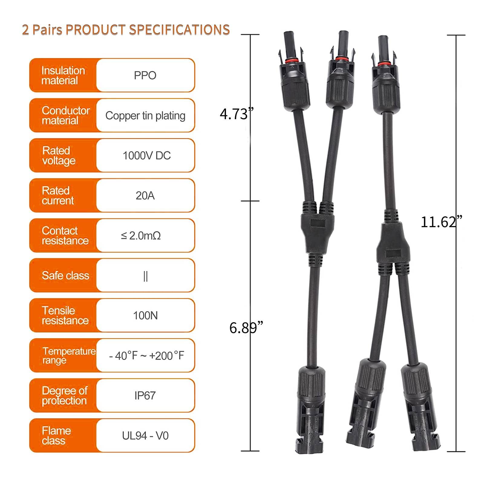 Kit d'outils de connecteurs solaires en Y pour panneau solaire 💕 【 Facile à installer 】 Le kit de connecteurs solaires est un processus d'assemblage rapide et simple, et un retrait simple des prises sans l'aide d'aucun instrument supplémentaire. Connecteurs Y Solaires MMF FFM PANNEAU SOLAIRE CÂBLE Coupleur Combiner Panneau Solaire Branche Pince A Sertir Per 💕Connecteurs de dérivation Solar Y Matériau du connecteur : PPO + PC Matériau du conducteur : Cuivre étamé Anneau étanche : IP67 Température : -40 à 125℃ Consulting-Material : Cuivre étamé longueur : 11,8 pouces Courant nominal : 30 A Classe de flamme : UL94-V0 Tension nominale : 1 000 V CC Jauge de fil : 12 AWG 💕 Le paquet comprend: 1 connecteur de branche solaire 11,8 pouces 12AWG 1 mâle à 2 femelle (M/FFF) 1 connecteur de branche solaire 11,8 pouces 12 AWG 1 femelle vers 2 mâles (F/MMM) 6 paires de connecteurs de câble solaire mâle femelle 6 paires de broches de connecteur solaire mâle/femelle 2 PCS Clé à molette pour assemblage d'outils de connecteur solaire Nous nous engageons à fournir aux clients des produits de haute qualité grâce à l'amélioration continue de l'expérience d'achat. 💕 【 Emballage inclus 】 2 paires de câbles de connecteurs solaires en Y + 6 paires de connecteurs de câble de panneau solaire mâle/femelle + 6 paires de broches de connecteur solaire + 2 pièces de clé de connecteur solaire. Nos kits de connecteurs solaires sont le cadeau idéal pour les installations solaires domestiques ou industrielles. Connecteur de panneau solaire 1 paire DC 1000V connecteur solaire... Tbest câble parallèle de panneau solaire 2 pièces adaptateur solaire 2 à 1 IP68 Section de câble unipolaire appropriée : 1,5 mm² - 6 mm². Conducteur solaire en cuivre pur avec revêtement en étain, faible résistance pouvant empêcher la corrosion et l'oxydation, durable avec une durée de vie de plus de 25 ans pour une utilisation en extérieur. Nous ferons de notre mieux pour résoudre votre problème dans les 24 heures.