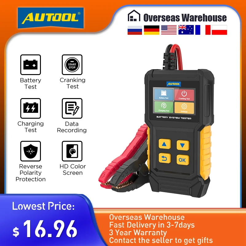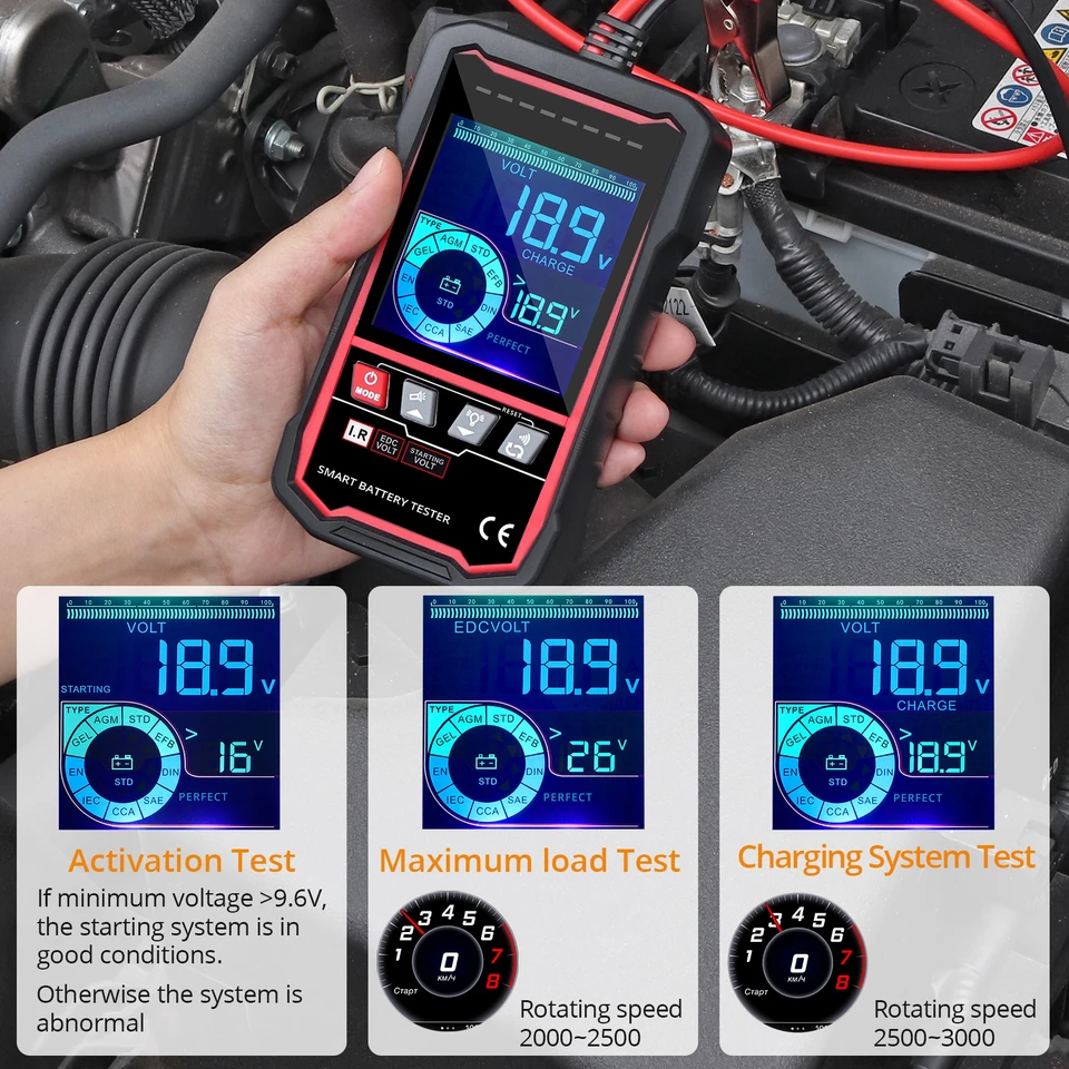 Contenu de la livraison 1X testeur de batterie BT360 2X pinces Kelvin à noyau de cuivre 1X manuel d'utilisation Étape 2 : Connectez la batterie 12 V, les pinces rouges au pôle positif et les pinces noires au pôle négatif. Étape 3 : Test de batterie : Sélectionnez d'abord le type de batterie à tester, puis les critères et la plage de test. Protection intégrée : protection de connexion contre les inversions de polarité avec protection anti-étincelles ; aucune chaleur n'est générée pendant le fonctionnement, ni ne provoque de décharge de la batterie. Fosa Testeur de batterie au plomb-acide étanche 12/24/36/48 V, écran LCD et testeur de capacité pour obtenir une valeur de tension de charge fiable. Écran HD et couleur : dispose d'un écran couleur de 2,4 pouces avec un écran rétroéclairé, offrant une excellente expérience visuelle et une lecture claire des résultats des tests de performances de la batterie. Efficacité et sécurité : Grâce à une technologie conductrice avancée, il affiche directement les résultats précis des informations du véhicule. Il offre une détection plus détaillée des performances de la batterie, incluant des paramètres tels que sa capacité, sa durée de vie et sa résistance interne. D'autres langues peuvent être personnalisées. TOOLTOP testeur de batterie de voiture 12V 24V Maroc Disponible en anglais, espagnol, allemand, français, italien, russe, polonais, coréen, chinois, chinois traditionnel et japonais. 【Analyseur de batterie automobile numérique professionnel et fiable】les normes de test incluent la plupart des normes mondiales : CCA, BCI, CA, MCA, JIS, DIN, IEC, EN, SAE et GB, couvrant les batteries de 20 à 2 000 CCA et de 30 à 100 AH. Coent choisir le eilleur testeur de batterie voiture ? - Charles... Conçu avec une protection contre les inversions de polarité, il n'endommagera pas l'appareil et n'affectera ni la voiture ni la batterie. Prise en charge multilingue : 14 langues sont disponibles. Les résultats s'affichent en quelques secondes. Il détecte rapidement la tension, la résistance et l'état de santé de la batterie. Testeur de batterie de voiture BT30 5-30 V, testeur de charge 100-2000 CCA, analyseur de batterie automobile, alternateur gel AGM, testeur de système de charge et de démarrage de batterie numérique pour Test de charge et de démarrage Testez différents composants du système de charge, notamment le générateur, le redresseur, la diode de redressement, etc. Vous offre une expérience visuelle plus confortable à chaque inspection. Il offre une précision de 99,6 % et des données fiables sur l'état de votre batterie. 【Efficacité et sécurité】Grâce à une technologie conductrice avancée, il affiche directement les résultats précis des informations du véhicule.