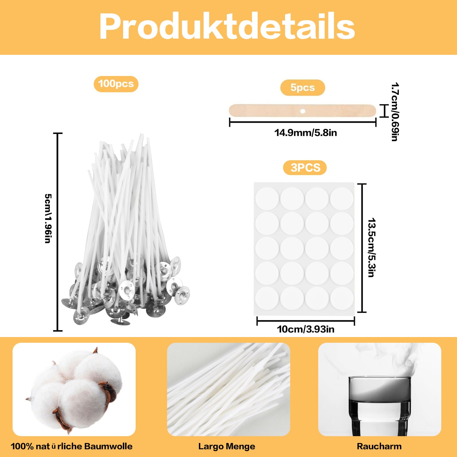Caractéristiques : Fabriquées en coton bio naturel, ces mèches de bougie ne fument pas de couleur noire, sont inodores, brûlent plus longtemps et ont une flamme plus stable. Contenu de la livraison : 100 mèches de bougie. Facile à utiliser : il suffit de déterminer la longueur de la mèche et de la couper. Nous résoudrons vos doutes le plus rapidement possible. Ces mèches de bougie peuvent être utilisées avec la plupart des cires telles que le soja, le colza, la cire d'abeille, la paraffine, etc. Autocollant de mèche - ZJCHAO - 200pcs - Résistant à la chaleur... 25 Ensembles Meche Bougie Bois avec 25 Bases en Métal, 5 Mèche de Matériau de qualité supérieure : la mèche de bougie est fabriquée en coton naturel avec une bonne finition, sans odeur, brûle longtemps sans fumée noire, la flamme est plus stable et la durée de combustion est plus longue. adaptées à tous les types de bougies DIY. Les mèches de bougie peuvent être coupées à la longueur parfaite pour les grandes bougies. Conseils : - Si vous avez des questions sur l'utilisation du kit de mèches pour bougies, n'hésitez pas à nous contacter. Cire Bougie Lot De 100 Mèches Pour Bougies - Accessoires De Fabrication De Bougies Kit DIY Bougie Maison Naturel 100 pièces bougie mèche autocollants Double face a... – Grandado et ont une bonne stabilité de combustion. - Longueur de la mèche : 5 cm. - Vous recevrez 100 mèches de bougie, 3 feuilles d'autocollants pour mèche et 5 supports de mèche en bois. Informations sur le produit : - Nom du produit : kit de bougies - Matériaux : coton, bois de hêtre. Faciles à utiliser au quotidien. Nombreuses utilisations : idéal pour la décoration de mariage, anniversaire, Noël, Saint-Valentin.