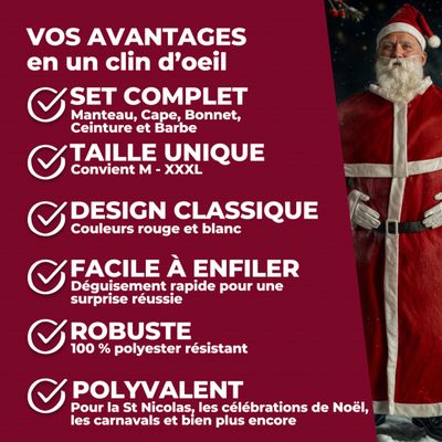 -Vous ne manquerez pas un déguisement parfait pour Noël, magasin centre commercial, hôtels, restaurants, spectacles etc. -Ce costume complet de Père Noël 10 pièces pour adultes comprend: 1 veste, 1 pantalon, 1 bonnet de Noël, 1 ceinture, 1 paire de gant, 1 sac de cadeau, 1 paire des bottes (couvre-bottes), 1 barbe, 1 paire de lunettes, 1 perruque. -Costume de Père Noël est classique déguisement pour la fête Noël, ce costume de Noël peut être porté aussi bien par les hommes et les femmes. Déguisement Noël Adulte Complet 10 Pièces Déguisement De Père Noël 5 Pièces Pour Homme - Veste Rouge Et Blanche + Pantalon, Chapeau, Barbe + Ceinture (S | Lot De 48 Le Costume Du Pere Noel Déguisement de noël pour chien père noël - ABC chiens Ensemble Costume de Père Noël 12pcs,ITOOBE Complet de Déguisement de... Chouette Déguisement père noël 5499707951817