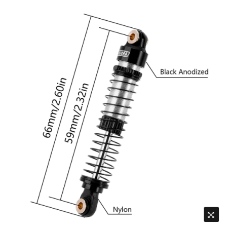 Remarque : l'huile pour amortisseurs n'est pas incluse. Description du produit Spécifications Numéro de Pièce : BZ-05BS Matériau du Corps de l'Amortisseur : Aluminium Matériau de l'Embout de Tige Inférieur : Nylon Diamètre du Corps de l'Amortisseur : 14mm Diamètre du Trou de l'Embout de Tige : 3mm Diamètre du Fil du Ressort : 0., 9mm, 1., 0mm Longueur de l'Amortisseur (entre axes) : 80 / 90 / 100 / 110 / 120mm Longueur Comprimée (entre axes) : 62 / 67 / 72 / 77 / 82mm Course de l'Amortisseur : 18 / 23 / 28 / 33 / 38mm Poids par Amortisseur : 15 / 16 / 17 / 18 / 19g Liste du Colis : 4 * Amortisseurs 8 * Ressorts Supplémentaires Avertissement De Sûreté Note : Convient aux per sonnes âgées de plus de 14 ans. La longueur est mesurée entre axes (centre à centre), et non la longueur totale. Course fluide et performance d'amortissement constante. Disponible en plusieurs longueurs : 80 / 90 / 100 / 110 / 120mm, inclut deux taux de ressort (0., 9mm, 1., 0mm). Amortisseurs à huile 59mm gris INJORA pour 1/18 TRX4M - 4M-42GL-2 Suspension Rc 1/10 Scale NEXX RACING Ensemble D'amortisseurs à Huile Centraux à Double Ressort Bleu Nx 300 58 Bl Amortisseurs Huile Double Ressort Huile De Fourche Amortisseurs Bleus En Alliage D'aluminium Pour Crawler RC 1/10 - Compatible Axial SCX10, TRX-4, D90 Pièce Crawler TRX-4 D90