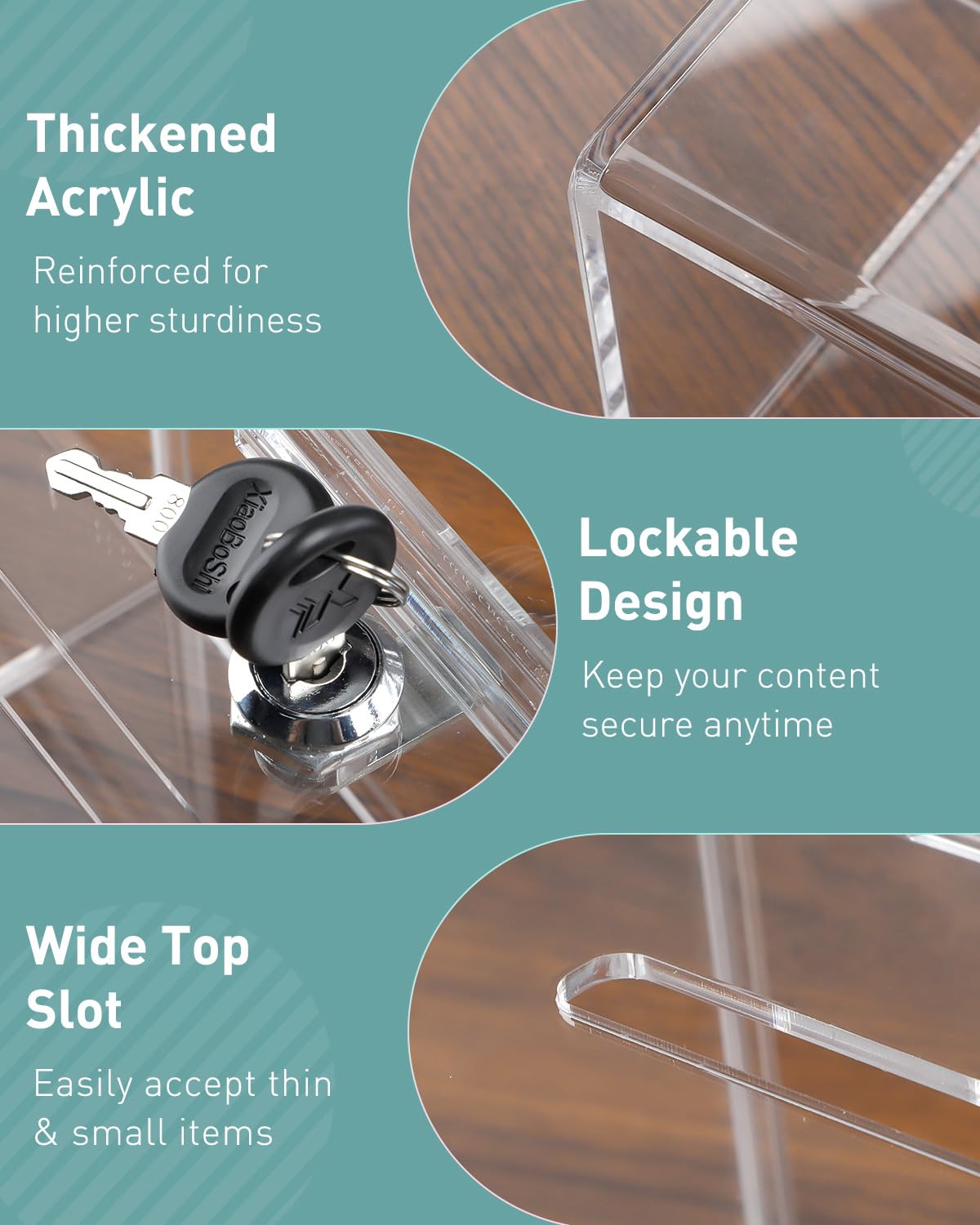 Uniclife 2 pièces Boîte de dons en métal pour collecte de fonds, boîte à suggestions avec fente et serrure, urne noire, conteneur de stockage, 16,3 cm x 11,9 cm x 10,2 cm Idéal pour différentes occasions telles que les choix, les collectes de fonds, les activités scolaires, les fêtes caritatives, etc Tirelire Sécurisée Métal Uniclife Boîte à Propositions Pour Dons Et Urnes - Serrure à Combinaison - Boîte Aux Lettres Boîte à Propositions Vote Robuste et résistant : fabriqué en fer givré robuste, la boîte à propositions résiste de manière fiable aux traitements bruts et à une utilisation fréquente. Gardez toujours vos collections en sécurité pour garantir leur intégrité Il suffit d'écrire ou d'imprimer sur n'importe quel morceau de papier et de le glisser à l'intérieur pour clarifier votre thème d'activité en un coup d'œil Modèles de propositions de collecte de fonds pour gagner les cœurs et... Uniclife Boîte De Donation En Acrylique Avec Serrure Et Support Pour Panneau De Vote Transparent Avec Fente En Plastique Pour Collecte De Fonds Vote Collection De Conseils Caritatifs 157 X 119 X Idéal comme boîte à dons, urne, boîte à propositions, boîte à pourboires, tirelire, etc. Équipé d'une serrure en métal sécurisée, l'urne peut être ouverte qu'avec la clé. Et son corps noir profond assure un maximum d'intimité et de discrétion.