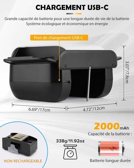 Devenez un maître du jeu de cartes, pris en charge par le mélangeur de cartes MEXGCOM fiable Avertissement De Sûreté / Cette machine à mixage pratique et efficace a été spécialement développée pour les besoins des amateurs de jeux de cartes. Dites au revoir au mélange long et manuel et obtenez le mélangeur MEXGCOM Map, ce qui permet d'économiser du temps et des efforts. Parfait pour les professionnels et les joueurs de passe-temps Le mélangeur de cartes MEXGCOM convient à 1-2 ponts et en plastique ABS robuste, ce qui le rend durable et convivial. Mélangeur de cartes électrique 2 en 1, alimenté par USB, fonctionne sur piles, 2 jeux de cartes de poker automatique, économise du travail, pour la maison, les fêtes, les clubs, les jeux 【Batterie de 2000 mAh】 Aucun changement de batterie nécessaire! Même avec une batterie vide, le mélangeur peut être utilisé via un câble USB, afin que votre jeu ne soit jamais interrompu - que ce soit à la maison ou en déplacement Mélangeur Électronique De Cartes - Noir - Uniquement Pour Cartes Standard - Jeux - Jouets Mélangeur de cartes automatique 2000 mAh Rechargeable Silencieux Électrique Machine de distribution de cartes de poker Outil de distribution de cartes Équipement de casino – acheter les meilleurs produits dans la boutique Ne soyez pas arrêté par des écarts inutiles lorsque vous mélangez et ne vous amusez pas à un niveau complètement nouveau avec ce produit de haute qualité. Peu importe que vous souhaitiez jouer au poker, à l'ONU, à Skip Bo ou à Skyjo, ce mélangeur de cartes garantit que le mélangeur ne résulte pas de temps. Mélangeur de cartes - 2 jeux - Machine à mélanger - Mélangeur de cartes - Électrique -... | bol Grâce à la simple opération à un bouton, vous pouvez mélanger vos cartes pour le prochain jeu en quelques secondes. 【Moteur Haute Performance】 Le mélangeur de cartes est équipé d'un moteur à vitesse haute moderne qui produit jusqu'à 10 000 tr / min - il reste étonnamment silencieux. Description du produit Répondez aux attentes de vos clients dans un mélangeur de cartes électriques avec le mélangeur de cartes MEXGCOM. Notre équipe répond dans les 24 heures avec une offre individuelle