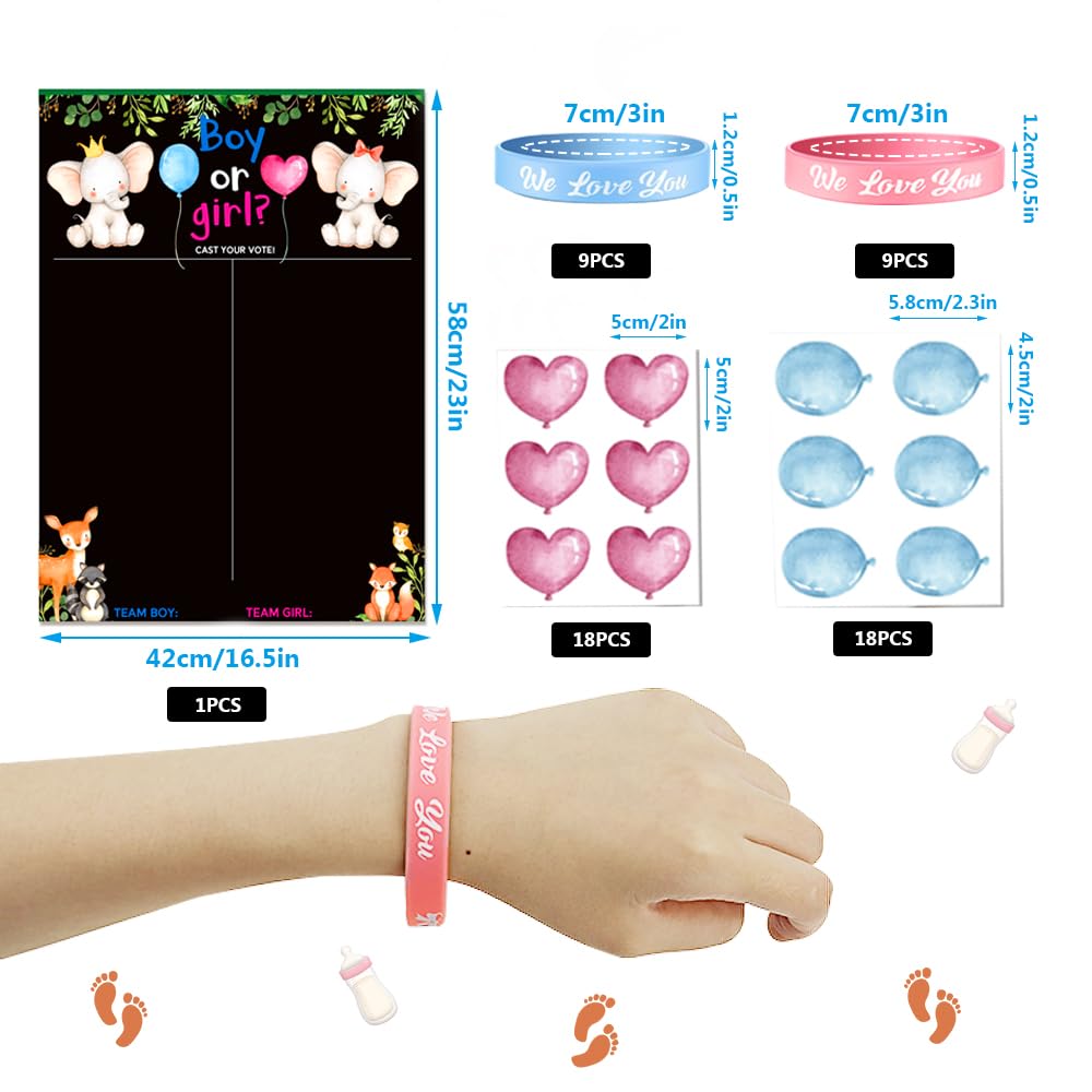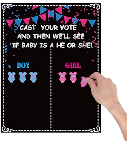 Jeux Baby shower en français à imprimer - Annonce sexe - Cartes Affiche Vote Ballons Bracelets BLOOMWIN Jeux Gender Reveal Party Fléchettes, Gender Reveal Idées Games Kit Révélation Sexe Bébé Annonce sexes bébé mesure 62 x 58 cm, l'autocollant bleu mesure 5,8 x 4,5 cm, l'autocollant rose mesure 5 x 5 cm et le bracelet mesure 7 cm de diamètre. * Si vous rencontrez des problèmes lors de l'achat, n'hésitez pas à nous contacter par e-mail et nous vous répondrons dès que possible ! 👶🏻【Jeu merveilleux pour accueillir le bébé】 : Ce set de révélation du sexe est idéal pour décorer les baby showers, les fêtes de révélation du sexe et les baby showers, à la fois pour rendre votre fête plus colorée et pour faire interagir et participer tout le monde à ce jeu amusant et gratifiant qui consiste à deviner le véritable sexe de votre bébé et à passer une bonne journée ensemble. Qu'est-ce qu'une Gender Reveal Party ? La fête de révélation de Camille 👶🏻【Cadeau idéal pour les futures mamans】 : Vous attendez tous la naissance d'un garçon ou d'une fille ? Faites entendre votre voix, une surprise vous attend ! Jeux Baby Shower à mprmer 30 Actvtés Baby Shower En Franças à... 🥰【Matières premières de haute qualité】 : Le poster et les autocollants sont fabriqués en papier couché, qui est sûr et respectueux de l'environnement, imperméable et résistant aux rayures, et le bracelet est fabriqué en silicone, qui est doux et ne se déforme pas facilement. Plus tard, lors de la baby shower, l'hôte peut annoncer le sexe du bébé et révéler l'équipe gagnante.