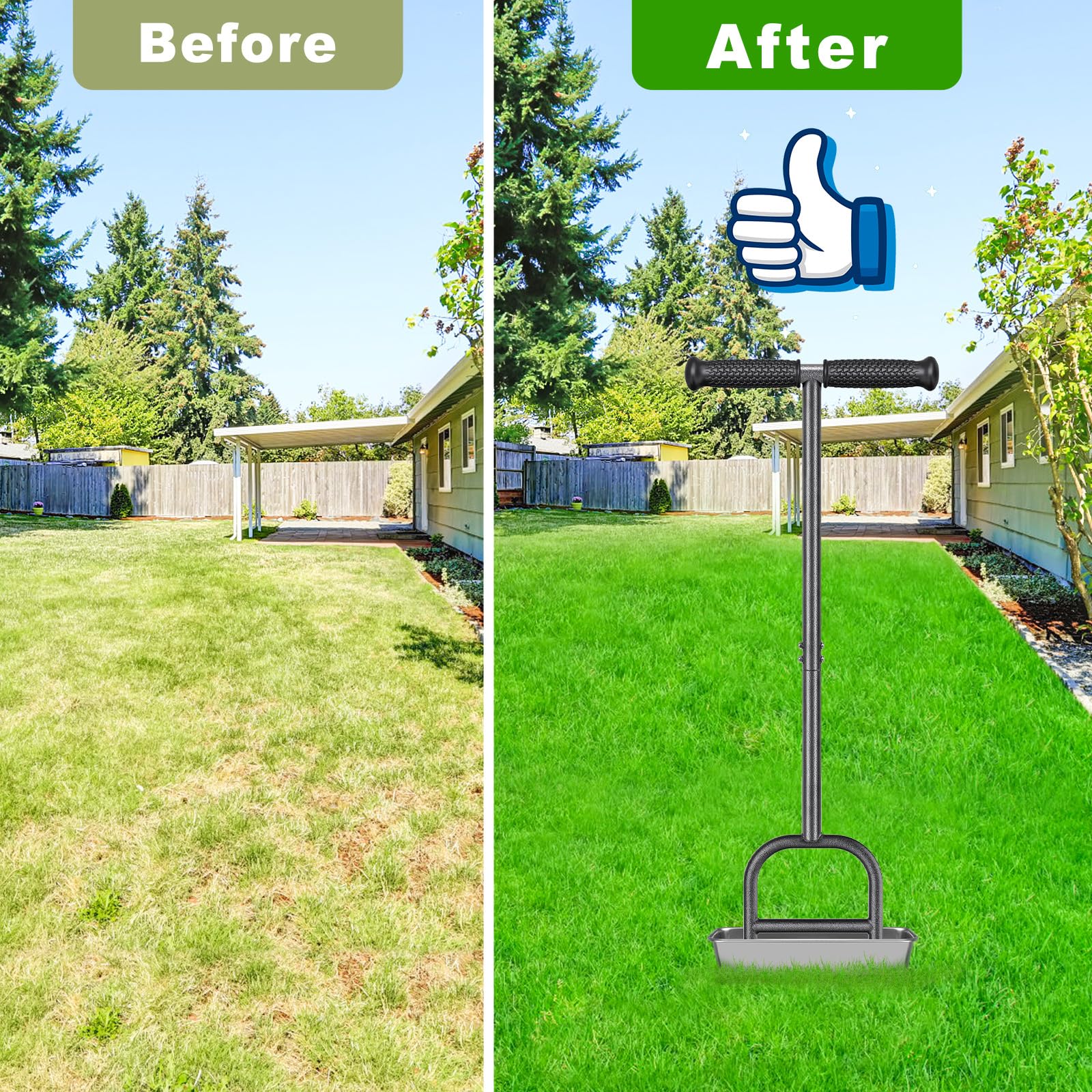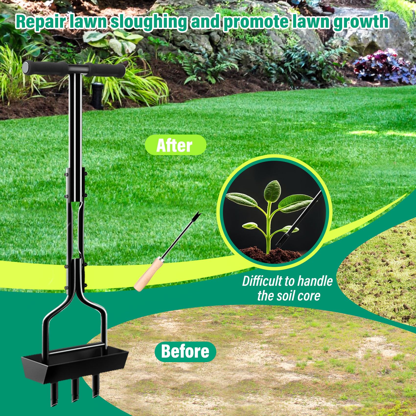 Confort ergonomique : la poignée ergonomique en caoutchouc réduit la fatigue de la main et permet un travail prolongé avec un minimum de charge. Ainsi, vous n'avez plus besoin de ramasser les piliers de terre lâches après le nettoyage de la pelouse. Lifeswell Aérateur de carottage de pelouse, aérateur Manuel à 4 cœurs en Acier Inoxydable pour aération de Cour et de pelouse, Outil d'aération Avec cet aérateur de gazon manuel, vous pouvez aérer la pelouse sans avoir à vous baisser, ce qui ménage votre dos et minimise l'effort nécessaire à l'entretien de la pelouse Le design conique des pointes minimise les blocages et assure une ventilation uniforme et efficace Walensee Aérateur de carottage de pelouse, bouchon de gazon anuel à Service client : si vous avez des questions pendant le processus d'achat ou si vous rencontrez des problèmes après l'utilisation du produit, n'hésitez pas à nous contacter. Nous vous répondrons dans les 24 heures Bac Jardin Aérateur De Pelouse, Aérateur Manuel Amélioré Avec Poignée En Acier Aérateur Pelouse 4 dents tranchantes permettent à l'aérateur de pénétrer beaucoup plus facilement dans le sol, ce qui rend l'entretien du jardin rapide et facile L'aérateur pour gazon dispose de quatre bouchons de noyau en acier inoxydable (8,9 cm de long, 1,3 cm de diamètre) qui pénètrent profondément dans le sol compacté et permettent ainsi aux racines un meilleur accès à l'air, à l'eau et aux nutriments, les plantes poussent mieux Avec bac de récupération : aérateur de pelouse manuel avec bac de récupération qui peut récupérer automatiquement les bouchons éjectés dans le compartiment.