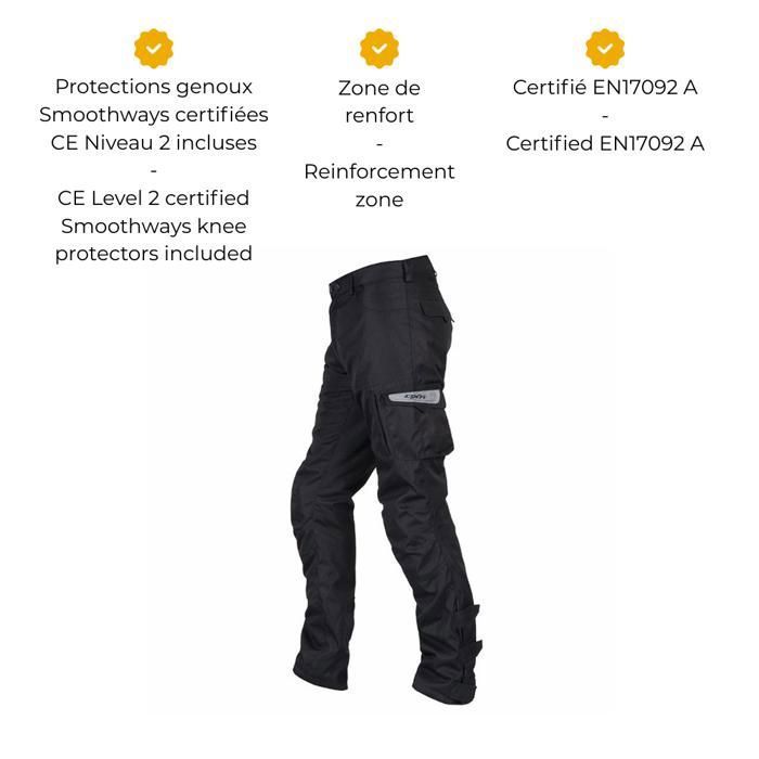 Jean Moto Certifié BOOST MOTOBLOUZ homme Noir - Auto Poche prévue pour protections hanches DXR certifiées CE niveau 2., INTERIEUR ET CONFORT: Matière intérieure 100% polyester douce et respirante. Coupe Slim Cargo Jean Moto Certifié Moto ARVA MOTOBLOUZ Femme Noir - Auto Pantalon Cargo Moto Urbain Protections : Protections genoux préformées perforées certifiées CE de niveau 1 Protection amovible par l'extérieur par zip Poche pour protections hanches MOTOBLOUZ certifiées CE de niveau 2 Veillez à retirer les protections avant le lavage sur l'envers de votre pantalon Les + : Coupe slim (près du corps) Tissu ultra-agréable, pour rouler confortablement Coupe cargo Fermeture par zip et bouton Empiècement dos accordéon 2 poches plaquées devant 1 poche zippée devant Les protections genoux peuvent se retirer par l'extérieur pour porter le pantalon cargo toute la journée confortablement Zip pour faciliter l'enfilage des bottes Demi-zip de raccordement pantalon Notre conseil : On reste zen ! Confortable au quotidien avec poches pratiques et protections genoux amovibles pour un port prolongé hors moto. CERTIFICATIONS ET NORMES: Certifié CE selon la norme EN 17092 et classé A, garantissant un bon niveau de protection pour les motards urbains et routiers. Tous les pantalons et jeans moto sur Motoblouz - textile, cuir, jeans... Pantalon Remo Tucano Urbano moto : , pantalon classique de moto Coupe slim près du corps au look urbain et pratique, avec tissu agréable et empiècement dos accordéon. Zip pour faciliter l’enfilage des bottes et demi-zip de raccordement pantalon pour plus de confort. DESIGN ET CONCEPTION: Pantalon cargo moto textile homme DXR WAYNE en coton 98% et élasthanne 2%.