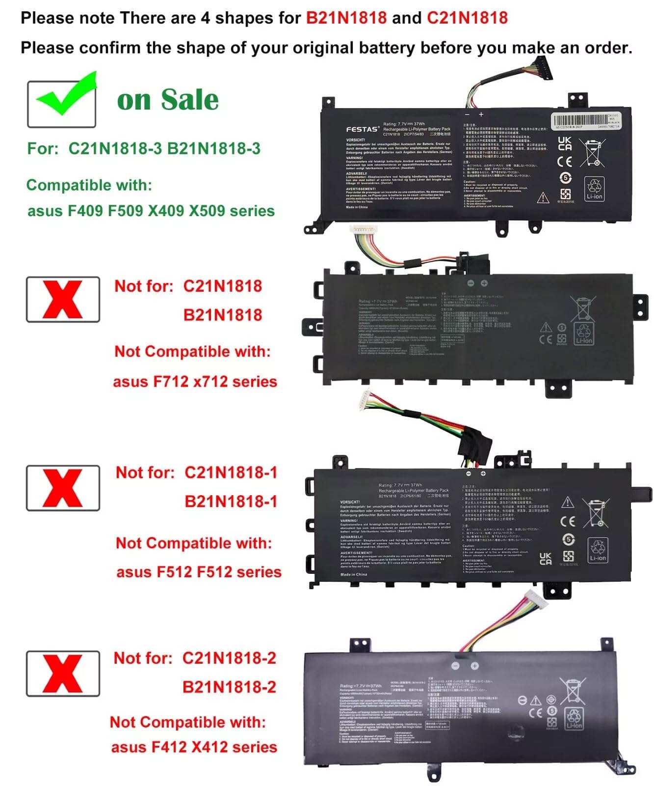 Description du produit Extérieur: Avec une batterie FESTAS, votre ordinateur portable va connaître une nouvelle vie,Rendez votre plaisir à l'extérieur encore plus grand. Batterie Asus Vivobook B21N1818-3 C21N1818-3 Batterie D'ordinateur Portable Pour Remplacement Batterie Portable ASUS Travail intérieur: Nouvelle batterie, nous avons soigneusement vérifié chaque batterie pour assurer la sécurité pendant la charge et le fonctionnement,Pour que vous passiez chaque journée de travail avec plaisir. Numéros de pièces compatibles: Compatible avec la batterie: C21N1818-3,B21N1818-3., Le model de les portable compatibles: Compatible with Asus Laptop Models:(You can press Ctrl+F to find the model you want) Convient pour les ordinateurs portables : Choses à noter: La batterie que nous produisons est c21n1818 - 3, qui n'est pas compatible avec c21n1818, c21n818 - 1 et c21n1818 - 2., Veuillez ouvrir le couvercle arrière de votre ordinateur portable pour vérifier et confirmer le modèle et l'apparence de votre batterie d'origine avant de passer votre commande. Performance de sécurité de la batterie: 1., Protection contre la surchauffe, 2., Protection contre les surintensités, 3., Protection contre les surtensions, 4., Protection contre les surcharges, 5., Protection contre les décharges excessives, 6., Protection contre les courts - circuits Compatibilité avec batterie: C21N1818-3,B21N1818-3. (Choses à noter:La batterie que nous produisons est c21n1818 - 3, qui n'est pas compatible avec c21n1818, c21n818 - 1 et c21n1818 - 2 Choses à noter: Veuillez ouvrir le couvercle arrière de votre ordinateur portable pour vérifier et confirmer le modèle et l'apparence de votre batterie d'origine avant de passer votre commande. Compatible avec Asus VivoBook 14 D409 D409B D409BA D409D D409DA D409DJ D409DL Series, Compatible avec Asus VivoBook 14 M409 M409B M409BA M409D M409DA M409DJ Series, Compatible avec Asus VivoBook 14 F409 F409DA F409J F409JA F409JB F409F F409FA F409FB F409FJ F409U F409UA F409UB Series, Compatible avec Asus VivoBook 14 A409 A409DA A409M A409MA A409F A409FA A409FB A409FJ A409J A409JA A409JB A409JP Series, Compatible avec Asus VivoBook 14 X409 X409DA X409BA X409F X409FA X409FB X409FL X409FJ X409J Series, Compatible avec Asus VivoBook 14 X409JA X409JB X409JP X409M X409MA Series, Compatible avec Asus VivoBook 15 D509 D509B D509BA D509D D509DA D509DJ D509DL Series, Compatible avec Asus VivoBook 15 M509 M509B M509BA M509D M509DA M509DJ Series, Compatible avec Asus VivoBook 15 F509 F509DA F509J F509JA F509JB F509F F509FA F509FB F509FJ F509U F509UA F509UB Series, Compatible avec Asus VivoBook 15 A509 A509DA A509M A509MA A509F A509FA A509FB A509FJ A509J A509JA A509JB A509JP Series, Compatible avec Asus VivoBook 15 X509 X509DA X509BA X509F X509FA X509FB X509FJ Series, Compatible avec Asus VivoBook 15 X509FL X509J X509JA X509JB X509JP X509M X509MA Series, Compatible avec Asus VivoBook 14 X415 X415D X415DA X415DAP X415E X415EA X415EP X415F X415FA X415FAC Series, Compatible avec Asus VivoBook 14 X415J X415JA X415JAB X415JP X415M X415MA Series, Compatible avec Asus VivoBook 14 D415 D415D D415DA D415U D415UA Series, Compatible avec Asus VivoBook 14 M415 M415D M415DA M415U M415UA Series, Compatible avec Asus Vivobook 14 F415 F415E F415EA F415J F415JA F415M F415MA Series, Compatible avec Asus VivoBook 14 A415 A415E A415EA A415J A415JA A415D A415DA Series, Compatible avec Asus VivoBook 14 S415 S415E S415EA S415J S415JA S415D S415DA Series, Compatible avec Asus VivoBook 15 D515 D515D D515DA D515U D515UA Series, Compatible avec Asus VivoBook 15 M515 M515D M515DA M515U M515UA Series, Compatible avec Asus VivoBook 15 F515 F515E F515EA F515J F515JA F515M F515MA Series, Compatible avec Asus VivoBook 15 A515 A515E A515EA A515EP A515J A515JA A515D A515DA Series, Compatible avec Asus VivoBook 15 S515 S515E S515EA S515J S515JA S515D S515DA Series, Compatible avec Asus VivoBook 15 X515 X515D X515DA X515DAP X515E X515EA X515EP X515F Series, Compatible avec Asus VivoBook 15 X515FA X515FAC X515J X515JA X515JAB X515JP X515M X515MA Series, Compatible avec Asus VivoBook 15 R565 R565E R565EA R565EP R565J R565JA R565JF R565JP R565F R565FA R565M R565MA Series. La batterie que nous produisons est c21n1818 - 3, qui n'est pas compatible avec c21n1818, c21n818 - 1 et c21n1818 - 2., batteries d'ordinateurs portables Spécification: Type de batterie: Li-ion, Voltage: 7., 7V,compatible 7., 6V, Capacité:37Wh/4805mAh, Coleur : Noir Comment protéger une nouvelle batterie? 1., Maintenez 40% à 80% de charge, 2., Ne le laissez pas chauffer quand il est branché, 3., Gardez la ventilation, rangez - la dans un endroit frais, 4., Ne le laissez pas atteindre zéro, 5., Remplacez la batterie lorsque l'état de santé de la batterie est inférieur à 80%, Chimine: Li-ion Voltage:7., 7V Capacité:37Wh/4805mAh Coleur : Noir Emballage inclus: 1x Remplacement Battery Emballage inclus: 1x La batterie de remplacement Battery, Dimensions :mm, Cellules de batterie: 3 Batterie portable compatible avec Asus B21N1818-3 C21N1818