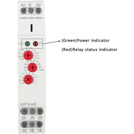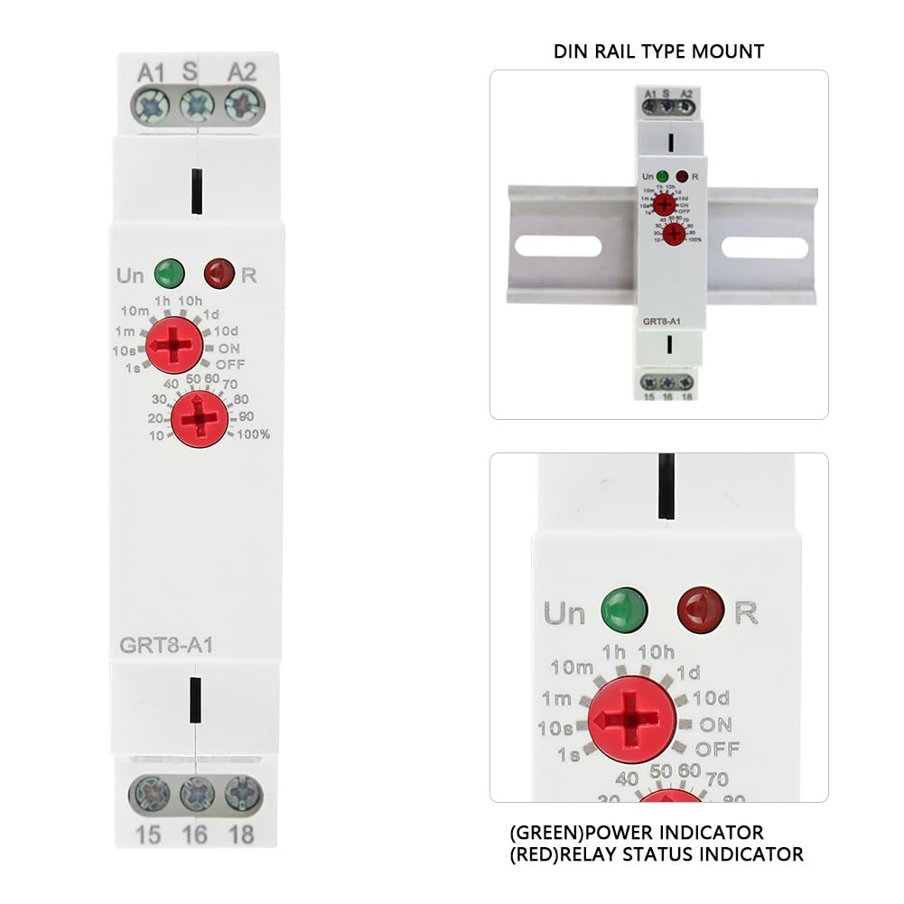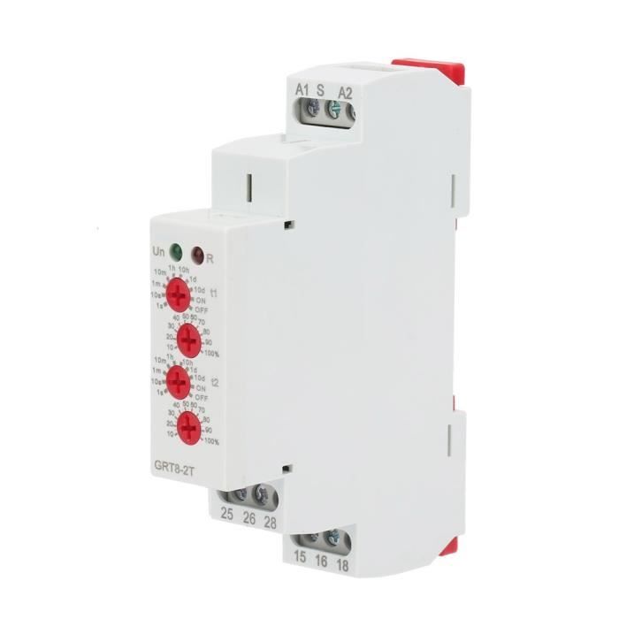 【AFFICHAGE DE L'INDICATEUR LED】:L'état de fonctionnement du relais temporisé 220v est indiqué par l'indicateur LED, qui est intuitif et clair. 【INSTALLATION FACILE】:Le électronique minuteur retarder marche relais peut être installé sur un rail DIN 35 mm, avec une petite taille et une installation et un retrait faciles. Relais Temporisé à La Mise Sous Tension, GRT8-A1 Mini Relais Temporisé à La Mise Sous Tension Grt8 A1 Mini Relais Temporise A La Mise Sous Tension Montage Sur Rail Din Ac 220 V Plage De Temporisation Tres Large 01 S 10 H 84619186 【PLAGE DE RETARD】:Il a une tension de fonctionnement AC/DC 12V-240V. 【RELAIS À FONCTION DE RETARD】:Il s'agit d'un relais de retard de mise sous tension à fonction unique. TMISHION Relais temporisé Relais de Temps 4 Modes de Retard Composant Plage de retard ultra-large, 0,1 s - 10 jours (10 réglages), retarder mise sous tension Relais temporisé pour répondre aux besoins de différents équipements. Spécification:Fonction : Délai ONTension d'alimentation nominale : AC/DC 12-240 V (50-60 Hz)Borne d'alimentation : A1-A2Consommation électrique : AC 0,09-3 VA/CC 0,05-1,7 WMéthode de réglage : boutonIndicateur d'alimentation : LED vertePlage de délai : 0,1 s à 10 jours, normalement ouvert, normalement ferméPrécision de réglage : 10 %Contact de sortie : 1 x SPDT, 16 A/AC1, 250V AC/24V CCPuissance de commutation minimale : 500 mWIndication du relais de sortie : LED rougeDurée de vie mécanique : 1x107Temps de réinitialisation : Max 200 msTempérature de fonctionnement : -20℃~55℃Méthode de montage : rail DIN 35 mmAltitude de montage : ≤2000mPoids : environ 75 g/2,6 ozListe des packages:1 * Relais temporisé de mise en marche FHE-Relais temporel Relais temporisé 22 fermé GRT8 K2 Relais...