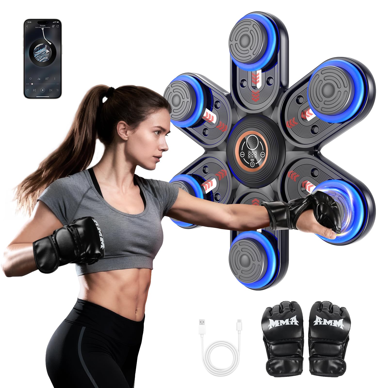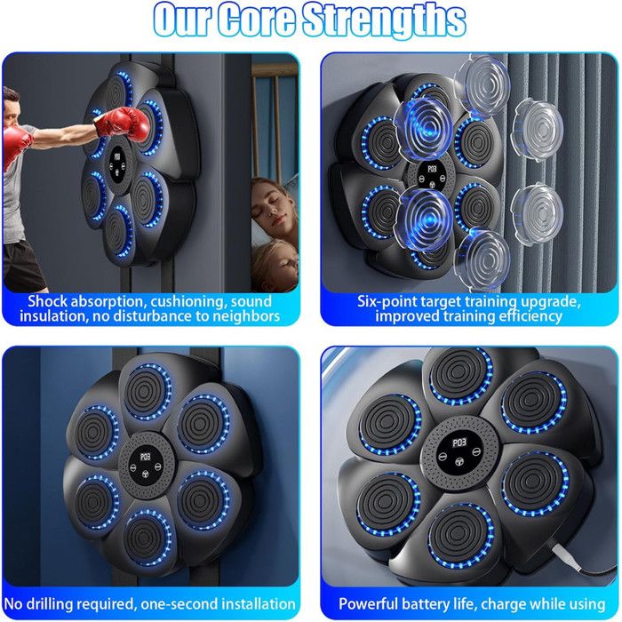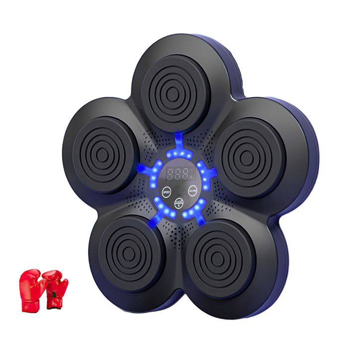 【Expérience réaliste 6+2 coups】Cette Machine de Boxe Musicale innovante propose 6 zones de frappe et 2 cibles supplémentaires pour les crochets gauche et droit. Machine De Boxe Immersive Soulagement Stress Machine De Boxe Musicale Semai - LED Bluetooth Avec Gants, 9 Vitesses Gants Boxe Inclus Appareil Fitness LED Bluetooth Gants 【9 modes d’entraînement pour tous les niveaux】Que vous soyez débutant ou sportif confirmé, cette machine de boxe musicale adulte offre 9 programmes variés allant de l’échauffement léger aux séances intenses. 45 dB), idéale pour s’entraîner en appartement ou le soir sans déranger les voisins. 【Avec gants de boxe & rembourrage confort】Un paire de gants respirants est incluse. Gants inclus & longue autonomie]Nous incluons une paire de gants de boxe de qualité pour protéger vos mains et offrir un confort optimal. Avec une charge rapide USB-C et une batterie performante de 1200 mAh, votre music boxing machine se recharge rapidement et offre une autonomie impressionnante Trouvez toujours le défi adapté à votre niveau. La charge rapide Type-C vous permet de reprendre vos séances rapidement. Ajustez la hauteur selon vos besoins. Les effets lumineux LED réagissent à chaque frappe et créent une ambiance rythmée et motivante. La surface douce et amortissante protège vos mains et poignets pour un entraînement sûr et confortable. 【Grande surface de frappe & conception robuste】Avec sa large zone de frappe, la boxing machine assure des impacts précis. Machine De Boxe Machine Boxe Musicale Bluetooth - 9 Vitesses 10 Modes - Affichage LED - Installation Murale Sans Percage Music Boxing