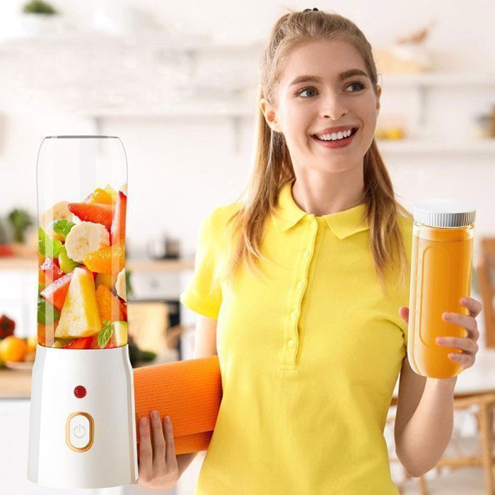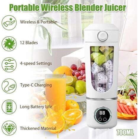 Caractéristiques : Nom de l'article : mélangeur portable. Ce mixeur portable de jus frais a 400 ml, et ne pèse que 300 g, ce qui signifie que vous aurez une excellente expérience à la maison et au bureau, à la salle de sport, en voyage ou en entraînement Capacité de la batterie : 1500 mAh. Contenu du paquet : 1 mélangeur portable., 1 couvercle supplémentaire Il est idéal pour les sorties quotidiennes, les excursions à la plage, le travail ou le fitness. Mixeur Portable 12 Lames 4 Vitesses Mini Mixeur Portable Usb Avec 6 Lames Pour Voyage, Voiture, Salle De Mixeur Rechargeable Type C 1500mAh Interface de charge : type C. Facile à utiliser : le mixeur à smoothie a une fonction sans fil, il suffit d'appuyer sur le bouton de sélection de fonction à gauche et d'appuyer sur le bouton d'alimentation à droite pour commencer à mélanger. Design portable : ce mixeur personnel a une capacité de 700 ml et mesure 26,9 x 9,1 cm, de sorte que vous pouvez profiter de jus frais à tout moment et n'importe où. Remarque : les mesures étant prises à la main, les tailles indiquées peuvent varier de 1 à 3 cm. Vidéos sur Quel est Jus de uits en gros 220V 110V 0.9L Mini extracteur de jus Machine de complément alimentaire Mixeur portable pour cuisine Mélangeur haute vitesse Smoothie De légères variations de couleurs sont possibles en fonction des paramètres de votre écran. Multifonction polyvalent : idéal pour faire des smoothies à portion unique, des mélanges de jus, mélanger des fruits et légumes, préparer du lait en poudre, des boissons protéinées et des aliments pour bébés, ce mini mélangeur est un excellent cadeau pour les amateurs de jus et de voyage