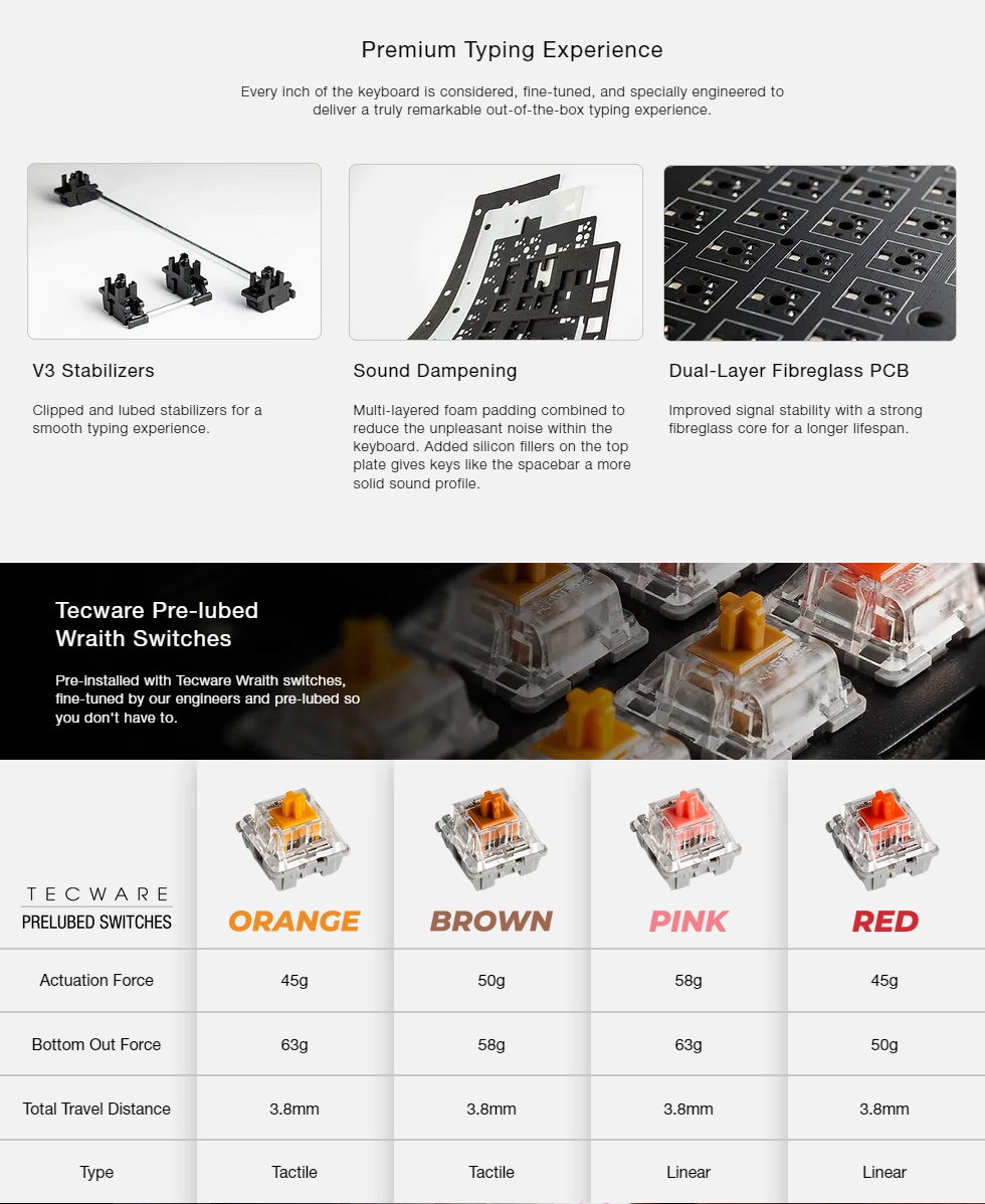 Doté d'une variété d'effets RVB prédéfinis que vous pouvez basculer via les commandes intégrées. Touches ABS à double paroi à double paroi – Touches ABS profilées OEM, moulées par notre processus à double paroi et à double paroi pour être plus épaisses et plus durables que vos touches ABS standard. Clavier Filaire Détachable USB-C Base De Clavier Mécanique Modulaire 87 Touches RVB Avec Logiciel Switches Pré-lubrifiés 10 Meilleures Tecware Phantom 87 Mechanical Keyboard de 2025 Réglez la luminosité, la vitesse, la couleur et la direction selon vos préférences. Touches ABS à double paroi Câble tressé USB-A vers USB-C détachable Prises de commutation à chaud (interrupteurs Wraith uniquement) Tecware le eilleur prix dans Aazon Saveoney.es Suite logicielle complète permettant un contrôle complet du clavier sur la sélection de couleur et l'éclairage, les macros de touches, l'interrogation USB, les effets d'éclairage complets et les mises à jour du micrologiciel. TECWARE Phantom+ Clavier de jeu mécanique Le Phantom RGB dispose de nouvelles touches, commutateurs, plus d'amortissement sonore, d'amortisseurs et de remplissages en silicone installés pour vous donner la meilleure sensation de jeu et de frappe haut de gamme Expérience de frappe haut de gamme : chaque pouce du clavier est considéré, affiné et spécialement conçu pour offrir une expérience de frappe vraiment remarquable. Commutateurs Wraith pré-lubrifiés Tecware : pré-installés avec les commutateurs Tecware Wraith, affinés par nos ingénieurs et pré-lubrifiés pour que vous n'ayez pas à le faire.