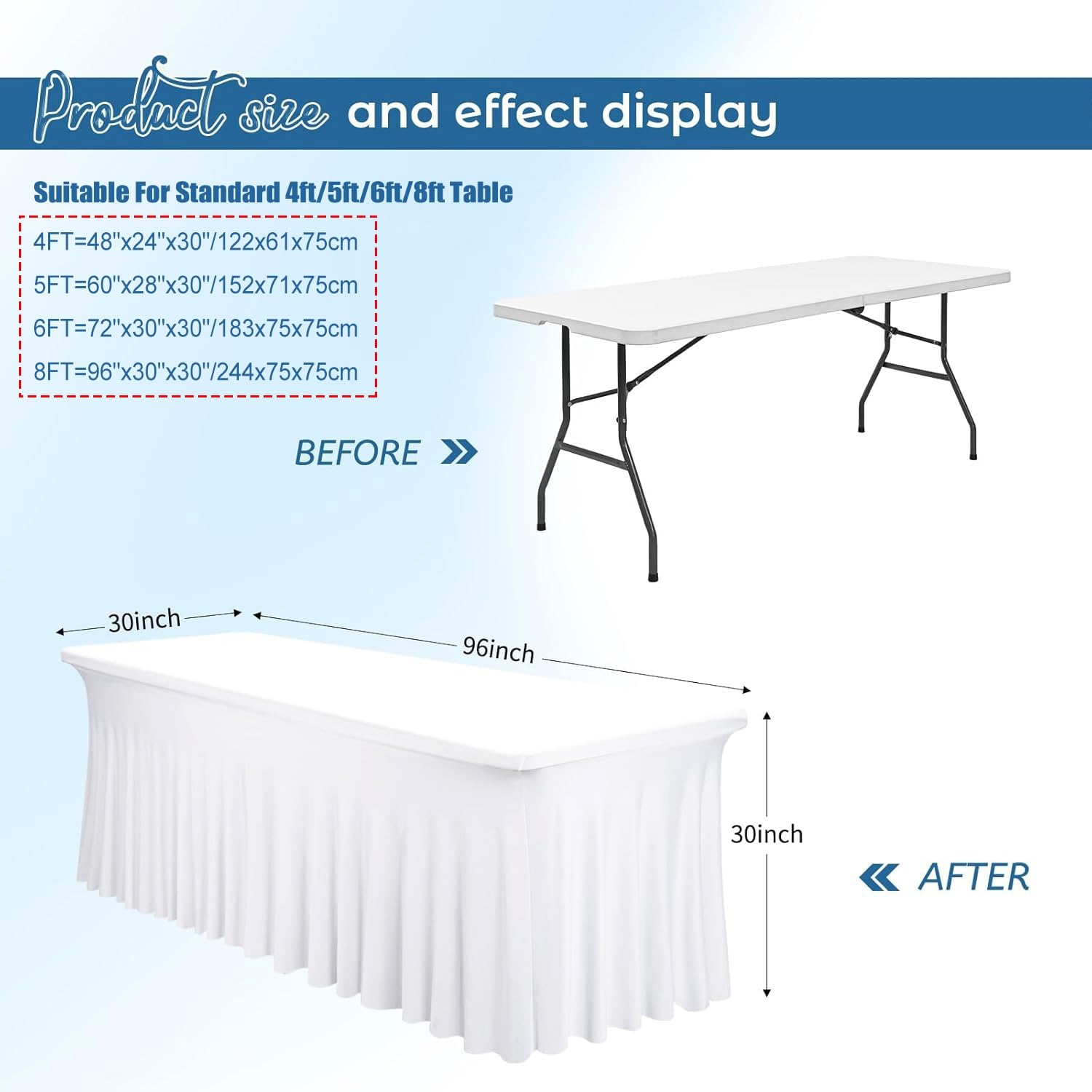 Installation facile et gain de temps : vous pouvez installer vous-même cette nappe extensible. Ne pas utiliser le fer trop chaud. Nappe extensible pour table rectangulaire Vert - Gamm vert Kalavika Nappe de Table Extensible 6FT 183cm rectangle Couverture de... /Longueur de 96(243cm) et Hauteur de 30(76cm), convient aux tables rectangulaires de 8ft., 3., Material: The table cloth made from spandex stretchy fabric, stretchable and durable, wrinkle-free, and stain-resistant. CoFashion Jupe De Table Blanche Et Housse Pour Tables De 1,8 M, En It is a durable and reusable tablecloth., 4., Ajoute de l'élégance à vos Tables: Cette nappe plissée rehaussera votre table. La jupe de table descend jusqu'au sol pour un look élégant et dissimule tous les objets sous la table., 5., Nappe Polyvalente: parfaite pour les tables de fête d'anniversaire, les tables de réception de mariage, les tables d'événements artisanaux, les tables d'exposition, les tables de banquet, les tables de salons professionnels, les révélations de genre, les tables de buffet. Nappe Extensible élasthanne Rectangulaire Nappe Extensible Pour Table Rectangulaire Ivoire - Jardin Nappe Mariage Banquet Fête Dimensions de la table : table rectangulaire standard de 4ft/5ft/6ft/8ft . Instructions de lavage : lavable en machine. Conseils d'entretien : repassage à la vapeur pour éliminer les plis.