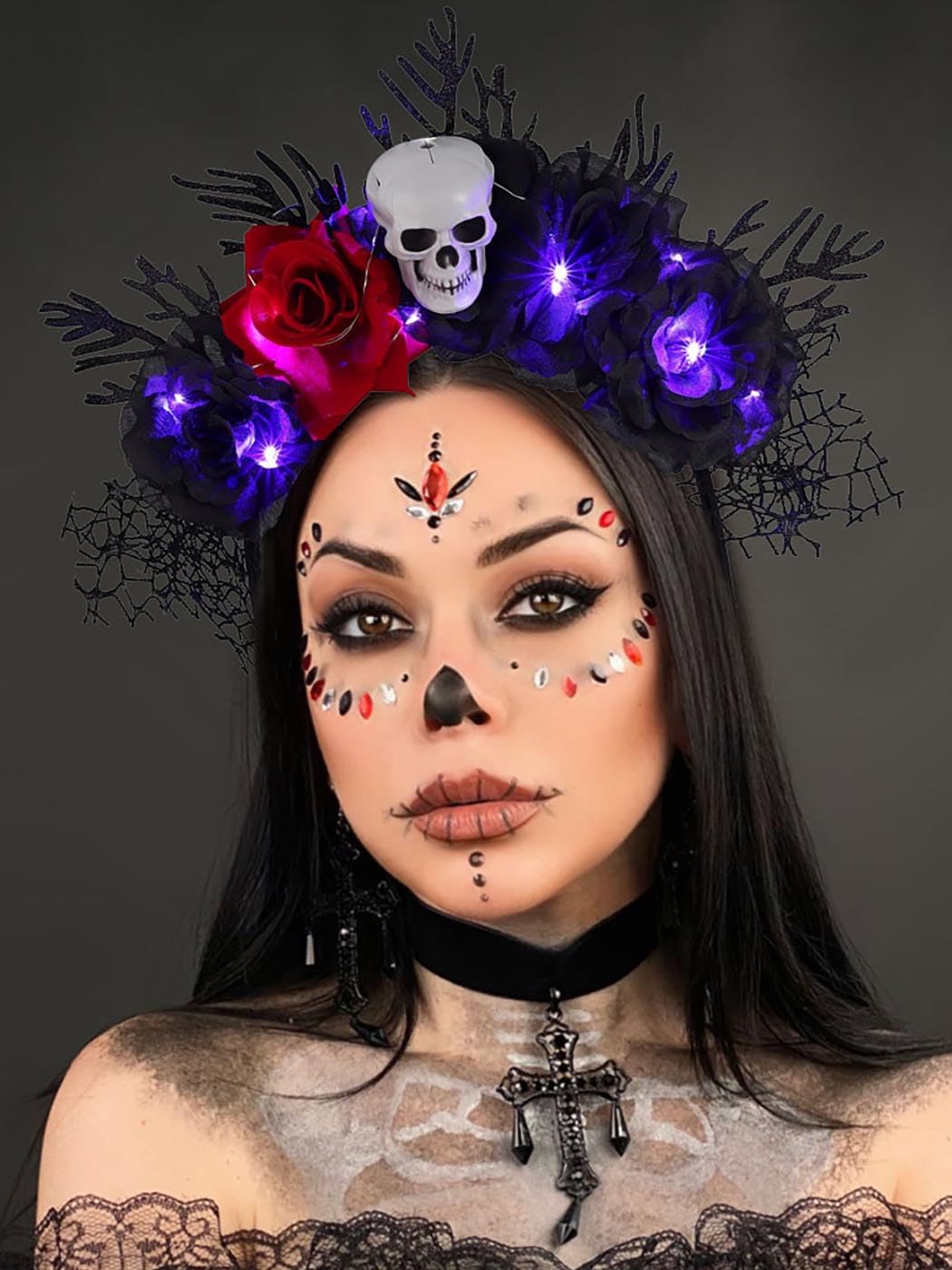 Les lumières LED sur les fleurs peuvent émettre une lumière vive dans l'obscurité. Le bandeau d'Halloween est conçu avec de belles roses artificielles, un crâne et des branches, décoré avec une toile d'araignée et une lumière LED. Léger et confortable à porter Serre-tête LED Rose pour Femme Serre-tête lumineux Rose. Vous rend accrocheur dans la foule et vous aide à gagner des compliments des autres. Le serre-tête en forme de tête de mort sera un choix de cadeau idéal à envoyer à votre amoureuse, petite amie, sœur, cousine, fille, amie lors de fêtes costumées, Halloween et autres festivals. Le bandeau à fleurs LED sera une excellente décoration pour de nombreuses occasions, telles que Halloween, le jour des morts, les fêtes costumées, les spectacles sur scène, les fêtes à thème, la photographie, les festivals, les fêtes costumées, les bals, etc. Coiffe Halloween Crâne Lumineux Motif floral et crâne saisissant : au cœur de cette coiffe captivante se trouve un crâne détaillé, magnifiquement entrelacé de roses veloutées. Masques Halloween tête de mort - La Caverne de Jou Léger et confortable à porter. Cet accessoire d'Halloween idéal vous permettra de devenir la pièce maîtresse de toute soirée effrayante ou célébration du Jour des Morts. Accessoires pour cheveux Jour des Morts Les accessoires pour cheveux Rose pour Halloween sont parfaits pour les fêtes d'Halloween, la cueillette de bonbons, les célébrations du Jour des Morts, les fêtes costumées et le cosplay, les festivals et concerts, ainsi que les séances photo à thème. Bandeaux lumineux avec 3 modes d'éclairage LED, lumière formelle, clignotement rapide, vous pouvez changer la lumière comme vous le souhaitez. Les accessoires pour cheveux raves sont adaptés pour les fêtes, les boîtes de nuit, les concerts, Halloween, les accessoires photo, les fêtes cosplay, etc Serre Tete Lumineux Serre-Tête Lumineux D'Halloween Avec Motif De Tête De Mort Accessoire Cheveux Jour Des Morts Serre-tête Couronne de Roses pour Femme Des LED lumineuses et économes en énergie sont intégrées harmonieusement aux yeux du crâne et aux délicats pétales des roses.