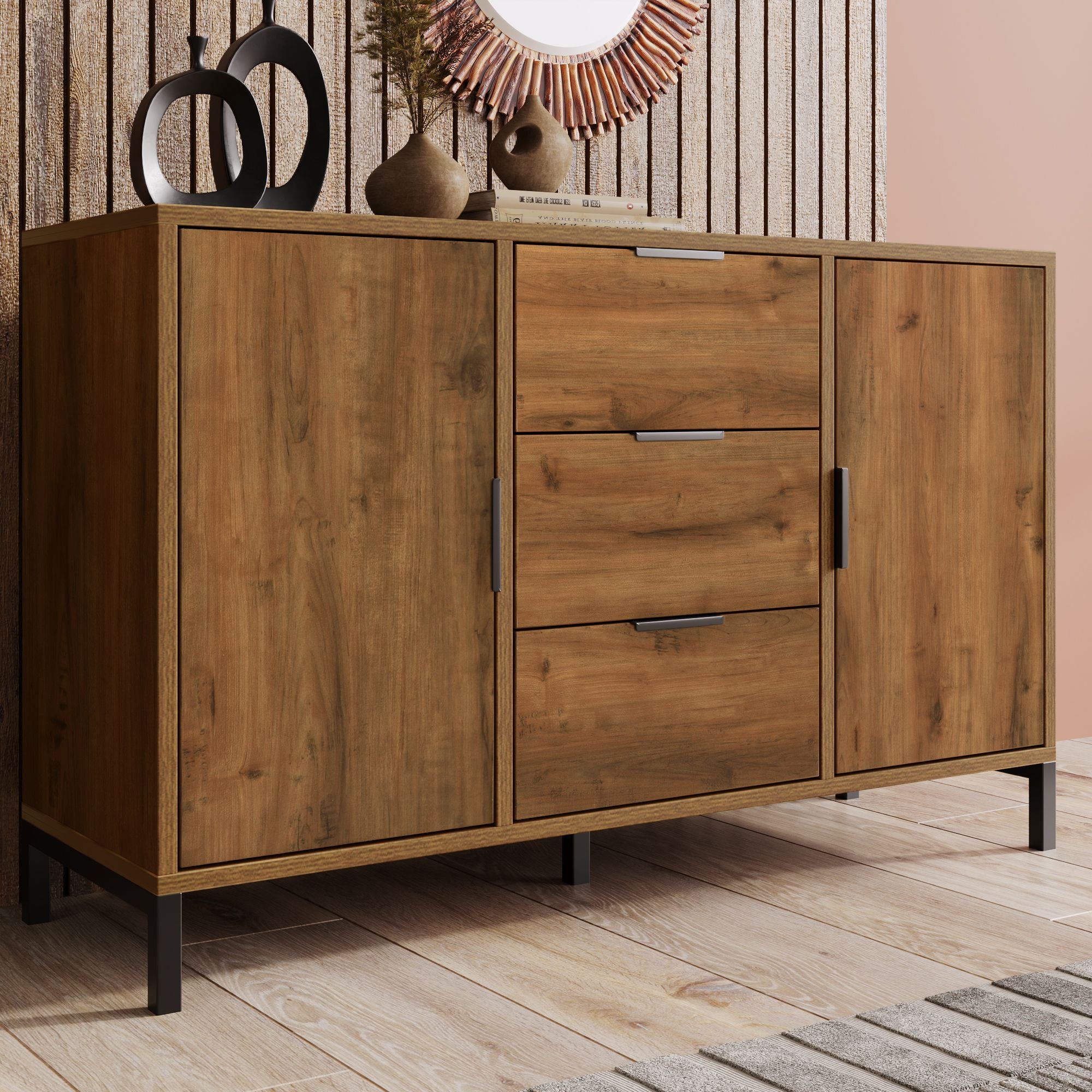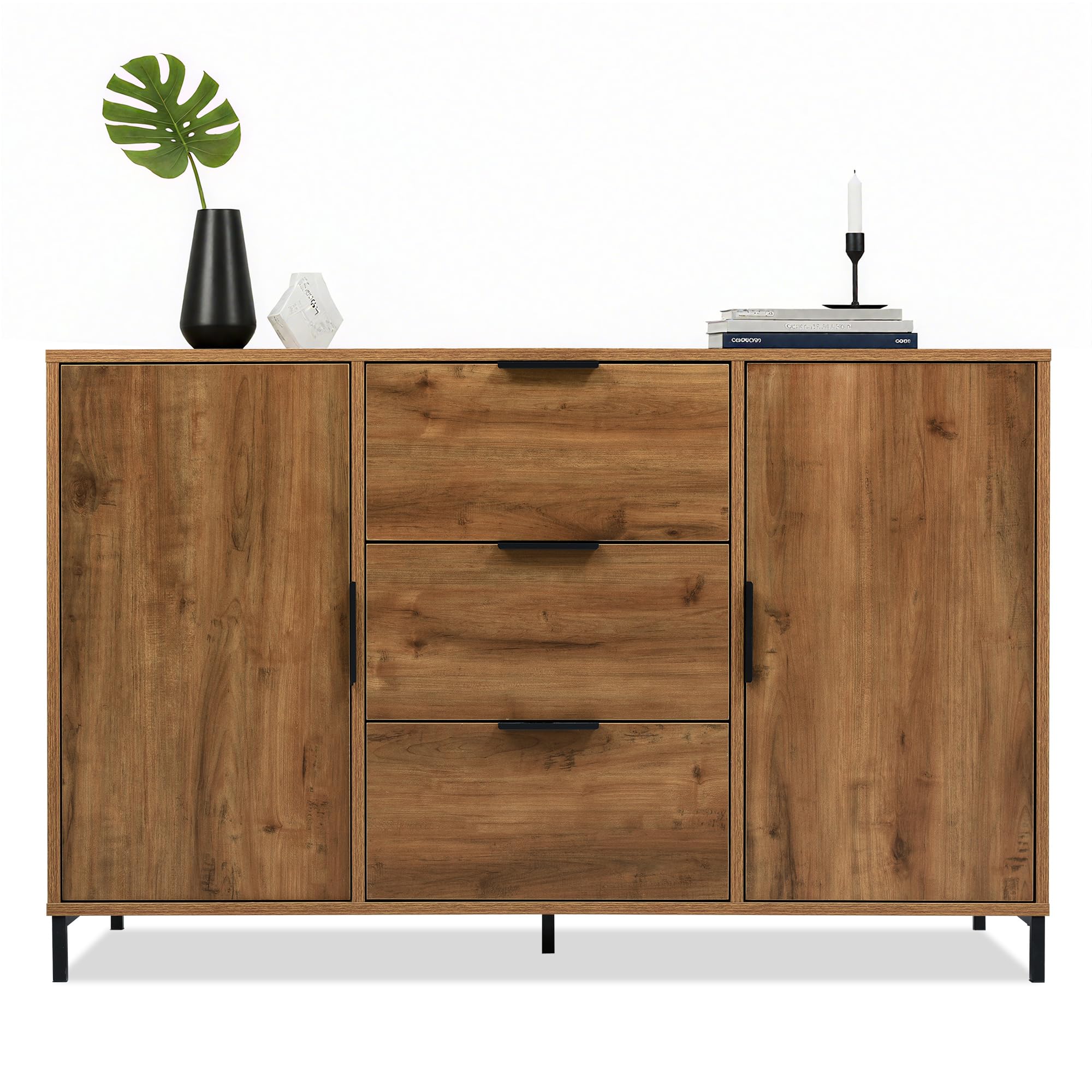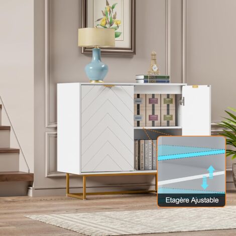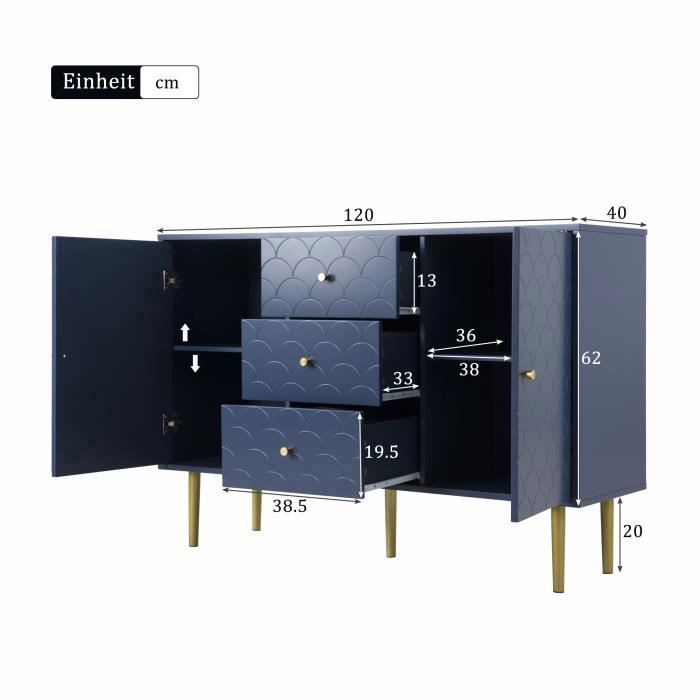 Points forts du produit :- meuble intemporel pour votre salon- parfait pour stocker de livres, de décorations et plus encore- avec 2 portes d'armoire et 3 tiroirs- la technique Push-to-Open permet une ouverture sans poignée- tablette réglable en hauteur à l'intérieur- se nettoie sans effort- des pieds solides garantissent une bonne stabilité- matériel de montage et instructions de montage inclus- assemblage facileDimensions (h x l x p) :- totales : 76,5 x 120 x 40 cm- tiroir intérieur : 10 x 35 x 28,5 cm chacun- compartiment intérieur : 58,5 x 75 x 35 cm- tablette (l x p) : 75 x 30 cm- hauteur des pieds : 15 cmMatière :- corps : MDF- structure : métalCouleur :- corps : effet chêne, clair- structure : noirContenu de la livraison :1 x sideboardProduit de la marque :[en., casa] La surface facile à entretenir permet un nettoyage simple. Buffet 3 tiroirs 2 portes Finn Blanc et Bois Buffet armoire, 120 x 40 x 76 cm, commode avec 3 tiroirs et 2 portes... Design élégant et fonctionnel : Ce meuble au style intemporel s'intègre harmonieusement dans tout salon et offre un espace de rangement pratique grâce à ses deux portes et trois tiroirs. Buffet en bois avec 3 tiroirs et 2 portes Rangement flexible et bien pensé : Une étagère intérieure réglable en hauteur s’adapte à vos besoins, tandis que le plateau supérieur accueille aisément plantes et objets déco. Stabilité assurée : Conçu en MDF et métal robuste, avec des pieds solides assurant un bon maintien sur tous types de sols. Buffet Tiroirs étagère Réglable En.casa] Buffet Élégant Avec 4 Portes Et 2 Tiroirs Meuble De Rangement Armoire Basse Meuble TV Pour Salon Chambre Bureau MDF 75 X 140 X 40 Cm Effet Chêne Système Push-to-Open Sans Poignée Les salissures s'enlèvent aisément avec un chiffon humide. BuffetMeuble de salon élégant et pratique, idéal pour le rangement. Grâce au système Push-to-Open intégré, les portes polyvalentes s'ouvrent sans poignées en appuyant légèrement dessus.