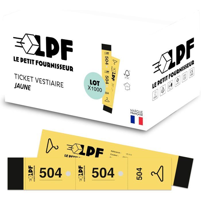 Ils sont disponibles en 6 couleurs (Blanc, Rouge, Bleu, Vert, Jaune et Rose), offrant ainsi la possibilité de différencier les zones ou d’adapter l’organisation à vos besoins spécifiques. Tickets Vestiaire Papier épais 160g LPF 1000 Tickets Vestiaire 3 Parties - Perforés Pour Cintre Ticket Vestiaire Optimisez l’organisation de votre vestiaire avec les tickets vestiaire LPF LE PETIT FOURNISSEUR, conçus pour assurer une gestion fluide et efficace lors de tous types d’événements. Idéaux pour les hôtels, restaurants, salles de spectacle, discothèques, salons et événements privés, ces tickets vestiaire ELVE sont une solution fiable et pratique pour assurer un service professionnel et structuré. FABRIQUÉ EN FRANCE AVEC PAPIER ÉCORESPONSABLE : Ces tickets sont produits en France, avec du papier issu de forêts gérées durablement. TICKETS VESTIAIRE PERFORÉS EN 3 PARTIES : Conçus pour une gestion efficace du vestiaire, chaque ticket comprend un talon principal, un coupon client et un coupon cintre perforé pour une identification rapide et sécurisée des vêtements confiés. Un coupon client, remis à l’utilisateur pour récupérer son vêtement. Une alternative plus écologique et responsable pour vos événements et établissements professionnels. Leur format 3x20 cm offre une lisibilité parfaite, évitant toute confusion dans la gestion du vestiaire. Chaque lot contient 500 tickets perforés, répartis en 10 carnets de 50, permettant un suivi précis des vêtements confiés. Les tickets sont numérotés de 1 à 500 ou 501 à 1000, garantissant une gestion simplifiée et une récupération rapide. Bloc de 50 tickets vestiaire 3 x 20 cm Rose Lot de 20 (de 1 à 1000 500 ticket vestiaire | 5X14CM | Perforés et prédécoupés - 3 parties... Un coupon cintre perforé, permettant d’attacher facilement le numéro au vêtement.