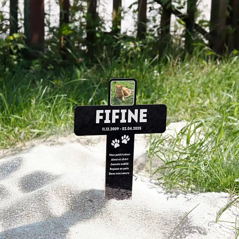 Cadeau Condoléances Propriétaire Croix Funéraires Personnalisées Avec Photo Pour Animaux Plaque Tombe Chien Chat Émouvant souvenir pour honorer les animaux en tant que compagnons fidèles. Croix funéraire en fer forgé - Cabinet Fligny Croix Funéraire en pierre et Christ en Bronze - Au quotidien Croix funéraire personnalisée pour animaux. Plaques commémoratives et décorations de prairie – une idée cadeau pour les propriétaires d’animaux en deuil. Pierre tombale personnalisée avec photo pour animaux Piquet funéraire unique en forme de croix avec photo, pour un souvenir éternel de l’animal de compagnie bien-aimé disparu. Grâce à une impression personnalisée avec nom, dates de vie, photo et texte au choix, chaque croix devient un souvenir unique et émouvant. L’impression de haute qualité est résistante aux intempéries et garde ses couleurs au fil du temps. Les ornements funéraires vous permettent d’exprimer votre amour et de rendre la tombe de votre animal aussi unique qu’il l’était de son vivant. Conservez à jamais le souvenir de votre animal. Belle croix commémorative pour chien et chat : Croix personnalisable pour animaux servant de décoration de tombe ou plaque mortuaire pour le lieu de repos des chiens, chats et autres animaux domestiques. La croix de tombe pour animaux est personnalisée individuellement avec photo, nom, dates de vie et texte au choix. Sur cette croix, vous pouvez faire imprimer les informations personnelles de votre animal : nom, dates, photo et mots d’adieu pleins de tendresse.