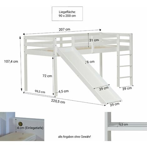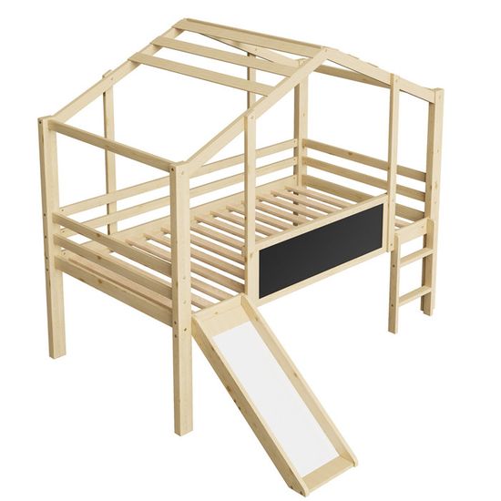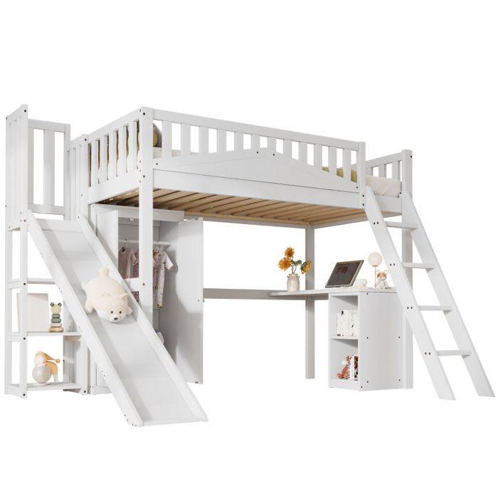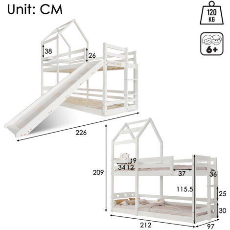 Lit mezzanine pour enfant 90x200 cm avec armoire, étagères et espace de Lit évolutif Jeu Lit Superposé 90 X 200 Cm, Lit Mezzanine Pour Enfant Avec échelle Lit Bois Sécurité La solution idéale pour maximiser les petites surfaces sans sacrifier la fonctionnalité., 5., Polyvalence évolutive Avec son tableau noir intégré pour l'apprentissage créatif, son échelle ergonomique et son coloris neutre intemporel, ce lit grandit avec l'enfant et s'adapte à tous les univers décoratifs. Transformez la chambre de votre enfant en un royaume magique avec ce lit mezzanine maison, une création ingénieuse qui fusionne sommeil, jeu et apprentissage. Surélevé pour libérer un espace inférieur convertible, il devient terrain de jeu, bibliothèque ou rangement astucieux dans les chambres compactes. Le lit mezzanine comprend une échelle à trois marches et un toboggan pour grimper en toute sécurité jusqu'au lit supérieur tout en offrant un plaisir supplémentaire à vos enfants Bien plus qu'un simple couchage, c'est un écosystème complet qui stimule l'autonomie, l'imagination et le mouvement - l'investissement idéal pour grandir en s'épanouissant., 1., Sécurité et stabilité optimales Cadre en bois robuste avec pieds renforcés et garde-corps intégral. Lits superposes 90x200 cm avec toboggan et échelle de rangement, lit... Une structure durable qui garantit des nuits sereines pour les enfants et une tranquillité d'esprit absolue pour les parents., 2., Glissade ludique et sécurisée Une toboggan au design plat et lisse transforme le réveil en moment joyeux. Son architecture ludique intègre un toit charmant, des fenêtres accueillantes, une glissade matinalisante et une échelle solide pour des montées sécurisées.