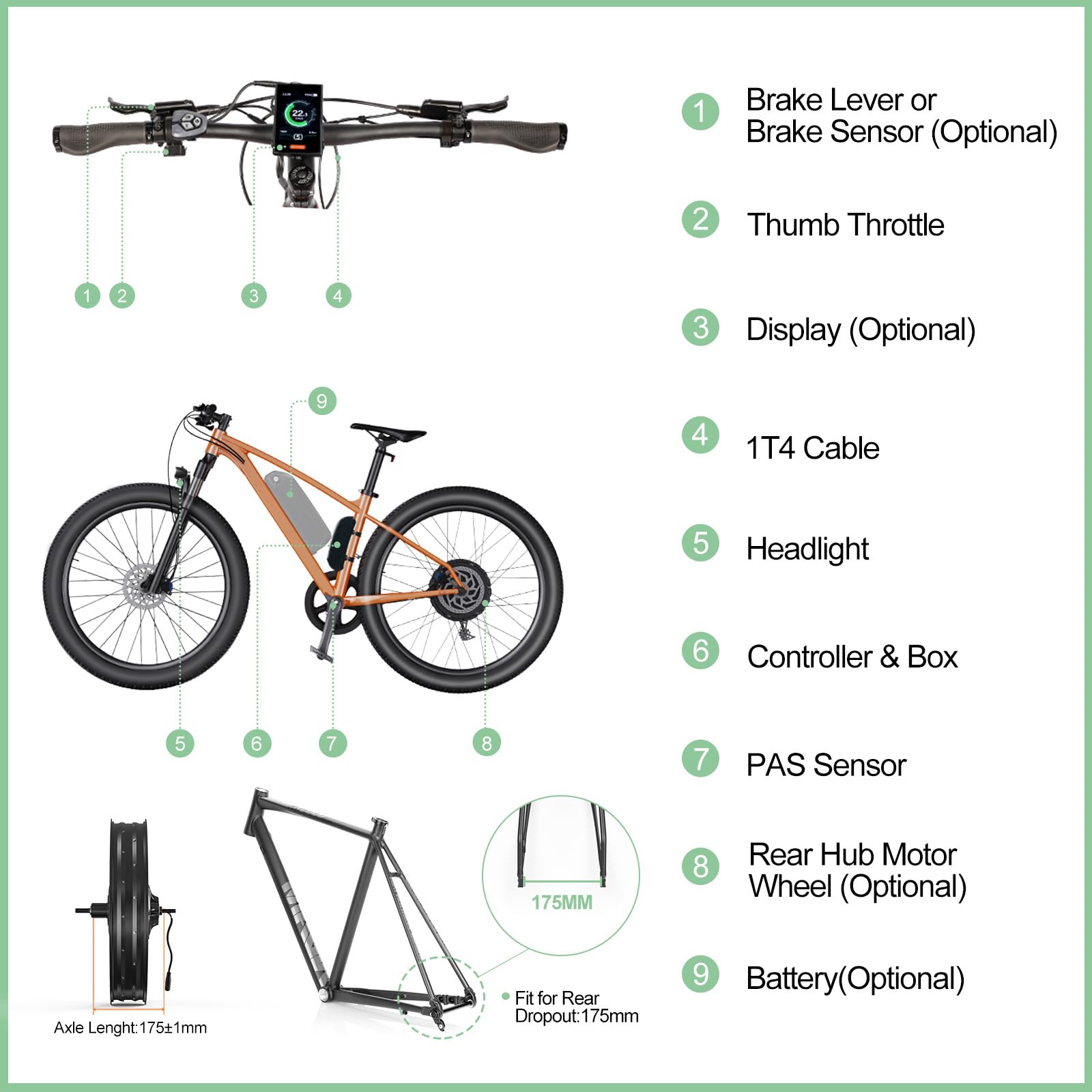 Ce kit prend en charge plusieurs marques de batteries 48V. BAFANG G062 48V 1000W moteur de roue arrière pour 175mm chute, 20 BAFANG 48V 1000W Kit De Conversion Vélo Électrique G062 20-26 Pouces Fat Tire 20x4.0 Avec Affichage Optionnel Et 48V Batterie, Kit de Conversion E-Bike Spécifications Tension nominale : 48V Puissance nominale : 1000W Couple maximal : 85 N. Compatible avec des pneus fat bike de 20 x 4., 0 pouces et des freins à disque m Entaxe arrière (O., L., D. Les moteurs de moyeu de cette page sont uniquement adaptés aux roues à cassette. Nos équipes techniques basées en Pologne sont prêtes à vous offrir des conseils experts via la messagerie Amazon. Conseils pour les clients Veuillez noter que l'entaxe arrière (O., L., D. Fat Bike Electrique Kit Conversion Velo Electrique Kit Conversion électrique Bafang Conversion E-bike 20 26 Pouces ) : 175 mm Position : Roue arrière avec cassette Diamètre de roue : 20 pouces / 26 pouces Construction : Moteur sans balais à engrenages Efficacité : ≥80% Niveau sonore : <55 dB Température de fonctionnement : -20 à 45 ℃ Poids : 4,9 kg Type de frein : Frein à disque Liste d'emballage Moteur de moyeu arrière BAFANG 48V 1000W avec jante et rayons Affichage optionnel Contrôleur Boîtier de contrôleur Leviers de frein / Capteurs de frein (Si vous souhaitez conserver vos freins hydrauliques ou si votre levier de frein et votre manette sont intégrés, choisissez des capteurs de frein) Accélérateur au pouce Capteur PAS Câble 1T4 Phare avant My fat tire tadpole trike with a Bafang G062 conversion - it's a go... Parfait pour le fat bike, le vélo de plage ou le transport de charges lourdes [ASSISTANCE FIABLE] Votre satisfaction est notre priorité. Le système de changement de vitesse diffère entre une roue libre et une roue à cassette. Ce moteur robuste fournit un couple maximal de 85 N. Optez pour des batteries de 13Ah / 16Ah/17,5Ah / 20Ah, en version cadre ou porte-bagages [CHOIX DE BATTERIES FLEXIBLES] Améliorez les performances de votre e-bike avec une large gamme de batteries compatibles. [COMPATIBILITÉ LARGE] Le moteur arrière Bafang 48V 1000W avec cassette est compatible avec les vélos équipés de systèmes de vitesses jusqu'à 9 rapports. ) de votre vélo doit être de 175 mm.