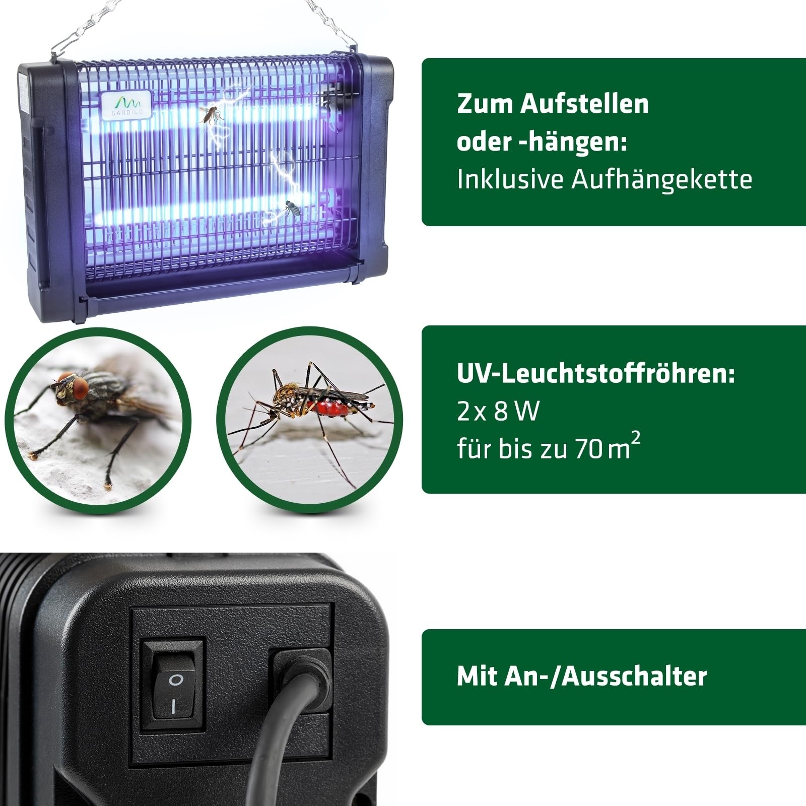 Ventilateur d'aspiration : Lot de 2 Haute tension : 800-1000V (grille) , Tube fluorescent UVA Les moustiques et les moucherons sont attirés par la lumière UV et capturés par le courant d'air. Nous vous demandons d'en tenir compte et de protéger la nature., Si les moustiques et les moucherons pénètrent dans la tétine d'insectes volants, ils sont éliminés rapidement et sans douleur grâce à la grille haute tension intégrée. Destructeur D'insectes Avec Plaque Collante 120m≤ 230V/36W 475x80x H 283 Mm Hendi En cas de garantie ou si vous avez des questions, N'hésitez pas à nous contacter, nous sommes toujours à votre service. 🌪️ 𝗔𝗧𝗧𝗜𝗥𝗔𝗡𝗖𝗘 𝗣𝗔𝗥 𝗟𝗘𝗦 𝗩𝗘𝗡𝗧𝗜𝗟𝗔𝗧𝗘𝗨𝗥𝗦: L'aspirateur d'insectes volants est doté de deux ventilateurs créant un courant d'air qui attire les insectes volants. Assurez-vous de laisser suffisamment d'espace devant l'appareil. ⚡ 𝗛𝗔𝗨𝗧𝗘 𝗧𝗘𝗡𝗦𝗜𝗢𝗡 : La grille à haute tension (800-1000V) à l'intérieur de la lampe anti-moustiques élimine rapidement et sans douleur les insectes capturés par le courant d'air. L'utilisation en extérieur est contraire à la loi de conservation de la nature. EN STOCK : BLANKO Répulsif antiparasitaire, Duo Pro, 971198 pas cher. Livraison rapide partout en France Destructeur Gardigo Duo Usage Intérieur GARDIGO® Destructeur D'insectes USB | Piège à Insectes Avec Lumière UV Et Ventilateur | Jusqu'à 25 M² | Hygiénique Avec Bac De Récupération Amovible Piège Moustiques UV Ventilateur Haute Tension Portée : jusqu'à 60 m² Le produit est adapté pour des pièces jusqu'à 60 m² et aide ainsi à détruire les insectes indésirables dans un grand environnement, avec une forte attraction sur la plupart des insectes volants. La lumière spéciale des tubes UVA aide à attirer les insectes indésirables tels que les moustiques ou les moucherons. Utilisation en intérieur Pour protéger les insectes sous protection de la nature et des espèces, l'utilisation de l'appareil est autorisée exclusivement à l'intérieur. Aspirateur d'insectes volants Duo 60 m² Pour les problèmes de moustiques et de mouches L'aspirateur d'insectes volants Gardigo Duo 60 m² est conçu pour détruire les mouches, les moustiques et autres insectes volants. Dimensions : 3 23,5 x 33 x 9,5 cm (l x H x P) 👍 𝗨𝗧𝗜𝗟𝗜𝗦𝗔𝗧𝗜𝗢𝗡 𝗙𝗔𝗖𝗜𝗟𝗘: Le piège à moustiques peut être placé à la verticale ou à l'horizontale, convient à des surfaces allant jusqu'à 60 m² et est équipé d'un interrupteur marche/arrêt.