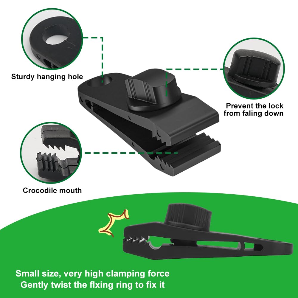 【Excellente Conception】Clip de bâche Le clip de tente est une conception à dents inversées avec une super morsure, ce qui le rend facile à attacher même sur des tissus ultra-fins et ne tombe pas facilement. Accessoire Fixation Toile Hamac Auvent 25 Pièces Tente Clips Clip De Bâche En Plastique Pinces Clips De Bâche De Ten Pince Réglable à Dents Inversées Spécification: Matériel: nylon Couleur : noir, vert militaire Etendue de la livraison : 6 * Pince Pour Bache Tente Clips(noir) 6 * Pince Pour Bache Tente Clips(vert militaire) observer: 1., En raison de la mesure manuelle, il peut y avoir une erreur de 1 à 3 mm. L'autre côté est doté d'un trou fermé et robuste pour fixer une boucle métallique ou un tendeur de bâche à bille. L'extrémité arrière du tendeur de bâche peut être reliée à une boucle métallique, à un tendeur en caoutchouc avec un crochet ou à un élastique avec une boule. 【Facile à Installer】 La pince de bâche robuste est facile à installer ou à retirer, il suffit de serrer ou de desserrer le bouton à vis pour l'ajuster sur des bâches épaisses ou fines. La bande élastique avec crochets est faite de latex et de polyester. Contrairement aux attaches zippées, elles peuvent toujours être réutilisées. Le cordon à ressort mesure 1,5 cm de long. 【Matériau De Haute Qualité】Le clip pour bâche de tente est fabriqué en nylon de haute qualité. 【Liste Des Paquets】 Le paquet contient 12 clips de bâche et 12 cordons élastiques, disponibles en couleurs noir et vert militaire. Jeu de 10 Pince pour bache,tendeur Elastique,Clips pour bache,Attache Lot de 30 Clip de Bâche Tente, Pince pour Bâche de Verrouillage, Pince... Résilient, résistant aux intempéries, durable et résistant à la corrosion.