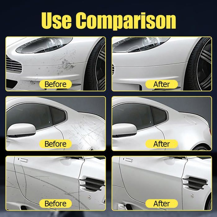 Suit pour les petites et légères rayures, poignées de porte, rayures d'ongles, légères rayures, légères blessures de laque, rayures mineures, tourbillons de peinture après le polissage, nettoie également les taches tenaces, la saleté, les fientes d'oiseaux. Scratch Repair Wax utilise une technologie de revêtement avancée pour fournir un revêtement super hydrophobe qui rend votre voiture durable. Réparez-la vous-même en 3 secondes avec notre cire de polissage pour réparation de rayures de voiture Si vous avez des questions pendant l'utilisation du produit, n'hésitez pas à nous contacter, nous résoudrons tous les problèmes pour vous. 【Upgrade Scratch Repair Wax for Car】Scratch Repair Wax utilise une technologie de revêtement avancée pour fournir un revêtement super hydrophobe qui rend votre voiture durable. 【Facile à utiliser】Il suffit de nettoyer la zone de l'éraflure et d'enlever la saleté, la cire et autres. Kit Réparation Petites Rayures Voiture 2025 Efface Rayure Profonde Voiture, Efface Rayure Voiture Nettoyant Taches Oiseaux Utilisez l'éponge pour frotter la rayure jusqu'à ce que les rayures aient disparu. Comment effacer rayure voiture, astuces simples pour puis essuyez la crème-cire. Ce qui reste est une belle finition ultra-brillante qui vous impressionnera.