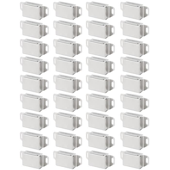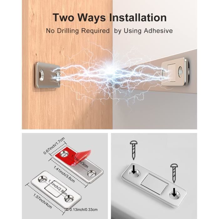 Positionnement facile : montez d'abord les deux trous elliptiques, afin de régler l'emplacement en fonction de la fermeture. Maintien magnétique puissant : notre loquet de porte magnétique robuste offre une capacité impressionnante de 40 kg, gardant les armoires, les tiroirs et les portes bien fermés, même avec une utilisation vigoureuse, ce qui le rend parfait pour les maisons avec des animaux curieux ou des tout-petits Caractéristiques : Fabriqué en matériau de haute qualité, pratique à utiliser. Sécurité domestique améliorée : ajoutez une couche supplémentaire de sécurité à votre espace de vie avec ce loquet magnétique fiable, empêche efficacement l'accès indésirable aux armoires et aux portes tout en offrant une performance fiable pour les portes, les portes de garde-manger et les portes coulissantes. Utilisation polyvalente : au-delà de la sécurisation des portes lourdes, cet aimant puissant sert de support d'outils pratique pour votre atelier ou garage, organisant facilement les outils métalliques tels que les tournevis et les clés grâce à son aimant puissant. Matériau : acier inoxydable. Maintien magnétique puissant : notre loquet de porte magnétique robuste offre une capacité impressionnante de 40 kg, gardant les armoires, les tiroirs et les portes bien fermés, même avec une utilisation vigoureuse, ce qui le rend parfait pour les maisons avec des animaux curieux ou des tout-petits. Avec une force magnétique allant jusqu'à 30 kg, ce loquet magnétique de placard peut fermer la porte plus efficacement. La superbe force magnétique rend difficile l'ouverture de la porte par votre enfant et votre animal de compagnie, ce qui ajoute une sécurité supplémentaire à votre maison Aimant très résistant : chaque support contient un seul aimant avec une traction extra forte qui maintient la porte lourde ou le portail bien fermé. 12PCS Aimants D'armoire en Acier Inoxydable Puissants pour cuisine Aimant Placard Aimant Porte Placard Jiayi Lot De 4 Loquet Magnetique Ultra Mince En Acier Inoxydable Avec Vis Et Colle Ferme Porte Puissant Pour Fermeture De Porte Coulissante, Tiroir, Cabinet, Placard, Noir Caractéristiques : Couleur : argenté. Idéal pour une utilisation sur une porte dont le loquet est inutile ou pour empêcher vos animaux de compagnie ou tout-petits d'ouvrir les armoires, tiroirs, portes coulissantes, portes moustiquaires, portes en verre, pour et porte de garde-manger. Ajoutez des éléments de sécurité supplémentaires à votre maison avec notre loquet magnétique fiable. Durabilité durable : boîtier en acier inoxydable 304 chromé poli, spécialement conçu pour une utilisation sur meubles, utilisation marine, extérieur ou environnements humides comme les cuisines, salles de bains, balcons, bateaux et camping-cars. Plus durable que le plastique et ne se casse plus.