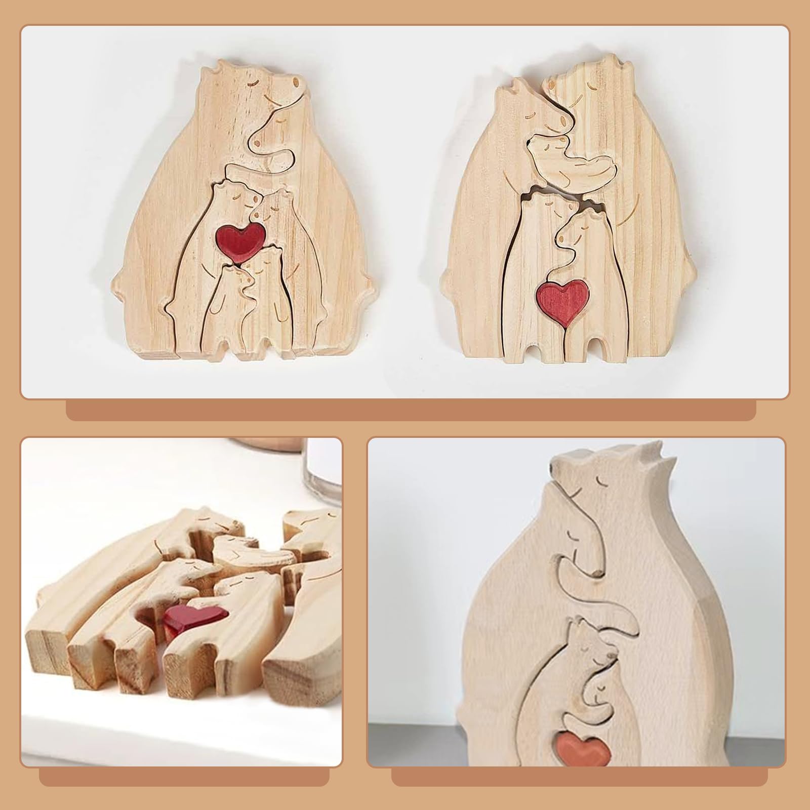 Le puzzle en forme de cœur lui-même est une couleur chêne solide avec un grain de bois visible. Avertissement De Sûreté Non En forme d'Ours, les pièces de ce puzzle en bois sont personnalisées gratuitement jusqu'à 6 prénoms. Elles s'emboitent les unes aux autres pour former votre famille En forme d' Ours, les pièces de ce puzzle en bois sont personnalisées gratuitement jusqu'à 6 prénoms de votre famille. Elles s'emboitent parfaitement les unes aux autres pour former une famille unie. Particulièrement originale, cette décoration donnera un style unique à votre maison tout en célébrant vos liens familiaux Design unique : que ce soit des parents, des enfants ou des grands-parents, vous pouvez écrire le nom de vos proches sur la planche en bois personnalisée. Collier de puzzle familial avec nom personnalisé, figurine d'animal Entretien facile : grâce à un entretien facile, assurez-vous que votre œuvre d'art familial en bois reste en bon état. Il suffit de l'essuyer légèrement avec un chiffon propre et humide et d'éviter d'utiliser de l'eau chaude ou de l'immerger. Sculpté Prix Puzzle En Bois Personnalisable - Famille D'ours Cadeau Famille Matériaux de haute qualité : notre art en bois familial est fabriqué à partir de bois durable pour garantir sa durabilité et sa résistance à l'usure. Description du produit Spécifications: Quantité : 4 (ours) Dimensions : 15 x 11 x 2 cm Matériel: bois Caractéristiques : 💕1., Atmosphère chaleureuse : améliorez votre décoration intérieure avec notre art familial en bois, parfait pour créer une atmosphère chaleureuse et aimante dans n'importe quel espace de vie, y compris la chambre, le salon et au-delà., 💕2., Excellente idée cadeau : le lien unique et les souvenirs précieux de votre famille avec un puzzle en forme d'ours. Emballage : 1 art en bois famille d'ours., 1 stylo.