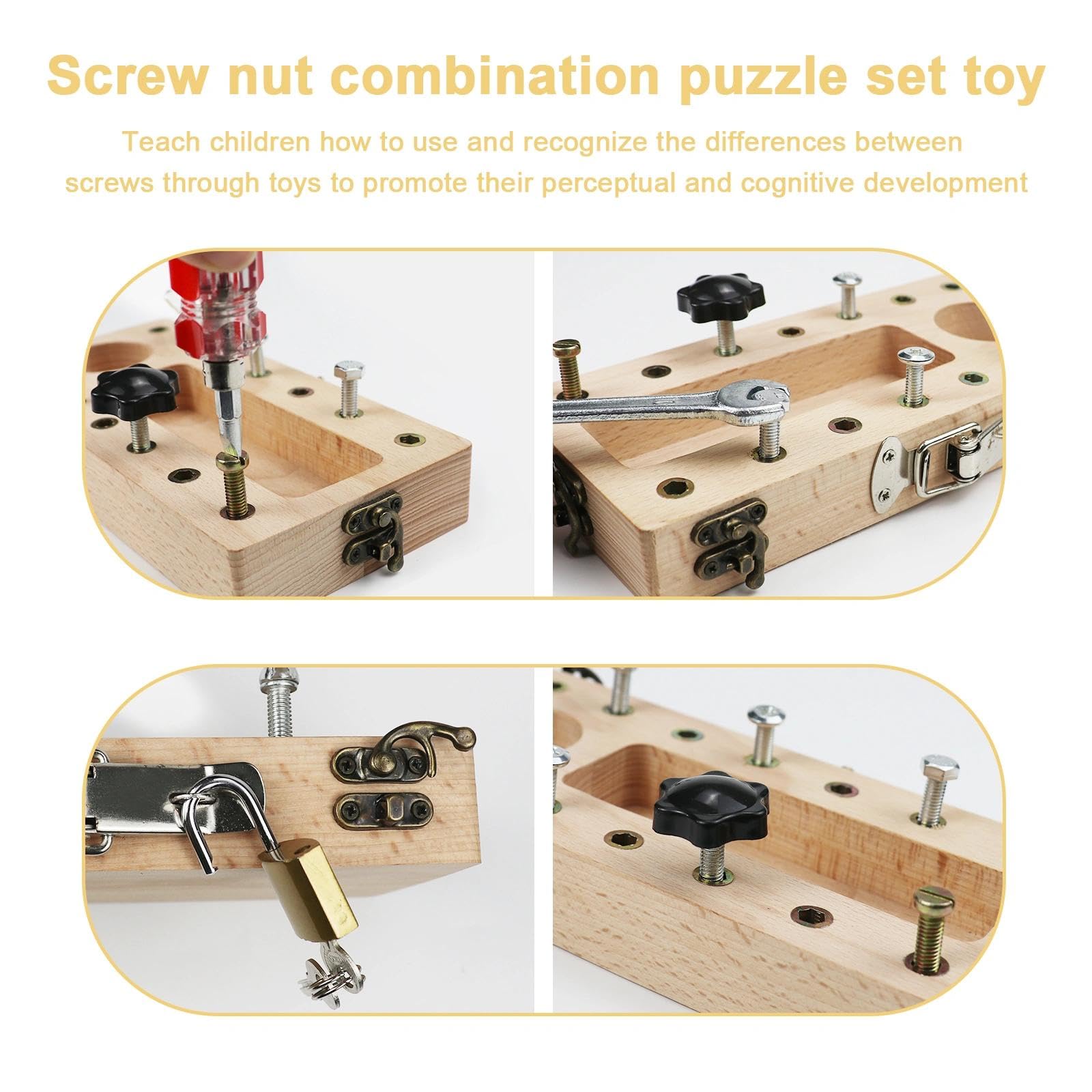 Ensemble de Vis Montessori - Cet planche montessori comprend 7 types de vis différents, 1 clé, 1 cadenas, 2 clés, 1 tournevis combiné, 1 clé Allen et 1 planche à vis en bois. Ce tableau d'activités créatif développe les compétences motrices fines, la concentration et la curiosité des enfants par le jeu. Ce jouet en bois, adapté aux enfants de 2 ans et plus, est magnifiquement conçu. C'est aussi un cadeau idéal pour les anniversaires, Pâques, la Journée de l'enfance, Thanksgiving et Noël pour les garçons et les filles de 2 à 6 ans. Facile à utiliser - Ce jeux montessori est simple à utiliser, sans instructions complexes. Busy Board Enfant 2-6 Ans Busy Board Montessori En Bois Pour Enfants De 2 à 5 Ans Ameliorez Leur Motricite Fine Planche à Vis En Hêtre Matériaux de haute qualité - Ce busy board montessori est fabriqué en bois naturel et métal de haute qualité, à la fois durables et écologiques. Cadeau parfait pour les enfants - Notre planche à vis Montessori est le cadeau idéal pour les enfants et les tout-petits, transformant le processus d'apprentissage ennuyeux en une expérience créative et amusante. Merci pour votre compréhension. Le bois de hêtre est non seulement résistant et brillant, mais il résiste également à la déformation, même dans un environnement sec. Hahaland Busy Board Jouet Montessori pour Enfant 2 Ans, 5 Couches Planche Montessori Jouet pour... Il les aide à apprendre à utiliser un tournevis et d'autres outils, et à s'entraîner à manipuler correctement des objets tels que les boutons grâce au jeu. Avertissement De Sûreté 01 Les bords et surfaces lisses sont conçus pour confort et la sécurité des petites mains des jeunes enfants. Les enfants âgés de 2 à 3 ans ne doivent pas jouer seuls avec la planche à vis et doivent être sous la surveillance d'un adulte., 2., En raison des différentes conditions d'éclairage et des affichages des écrans, la couleur du produit peut légèrement varier. Offrez à votre enfant une planche de motricité Montessori qui l’accompagnera de la petite enfance jusqu’à l’école. Le Lockboard, c’est bien plus qu’un jouet : c’est un busy board Montessori complet, qui allie plaisir, autonomie, apprentissage et imagination Busy Board Montessori|Panneau d'Activités Enfants - Jouets Sensoriels en Bois pour Enfant 3 4 Toutes les vis et écrous s'insèrent parfaitement dans les trous de la planche.