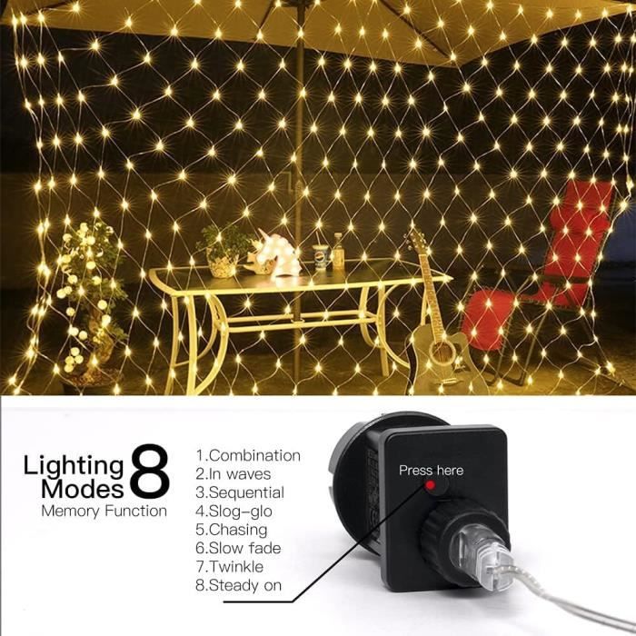 EN STOCK : Guirlande Lumineuses Filet, 200 LED Filet Lumineux 3M X 2M 8 Modes Énergie Étanche, Dimmable pour Chambre Noël Mariage Soirée Maison Jardin, Blanc Chaud, MNLX601071380 pas cher. Livraison rapide partout en France Choisissez votre mode préféré avec un bouton et illuminez votre vie romantique. Guirlande Filet Lumineux 3x2m Guirlande Lumineuses Filet,192 LED Filet Lumineux 3M X 2M 8 Modes énergie étanche,Dimmable Pour Guirlande Filet 208 LED 8 Modes Spécifications polyvalentes: Ce filet lumineux mesure 3m x 2m et est équipé de 208 LED haute luminosité, adaptés à divers besoins de décoration intérieure et extérieure, y compris l'éclairage de Noël pour l'intérieur et l'extérieur. Lumières Décoratives Parfaites & DIY: Les fairy lights guirlandes lumineuses à LED sont flexibles et peuvent facilement être mises sous la forme de votre choix pour créer une atmosphère romantique et chaleureuse. Cet éclairage de guirlande est parfait pour les décorations intérieures et extérieures: votre maison, votre bar, votre fenêtre, votre festival, votre mariage, votre Saint Valentin, votre fête d'anniversaire, Halloween, Noël, fête du Nouvel An et autres décorations murales. Lumiere noel exterieur connectable : 3m x 2m (9.8 ft x 6.6 ft), 204 LED, fil conducteur: 3m, câble transparent, avec fiche de queue connectable qui peut... LEMROE LED Filet Guirlande Lumineuse 3mx2m 200 LED Connectable Maille Fee Guirlande Lumineuse 8 Modes Noel Filet Lumieres Blanc Chaud 91641207 Les modes d'éclairage ont 4 niveaux de luminosité. Les filet lumineux plafond à basse tension 31V avec adaptateur électrique à 2 broches certifié UE, basse tension et ne chauffent pas, sécurité au toucher même après de nombreuses heures de travail. 8 Modes & Fonction de Mémoire: Combinaison, vagues, changement continu, lueur lente, poursuite / flash, fondu lent, scintillement / clignotement, éclairage continu.