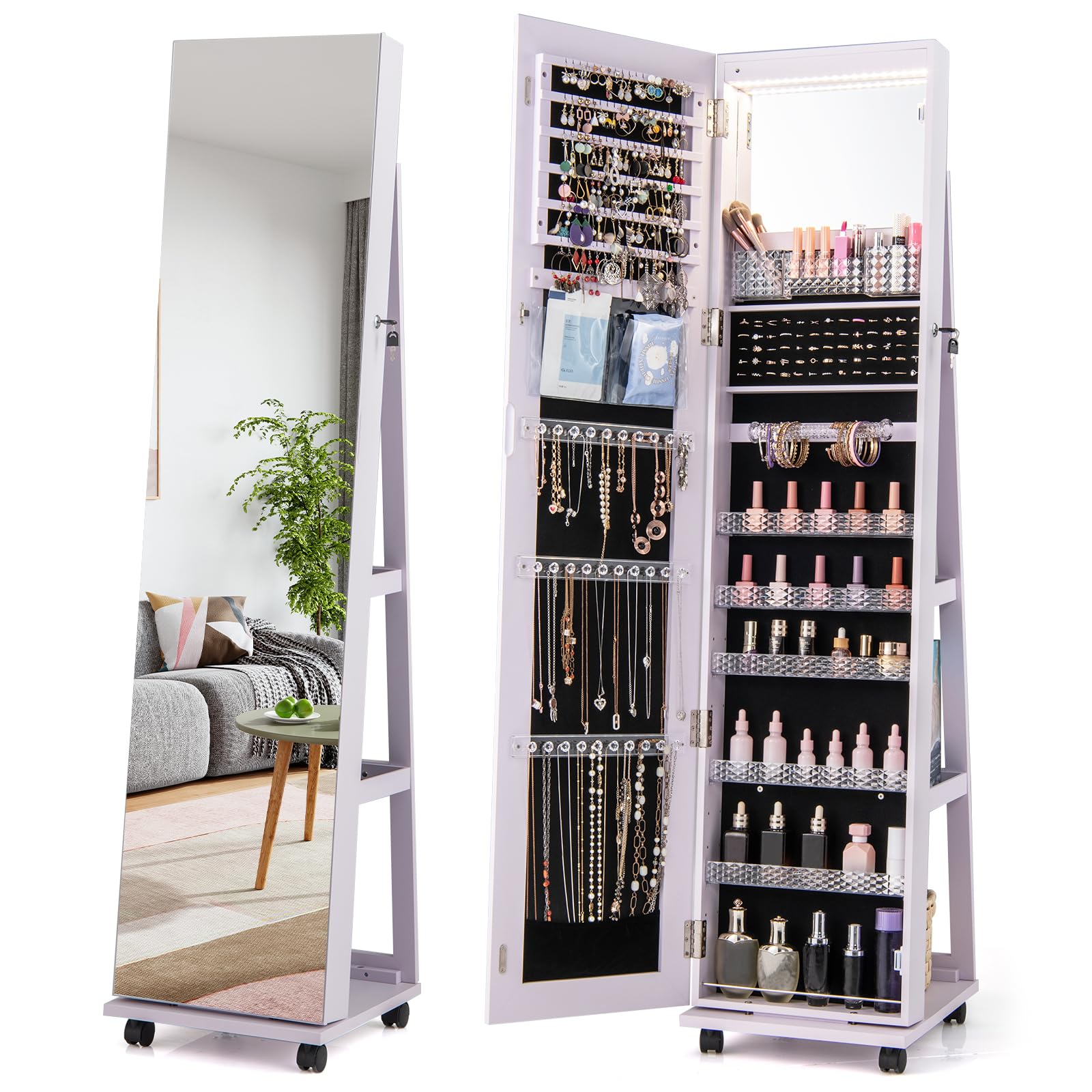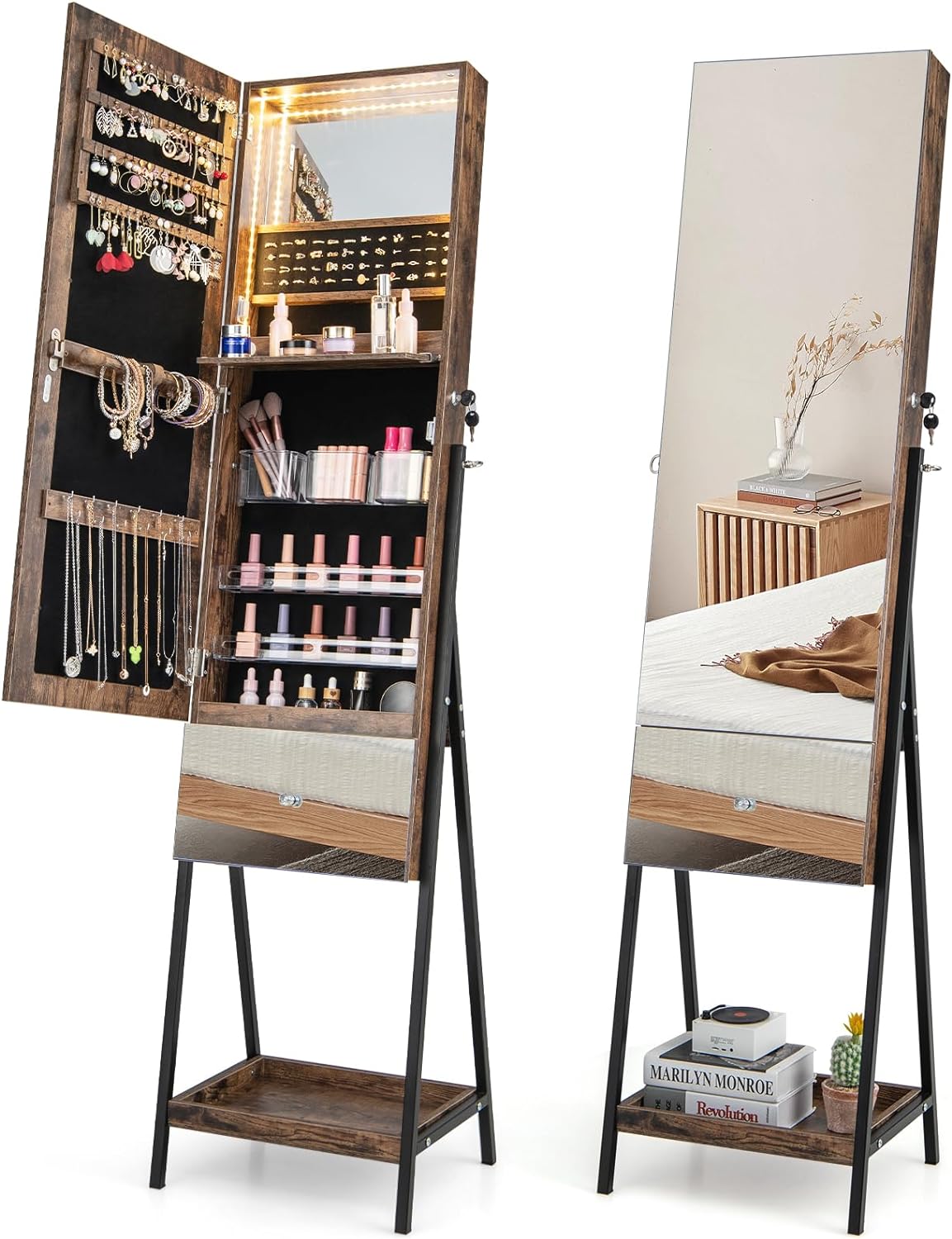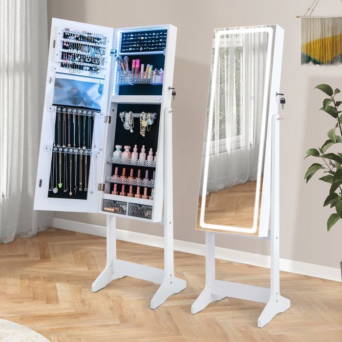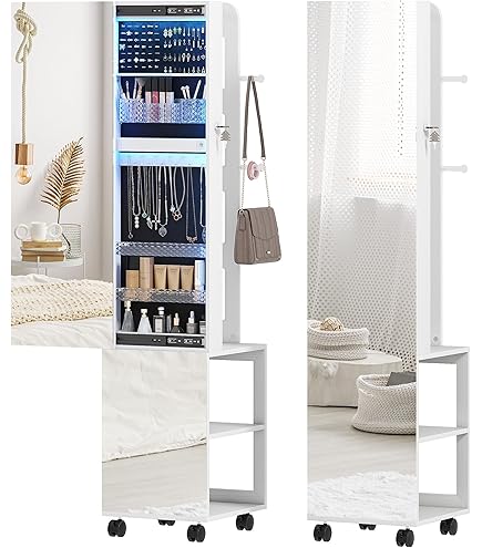 Conception Conviviale : Dans cette armoire à bijoux avec miroir complet, cinq étagères acryliques coulissent librement. Rangement Maquillage Armoire à Bijoux Sur Pied Multi-rangement Avec Miroir LED MDF Blanc Rangement Maquillage Organisateur LED Roues pour Déplacement Facile : Quatre roulettes pivotantes transforment ce porte bijoux avec miroir en allié mobile : poussez ou tournez-le d’un geste, accédez aux étagères arrière, puis bloquez chaque roue d’un coup de pied. Armoire de maquillage rotative accueille 108 boucles, 65 bagues, 30 colliers et conserve tout en ordre derrière une porte sécurisée. Design 3-en-1 : Cette armoire de toilette mobile du sol au plafond combine un miroir sans cadre de 156 cm de haut avec trois étagères plus larges à l'arrière, qui peuvent être utilisées comme miroir de coiffure, ainsi que comme rangement pour les chapeaux, le parfum ou les vêtements pliés, réalisant ainsi l'expérience 3-en-1 d'une seule et même armoire. HOMFME Armoire à Bijoux avec Mirror sur Pied, Organisateur Rangement Maquillage avec Lumières LED 3 Couleurs & 5 Étagères Réglables, Porte Bijoux avec Roues pour Bague Bracelet Boucles (Noir Grand Espace de Rangement : À l’intérieur, l’organisateur de rangement pour cosmétiques présente 108 emplacements pour boucles d'oreilles, 36 trous pour boucles d'oreilles, 30 crochets pour colliers, 1 barre pour bracelets, 65 porte-bagues, 3 boîtes en acrylique amovibles, 2 sacs de rangement transparents et 5 cloisons réglables, avec une barre horizontale en bas, pour que les bijoux et les produits cosmétiques aient leur propre place, et qu'il n'y ait plus de désordre. Armoire à bijoux sur pied avec miroir avec éclairage réglable Miroir LED Tricolore Intégré : Ouvrez la porte pour découvrir le miroir intégré, qui peut être commuté en bleu froid, jaune chaud ou blanc naturel sur simple pression d'un bouton. Cette armoire à bijoux mobile combine une coiffeuse, un meuble de toilette et une armoire à miroir, ce qui la rend idéale pour la toilette.