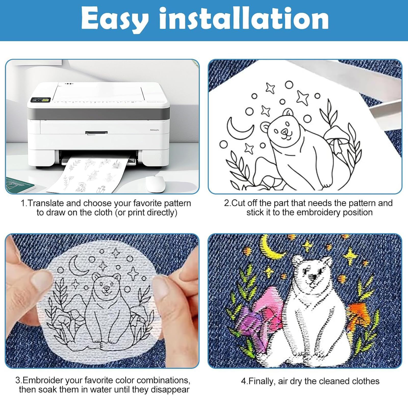 ăContenu du produităContient 4 feuilles A4 de papier broderie hydrosoluble autocollant Ă motifs floraux + 1 paire de ciseaux Ă ressort avec capuchon de sĂ©curitĂ©. Ă propos de cet article đž[RĂ©pond Ă vos besoins de couture Ă la main] : le produit comprend 4 feuilles de stabilisateur soluble dans l'eau pour la broderie, un total de 100 motifs prĂ©-imprimĂ©s. Assez pour rĂ©pondre Ă vos diffĂ©rents besoins de couture Ă la main. Facile Ă enlever Description du produit Description du Produit : Notre set de broderie DIY comprend 4 feuilles A4 de papier hydrosoluble autocollant avec motifs floraux et une paire de ciseaux Ă ressort avec capuchon de protection. ăLarge ApplicationăConvient aux tissus tels que vestes, Ă©charpes, chapeaux, coussins. Stimulez la crĂ©ativitĂ© avec des idĂ©es de couture uniques et dĂ©coratives. ăMatĂ©riau de Haute QualitĂ© SolubleăFabriquĂ© en papier broderie hydrosoluble de qualitĂ© supĂ©rieure, doux, lĂ©ger et facile Ă dĂ©couper. Le stabilisateur soluble dans l'eau offre un rendu propre et net aprĂšs usage. Papier autocollant et Hydrosoluble Solufix â Jen Brode Parfait pour les dĂ©butants, les enfants, ou comme cadeau crĂ©atif. COUPE PRĂCISION AVEC ciseaux broderie charme vintage dans une boĂźte Broderie DIY Facile Qivine 4 Feuilles 100 Pcs Papier Broderie Soluble, Water Soluble Stabilisateur Broderie Le papier hydrosoluble convient parfaitement aux amateurs de broderie dĂ©butants et Ă la dĂ©coration textile DIY. Les ciseaux ergonomiques garantissent une coupe prĂ©cise et une sĂ©curitĂ© optimale. Applications Multiples : IdĂ©al pour les t-shirts, jeans, sacs, chapeaux ou linge de maison. CrĂ©ez des designs personnalisĂ©s, rĂ©parez des vĂȘtements ou rĂ©alisez un projet commun en famille. Avertissement De SĂ»retĂ© Non applicable