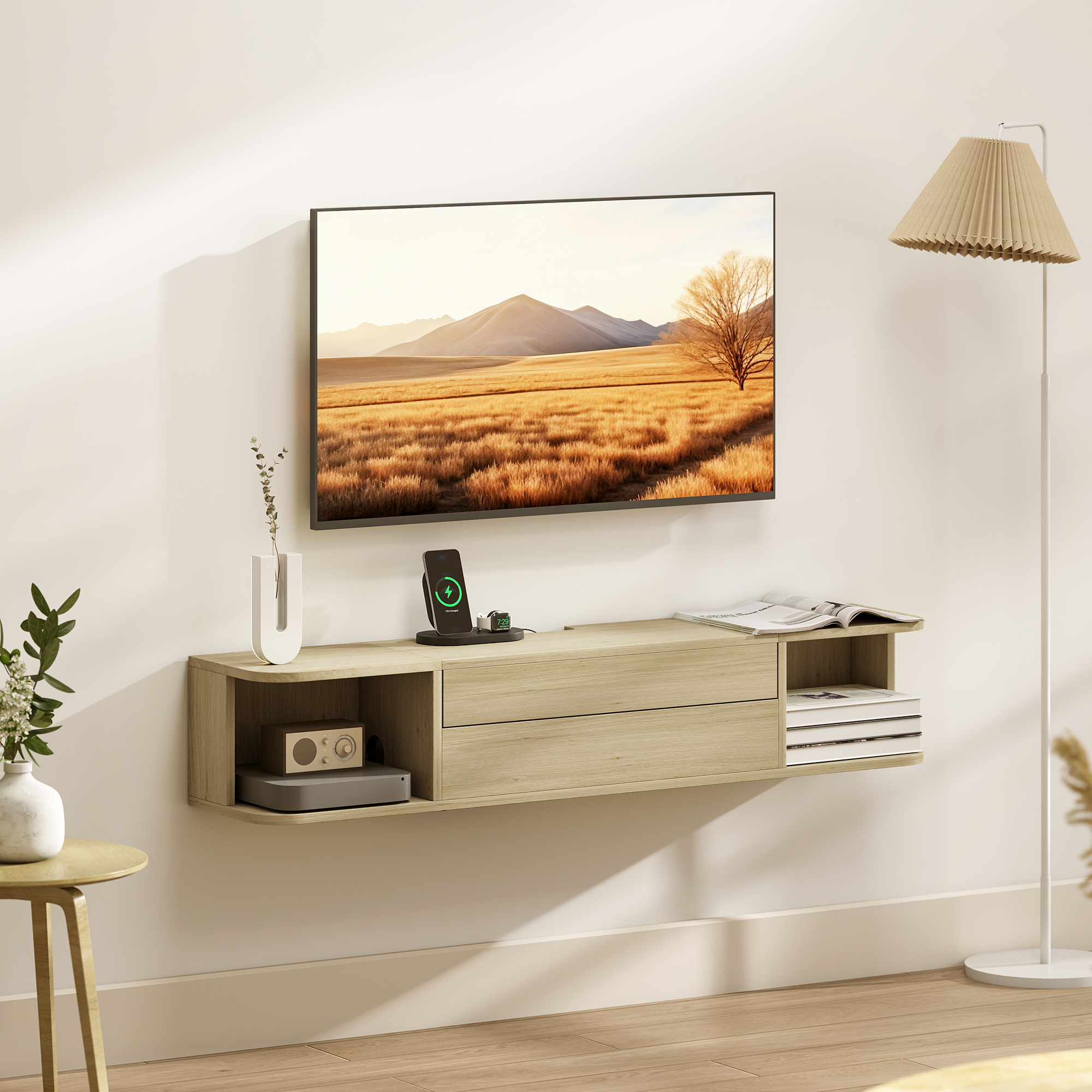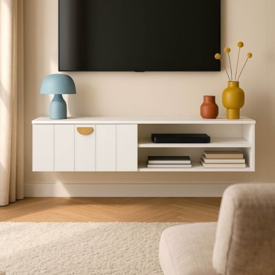 STATION DE CHARGEMENT INTÉGRÉE : Intégrant une prise avec trois connecteurs, un port USB et un port Type-C, ce meuble TV flottant assure une solution de recharge propre et efficace pour tous vos appareils. EN STOCK : Meuble TV suspendu - HOMCOM - pour téléviseur jusqu'à 50 pouces - tiroir, étagères, passe-câbles - effet bois naturel, 83B-525V90ND pas cher Doté d'une station de charge avec trois prises, un port USB et Type-C, il inclut un tiroir et deux étagères ouvertes, maximisant l'espace et cachant les câbles. SOLUTION DE RANGEMENT ORGANISÉE : Maximisez l'espace de votre salon avec ce meuble TV flottant de 120 cm, doté d'un tiroir à ouverture coulissante et de deux étagères ouvertes, parfait pour exposer et organiser vos indispensables. GESTION AMÉLIORÉE DES CÂBLES : Grâce à deux passages de câbles, ce meuble télé suspendu cache efficacement les fils, contribuant à un espace de divertissement ordonné et plus apaisant. MONTAGE MURAL & GAIN DE PLACE : En haussant votre centre multimédia, ce meuble TV suspendu libère l'espace au sol, offrant une ambiance plus spacieuse et épurée, simplifiant le nettoyage et désencombrant efficacement votre salon. du tiroir : 60l x 21P x 19,5H cm (internes) ● Dim. Lifewit 120cm Meuble TV Mural pour Télévisions 24-50 Pouces, Meuble Tele Bois Meuble TV Suspendu Table TV avec Grand Espace Equipé d'une Multiprise Montage Facile pour Salon, Chambre, Couleur Noyer Contenu de L'Emballage: Caractéristiques:● Bande d'alimentation intégrée avec trois prises, un port USB et un port Type-C pour garder les appareils en charge de manière ordonnée ● Un tiroir et deux étagères ouvertes du meuble TV offrent beaucoup d'espace de rangement soigné pour les essentiels ● Plateau coulissant unique permettant un accès facile au tiroir ● Design de montage mural libérant de l'espace au sol, améliorant l'esthétique de la pièce ● Système de gestion des câbles du meuble télé qui masque les fils pour un aspect soigné ● Montage nécessaireSpécifications:● Couleur : effet bois naturel ● Matériau : panneau de particules ● Dim. du trou pour câble : Ø 5,5 cm ● Longueur câble alimentation : 1,5 m ● Taille de TV appropriée : jusqu'à 50 pouces ● Prise de courant : AC 220-240V, 50Hz, 10A, 2400W ● Sortie USB-A : 5,0V, 2,1A, 10,5W max. SENA - meuble TV suspendu 120 cm bois foncé avec porte abattante en... Meuble TV Suspendu HOMCOM Meuble Télé Pour Téléviseur 50 Pouces Tiroir étagères Passe-câbles 120x24x22,4cm Effet Bois Naturel | France Meuble Télé Suspendu Avec Prises Usb de l'étagère ouverte : 26,5l x 22,5P x 19,5H cm ● Dim.