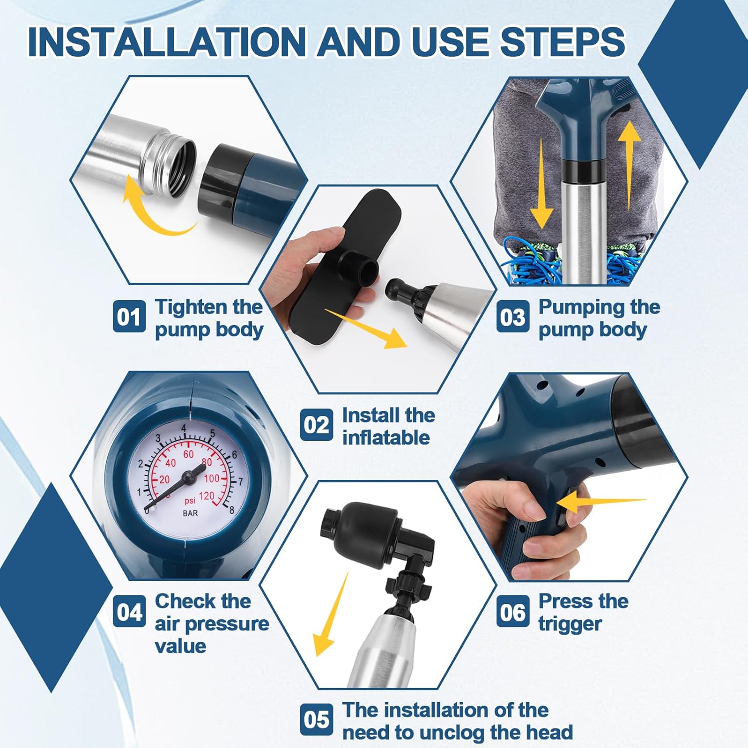 Avec cet outil innovant, vous pouvez déboucher facilement vos conduites grâce à la puissance de l'air comprimé. Il est livré avec quatre adaptateurs en caoutchouc, ce qui le rend universel et adapté à tous types de conduits, que ce soit dans la salle de bain, la cuisine ou même les gouttières Facile à utiliser par simple pression d'un bouton pour un nettoyage rapide sans effort. Deboucheur Evier O OLAX Kit De Déboucheur 5 En 1 à Air Comprimé – Pompe De Kit Déboucheur 8 Embouts Manomètre Déboucheur de canalisations à air comprimé puissant : le nettoyeur de tuyaux à air comprimé O OLAX utilise de l'air comprimé avec une pression allant jusqu'à 8 bars pour éliminer même les bouchons tenaces dans les toilettes, lavabo, douche ou siphon de sol en quelques secondes, sans produits chimiques. Ainsi, vous pouvez choisir la pression idéale en fonction de l'endroit où vous l'utilisez : 2-3 bars pour lavabo, 4-5 bars pour les toilettes, 6-8 bars pour les bouchons tenaces - contrôle maximal, pas de risques inutiles. Respectueux de l'environnement et réutilisable : fini les produits chimiques agressifs. Il peut être utilisé pour les toilettes, les baignoires, les bacs accroupis, les drains de sol, les éviers, les éviers à légumes, les tuyaux bouchés, etc Plus... O OLAX 5-en-1 Deboucheur WC, Déboucheur de Toilettes avec Baromètre Grâce au manomètre intégré, la pression de l'air peut être réglée avec précision pour une performance de nettoyage optimale à chaque application. Manomètre de pression d'air visible : le manomètre intégré affiche la pression de l'air en temps réel. Idéal comme ventouse WC ou déboucheur de toilettes pour votre maison.