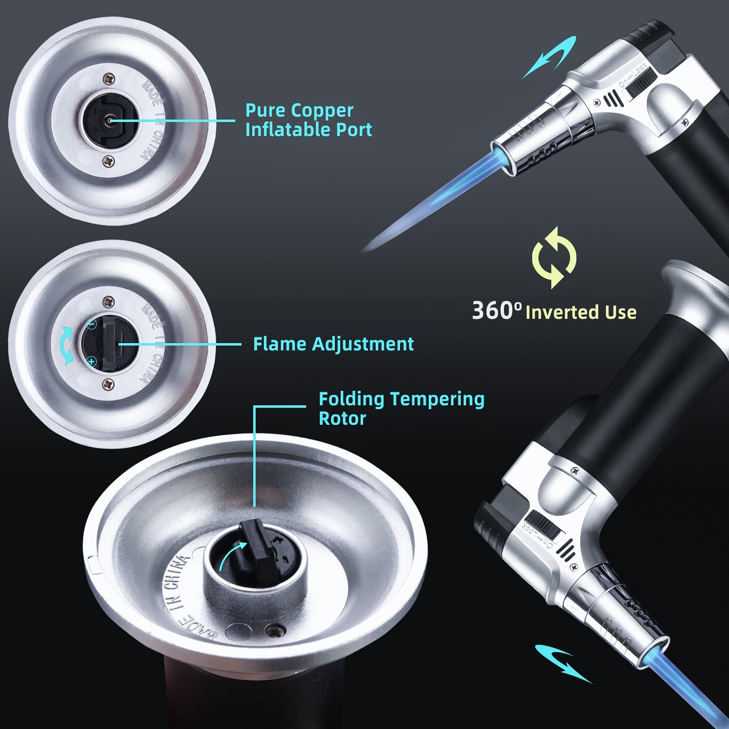 également comme rappel pour éviter un remplissage excessif. Compact (12,1 × 7,6 cm), léger et ergonomique, il permet une utilisation d’une seule main grâce à son régulateur de flamme et son verrouillage de sécurité, idéal pour la cuisson sous vide, le barbecue, la caramélisation et la saisie de viande Spécifications: Couleur : noir, rouge, bleu et vert Température de la flamme : 1371 °C. Nombreuses utilisations : briquet jet idéal pour caraméliser le sucre sur la crème brûlée, glacer un jambon cuit au four, faire frire un steak, rôtir des poivrons, faire fondre le fromage et griller des chapelures. Remarque : le briquet rechargeable n'est pas livré avec du gaz butane, vous devez donc acheter 8 à 10 g de gaz butane avec une capacité de remplissage (le fond du produit est importé gonflable, veuillez utiliser uniquement du gaz butane avec une longue buse) Également utile pour allumer votre cheminée, pour les loisirs créatifs, la fabrication de bijoux, le soudage, pour plusieurs applications de camping, les taches et bien plus encore. Caractéristiques du produit : Conception de structure spéciale : avec sfaty lock, il empêche un allumage accidentel, une base large empêche les chutes. Ancien briquet à gaz Corex, vintage Doré Métal C'est le cadeau idéal pour les femmes, les hommes, les papas et les grand-pères. Contenu : 4 chalumeaux réglables (carburant non inclus). Cadeau cool : rien n'est plus significatif qu'un cadeau personnel. Briquet Cigare, Briquet À Gaz Butane Double Flamme Avec Fenêtre Visible... Chalumeau Avec Sécurité Anti-allumage Accidentel Lot De 4 Chalumeaux De Cuisine Rechargeables - Briquet à Gaz Chalumeau Rechargeable Convient pour de nombreuses occasions : Torch Cooking Blow Torch idéal pour le barbecue, le dessert, la crème brûlée, la pâtisserie, la soudure de bijoux DIY, les cigares d'allumage, etc.