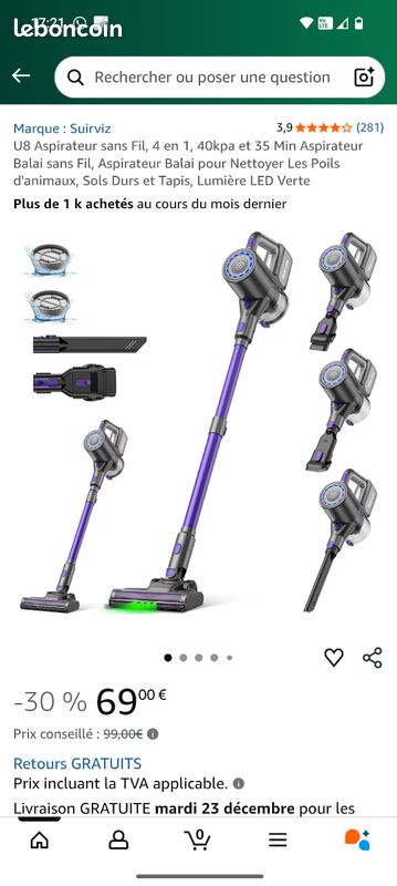Suirviz U8 Aspirateur Balai Sans Fil, 40Kpa Avec 35 MinLumière